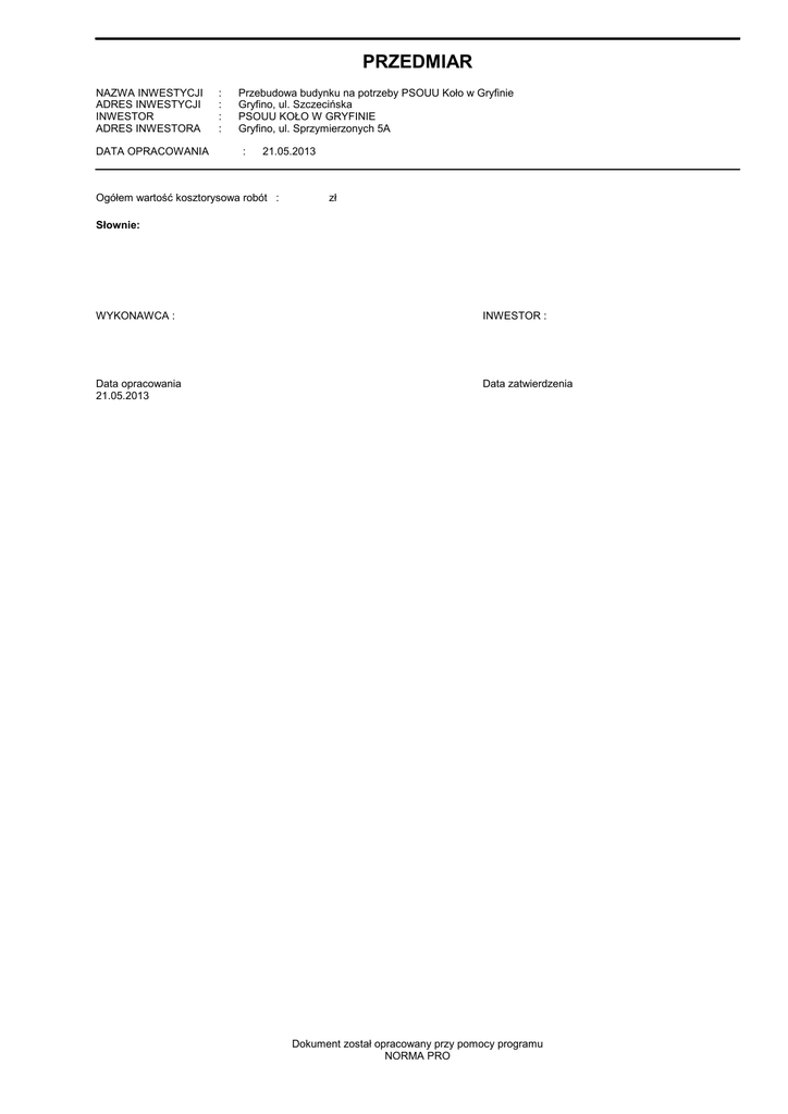 PRZEDMIAR NAZWA INWESTYCJI ADRES INWESTYCJI INWESTOR ADRES INWESTORA DATA OPRACOWANIA : : : : Przebudowa budynku na potrzeby PSOUU Koło w Gryfinie Gryfino, ul. Szczecińska PSOUU KOŁO W GRYFINIE Gryfino, ul. Sprzymierzonych 5A : 21.05.2013 Ogółem wartość kosztorysowa robót : zł Słownie: WYKONAWCA : INWESTOR : Data opracowania 21.05.2013 Data zatwierdzenia Dokument został opracowany przy pomocy programu NORMA PRO Posadzka w piwnicy Lp. Podstawa Opis jm 1 Posadzka w piwnicy 1 KNNR 2 Izolacja z folii polietylenowej pozioma podpod.1 0604-01 1) sadzkowa obmiar = 255.85 m2 1* 2* 3* 2* 3* 3* m2 307.0200 % 4.0000 m-g 2.5585 m2 r-g -- M -płyty styropianowe -STYROPIAN EKSTRUDO- m2 WANY 1.05m2/m2 materiały pomocnicze % 1.5%(od M) -- S -wyciąg 0.0032m-g/m2 5* środek transportowy 0.0047m-g/m2 Razem koszty bezpośrednie: Cena jednostkowa: 3 KNNR 2 Izolacja z folii polietylenowej pozioma podpod.1 0604-01 1) sadzkowa obmiar = 255.85 m2 2* 92.1060 -- R -robocizna 0.0891r-g/m2 4* 1* r-g -- M -folia polietylenowa szeroka gr. 0,2 mm 1.2m2/m2 materiały pomocnicze 4%(od M) -- S -wyciąg 0.01m-g/m2 Razem koszty bezpośrednie: Cena jednostkowa: 2 KNR-W 2- Izolacje cieplne i przeciwdźwiękowe z płyt styd.1 02 0608- ropianowych poziome na wierzchu konstrukcji 03 2) na sucho - jedna warstwa gr. 10cm STYROPIAN EKSTRUDOWANY obmiar = 255.85 m2 1* m2 -- R -robocizna 0.36r-g/m2 4* 1* -- R -robocizna 0.71r-g/m2 2* -- M -cement 25 z dodatkami 0.019t/m2 1.5000 m-g 1.2025 m2 r-g 92.1060 m2 307.0200 % 4.0000 m-g 2.5585 m2 r-g t -2- Norma PRO Wersja 4.33 Nr seryjny: 12436 UŜytkownik: js 268.6425 0.8187 -- M -folia polietylenowa szeroka gr. 0,2 mm 1.2m2/m2 materiały pomocnicze 4%(od M) -- S -wyciąg 0.01m-g/m2 Razem koszty bezpośrednie: Cena jednostkowa: 4 NNRNKB (z.VI) Podkłady betonowe grub. 8 cm wykonyd.1 202 1124- wane przy uŜyciu "Miksokreta" w pomieszcze01 3) niach o pow.do 8 m2 obmiar = 255.85 m2 22.7962 m-g -- R -robocizna 0.36r-g/m2 4* Nakłady 181.6535 4.8612 Koszt jedn. R M S Posadzka w piwnicy Lp. Podstawa 3* 4* 5* Opis jm piasek do betonów zwykły 0.042m3/m2 Ŝwir do betonów zwykłych 0.0577m3/m2 materiały pomocnicze 1.5%(od M) m3 10.7457 m3 14.7625 % 1.5000 m-g 46.0530 -- S -"Miksokret" 28 kW 0.18m-g/m2 Razem koszty bezpośrednie: Cena jednostkowa: 5 NNRNKB (z.VI) Podkłady betonowe wykonywane przy d.1 202 1124- uŜyciu "Miksokreta" w pomieszczeniach o 02 3) pow.do 8 m2 - dod.lub potrącenie za zmianę grub.o 1 cm Krotność = -4 obmiar = 255.85 m2 6* 1* 2* 3* 4* 5* m2 -- R -robocizna 0.08*(-4)=-0.32r-g/m2 -- M -cement 25 z dodatkami 0.0025*(-4)=-0.01t/m2 piasek do betonów zwykły 0.0053*(-4)=-0.0212m3/m2 Ŝwir do betonów zwykłych 0.0072*(-4)=-0.0288m3/m2 materiały pomocnicze 1.5%(od M) -- S -"Miksokret" 28 kW 0.02*(-4)=-0.08m-g/m2 Razem koszty bezpośrednie: Cena jednostkowa: 6 KNR-W 2- Posadzki cementowe wraz z cokolikami - dod.1 02 1116- płata za zbrojenie siatką stalową 07 2) obmiar = 255.85 m2 6* 1* 2* 3* t -2.5585 m3 -5.4240 m3 -7.3685 % 1.5000 -20.4680 r-g 18.9329 m2 260.9670 % 1.5000 m-g 0.2814 m-g 0.4349 -3- Norma PRO Wersja 4.33 Nr seryjny: 12436 UŜytkownik: js -81.8720 m2 -- M -siatka tkana Rabitza 1.02m2/m2 materiały pomocnicze 1.5%(od M) -- S -wyciąg 0.0011m-g/m2 5* środek transportowy 0.0017m-g/m2 Razem koszty bezpośrednie: Cena jednostkowa: r-g m-g -- R -robocizna 0.074r-g/m2 4* Nakłady Koszt jedn. R M S Posadzka w piwnicy PODSUMOWANIE RAZEM Robocizna Materiały Posadzka w piwnicy Sprzęt RAZEM Koszty pośrednie [Kp] RAZEM Zysk [Z] RAZEM Koszty zakupu [kz] RAZEM OGÓŁEM Słownie: -4- Norma PRO Wersja 4.33 Nr seryjny: 12436 UŜytkownik: js Posadzka w piwnicy Lp. Podstawa Opis jm 2 Stolarka okienna w piwnicy 7 KNR 0-19 Wymiana okien skrzynkowych na okna rozwied.2 0930-05 4) rane i uchylno-rozwierane jednodzielne z PCV o pow. do 1.0 m2 obmiar = .76*1*11 = 8.360 m2 1* 2* 3* 4* 5* 6* 7* 8* 9* m2 -- R -robocizna 13.6r-g/m2 -- M -kotwy stalowe 10.18szt/m2 pianka poliuretanowa 0.41dm3/m2 silikon 0.09dm3/m2 gips szpachlowy 3.4kg/m2 mineralna szpachlówka do tynków zewnętrznych 6.12kg/m2 płyty gipsowo-kartonowe gr. 9.5 mm 1.36m2/m2 materiały pomocnicze 1.5%(od M2+M3+M4+M5+M6+M7) okna i drzwi balkonowe z tworzyw 1m2/m2 r-g 113.6960 szt 85.1048 dm3 3.4276 dm3 0.7524 kg 28.4240 kg 51.1632 m2 11.3696 % 1.5000 m2 8.3600 -- S -wyciąg m-g 0.05m-g/m2 11* środek transportowy m-g 0.06m-g/m2 Razem koszty bezpośrednie: Cena jednostkowa: 8 KNR 0-19 Wymiana okien skrzynkowych na okna rozwie- m2 d.2 0930-06 4) rane i uchylno-rozwierane jednodzielne z PCV o pow. do 1.5 m2 obmiar = .84*1.42 1.193 .98*1.42*3 4.175 .91*1.42 1.292 1.05*1.63 1.712 RAZEM 8.372 m2 10* 1* 2* 3* 4* 5* 6* 7* 8* 9* -- R -robocizna 10.46r-g/m2 -- M -kotwy stalowe 6.26szt/m2 pianka poliuretanowa 0.34dm3/m2 silikon 0.07dm3/m2 gips szpachlowy 2.7kg/m2 mineralna szpachlówka do tynków zewnętrznych 4.86kg/m2 płyty gipsowo-kartonowe gr. 9.5 mm 1.08m2/m2 materiały pomocnicze 1.5%(od M2+M3+M4+M5+M6+M7) okna i drzwi balkonowe z tworzyw 1m2/m2 -- S -wyciąg 0.05m-g/m2 11* środek transportowy 0.06m-g/m2 Razem koszty bezpośrednie: Cena jednostkowa: 10* 0.4180 0.5016 r-g 87.5711 szt 52.4087 dm3 2.8465 dm3 0.5860 kg 22.6044 kg 40.6879 m2 9.0418 % 1.5000 m2 8.3720 m-g 0.4186 m-g 0.5023 -5- Norma PRO Wersja 4.33 Nr seryjny: 12436 UŜytkownik: js Nakłady Koszt jedn. R M S Posadzka w piwnicy Lp. PodstaOpis wa 9 KNR 0-19 MontaŜ okien uchylnych jednodzielnych z PCV d.2 1023-03 4) z obróbką obsadzenia o pow. do 1.0 m2 obmiar = .8*.6*2 = 0.960 m2 1* 2* 3* 4* 5* 6* 7* 8* jm r-g 5.2992 szt 8.2560 dm3 0.3936 dm3 0.0864 kg 3.5328 kg 6.3648 % 1.5000 m2 0.9600 -- S -wyciąg m-g 0.05m-g/m2 10* środek transportowy m-g 0.07m-g/m2 Razem koszty bezpośrednie: Cena jednostkowa: 10 KNR-W 2- Obsadzenie podokienników MDF długości po- szt d.2 02 0135- nad 1 m 02 2) obmiar = 17 szt 9* 1* 2* 3* 4* -- R -robocizna 2.12r-g/szt -- S -wyciąg 0.11m-g/szt Razem koszty bezpośrednie: Cena jednostkowa: R M S 0.0480 0.0672 r-g 36.0400 m3 0