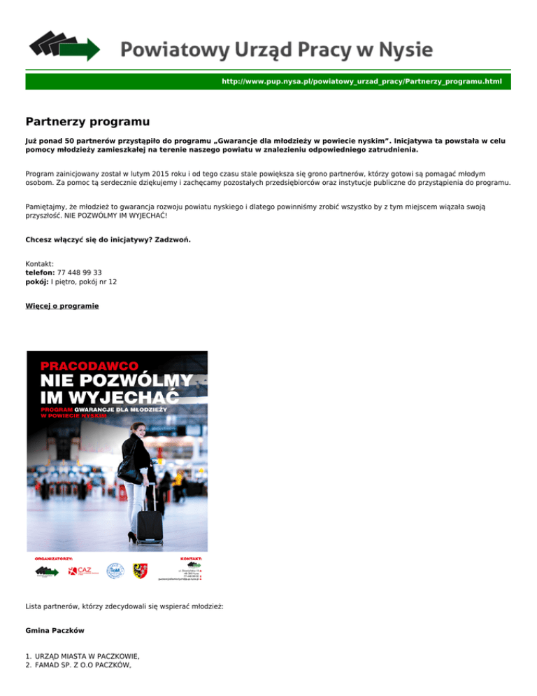 http://www.pup.nysa.pl/powiatowy_urzad_pracy/Partnerzy_programu.html Partnerzy programu Już ponad 50 partnerów przystąpiło do programu „Gwarancje dla młodzieży w powiecie nyskim”. Inicjatywa ta powstała w celu pomocy młodzieży zamieszkałej na terenie naszego powiatu w znalezieniu odpowiedniego zatrudnienia. Program zainicjowany został w lutym 2015 roku i od tego czasu stale powiększa się grono partnerów, którzy gotowi są pomagać młodym osobom. Za pomoc tą serdecznie dziękujemy i zachęcamy pozostałych przedsiębiorców oraz instytucje publiczne do przystąpienia do programu. Pamiętajmy, że młodzież to gwarancja rozwoju powiatu nyskiego i dlatego powinniśmy zrobić wszystko by z tym miejscem wiązała swoją przyszłość. NIE POZWÓLMY IM WYJECHAĆ! Chcesz włączyć się do inicjatywy? Zadzwoń. Kontakt: telefon: 77 448 99 33 pokój: I piętro, pokój nr 12 Więcej o programie Lista partnerów, którzy zdecydowali się wspierać młodzież: Gmina Paczków 1. URZĄD MIASTA W PACZKOWIE, 2. FAMAD SP. Z O.O PACZKÓW, 3. 4. 5. 6. 7. 8. PHU MALUCH MAŁGORZATA, SKLEP BR. OGÓLNO PRZEMYSŁOWEJ S. JANOWCZYK, MIGRA SP.J., AUTO CZĘSĆI MAREK SKOTNICKI, FHU LUIZA SZLOSEK, PW EWAN. Gmina Nysa 1. URZĄD MIASTA W NYSIE 2. NYSKA ENERGRTYKA CIEPLNA SP. Z O.O. 3. WIK „AKWA” NYSA 4. MAGMOD NYSA 5. PGK EKOM SP. Z O.O. W NYSIE 6. BIURO PODRÓŻY NYSA TOUR 7. ROLTECH NYSA 8. CUKRY NYSKIE 9. ARKA SP.K. 10. NETPULS 11. FRANZ KAMIŃSKI WAGGONBAU POLSKA SP. Z O.O. Gminy Otmuchów i Kamiennik 1. URZĄD MIASTA W OTMUCHOWIE 2. ZPU MIKROMEX 3. PRZEDSIĘBIORSTWO TRANSPORTOWO USŁUGOWE KAZIMIERZ KENDIK 4. DACH-ROT 5. FOL 6. STOWARZYSZENIE NA RZECZ ROZWOJU WSI LIGOTA WIELKA 7. PHU ROS II OKRĘGOWA STACJA KONTROLI POJAZDÓW 8. OŚRODEK POMOCY SPOŁECZNEJ W OTMUCHOWIE 9. GOSPODARSTWO KOMUNALNE W OTMUCHOWIE 10. SPÓŁDZIELNIA MIESZKANIOWA W OTMUCHOWIE 11. ZESPÓŁ SZKÓŁ W OTMUCHOWIE 12. PRZEDSIĘBIORSTWO WODOCIĄGÓW I KANAIZACJI SP. Z O.O. 13. BANK SPÓŁDZIELCZY W OTMUCHOWIE 14. MIEJSKO-GMINNY DOM KULTURY W OTMUCHOWIE 15. ZPH HURT-DETAL PIEKARNIA SIEPRAKOWSKI JÓZEF 16. ZAKŁAD REKLAMOWY ZNAKI.PL KRZYSZTOF GABORY 17. CENTRUM USŁUG HOTELOWO-TURYSTYCZNYCH „ZAMEK” SP. Z O.O. 18. FOTOGRAFIKA PROFESJONALNA PAWEŁ PIERZAK 19. SZKOŁĄ PODSTAWOWA W OTMUCHOWIE 20. ZESPÓŁ OBSŁUGI SZKOLENICTWA W OTMUCHOWIE Gmina Głuchołazy 1. 2. 3. 4. 5. 6. 7. Urząd Miasta w Głuchołazach KMK MARMUR-GRANIT SP.J. - Gierałcice PARTNER SP. Z O.O. - Głuchołazy, ul. Kopernika 1, STALMET Z.U.H.P S.C. - Głuchołazy, ul. Kraszewskiego 42 GŁUCHOŁASKIE ZAKŁADY PAPIERNICZE SP. Z O.O.- Głuchołazy, ul. Gen. Andersa 32 EVENTI - Głuchołazy, ul. Ligonia 10 a BP „OPAWY”- Głuchołazy,ul. S. Wyszyńskiego 4 Gminy Korfantów i Łambinowice 1. 2. 3. 4. 5. 6. 7. 8. 9. Urząd Miasta w Korfantowie Urząd Miasta w Łambinowicach Koło Bielickie Towarzystwo Pomocy im. św. Brata Alberta Bielice Usługi Leśne AD-KAM Ścinawa Nyska CELPA S.A. Łambinowice Gabinet Stomatologiczny „MADEJDENT” Łambinowice CertificationStandards Łambinowice Zakład stolarski SCHODEK Korfatntów ZAKŁAD ORTOPEDYCZNY HUTNIK Korfatnów.