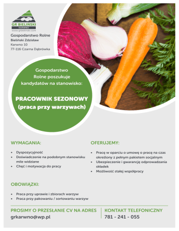 Gospodarstwo Rolne Bieliński Zdzisław Karwno 10 77-116 Czarna Dąbrówka Gospodarstwo Rolne poszukuje kandydatów na stanowisko: PRACOWNIK SEZONOWY (praca przy warzywach) WYMAGANIA: OFERUJEMY: • Dyspozycyjność • Doświadczenie na podobnym stanowisku mile widziane • Chęć i motywacja do pracy • Pracę w oparciu o umowę o pracę na czas określony z pełnym pakietem socjalnym • Ubezpieczenie i gwarancję odprowadzania składek • Możliwość stałej współpracy OBOWIĄZKI: • Praca przy uprawie i zbiorach warzyw • Praca przy pakowaniu / sortowaniu warzyw PROSIMY O PRZESŁANIE CV NA ADRES KONTAKT TELEFONICZNY [email protected] 781 - 241 - 055