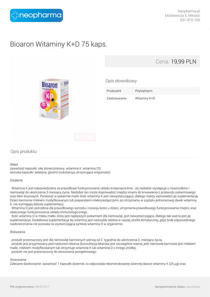 Neopharma.pl Mickiewicza 5, Mikstat 531-470-109 Bioaron Witaminy K+D 75 kaps. Cena: 19,99 PLN Opis słownikowy Producent Phytopharm Zastosowanie Witaminy K+D Opis produktu Skład zawartość kapsułki: olej słonecznikowy, witamina K, witamina D3; otoczka kapsułki: żelatyna, glicerol (substancja utrzymująca wilgotność). Działanie Witamina K jest odpowiedzialna za prawidłowe funkcjonowanie układu krzepnięcia krwi. Jej niedobór występuje u noworodków i niemowląt do ukończenia 3 miesiąca życia. Niedobór ten może doprowadzić między innymi do krwawienia z przewodu pokarmowego oraz błon śluzowych. Ponieważ w pokarmie matki ilość witaminy K jest niewystarczająca, dlatego należy wprowadzić jej suplementację. Dzieci karmione mlekiem modyfikowanym lub preparatami mlekozastępczymi, po otrzymaniu w szpitalu jednorazowej dawki witaminy K, nie wymagają dalszej suplementacji. Witamina D jest potrzebna dla prawidłowego wzrostu i rozwoju kości u dzieci, utrzymania prawidłowego funkcjonowania mięśni, oraz właściwego funkcjonowania układu immunologicznego. Ilość witaminy D w mleku matki, który jest najlepszym pokarmem dla niemowląt, jest niewystarczająca, dlatego tak ważna jest jej suplementacja. Dodatkowa suplementacja tej witaminy jest niezwykle istotna w naszej strefie klimatycznej, gdyż brak odpowiedniego nasłonecznienia nie pozwala na wystarczającą syntezę witaminy D w organizmie. Wskazania produkt przeznaczony jest dla niemowląt karmionych piersią od 2. tygodnia do ukończenia 3. miesiąca życia, produkt jest przyjmowany pod nadzorem lekarza (konsultacja lekarska jest szczególnie ważna, jeśli niemowlę karmione jest mlekiem matki, mlekiem modyfikowanym lub otrzymuje witaminę K lub witaminę D z innego źródła), produkt nie jest przeznaczony do stosowania pozajelitowego. Stosowanie Zalecane dawkowanie: zawartość 1 kapsułki dziennie, co odpowiada rekomendowanej dziennej dawce witaminy K (25 μg) oraz Plik wygenerowano: 08-03-2017 Oprogramowanie sklepu: AptusShop Neopharma.pl Mickiewicza 5, Mikstat 531-470-109 rekomendowanej dziennej dawce witaminy D (10 μg = 400 j.m) Dzienna dawka witaminy D oraz witaminy K znajduje się w jednej kapsułce twist-off , która może być podawana niemowlętom karmionym piersią od 2. tygodnia do ukończenia 3. miesiąca życia. Przeciwwskazania Nadwrażliwość na jakikolwiek składnik produktu. Plik wygenerowano: 08-03-2017 Powered by TCPDF (www.tcpdf.org) Oprogramowanie sklepu: AptusShop
