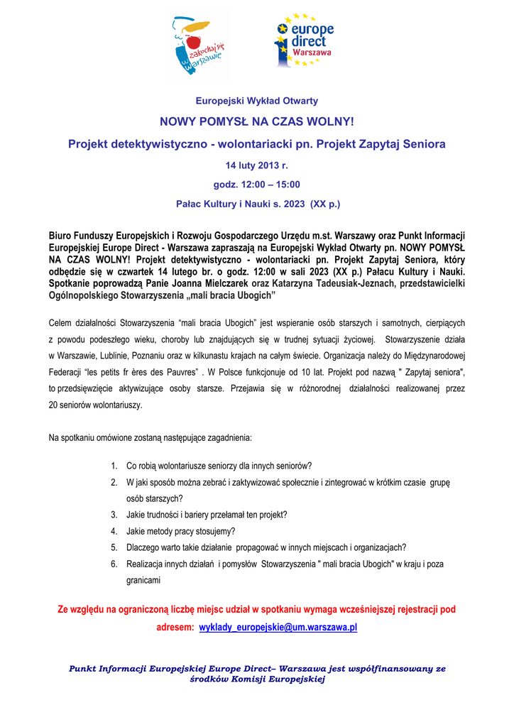 Europejski Wykład Otwarty NOWY POMYSŁ NA CZAS WOLNY! Projekt detektywistyczno - wolontariacki pn. Projekt Zapytaj Seniora 14 luty 2013 r. godz. 12:00 – 15:00 Pałac Kultury i Nauki s. 2023 (XX p.) Biuro Funduszy Europejskich i Rozwoju Gospodarczego Urzędu m.st. Warszawy oraz Punkt Informacji Europejskiej Europe Direct - Warszawa zapraszają na Europejski Wykład Otwarty pn. NOWY POMYSŁ NA CZAS WOLNY! Projekt detektywistyczno - wolontariacki pn. Projekt Zapytaj Seniora, który odbędzie się w czwartek 14 lutego br. o godz. 12:00 w sali 2023 (XX p.) Pałacu Kultury i Nauki. Spotkanie poprowadzą Panie Joanna Mielczarek oraz Katarzyna Tadeusiak-Jeznach, przedstawicielki Ogólnopolskiego Stowarzyszenia „mali bracia Ubogich” Celem działalności Stowarzyszenia “mali bracia Ubogich” jest wspieranie osób starszych i samotnych, cierpiących z powodu podeszłego wieku, choroby lub znajdujących się w trudnej sytuacji życiowej. Stowarzyszenie działa w Warszawie, Lublinie, Poznaniu oraz w kilkunastu krajach na całym świecie. Organizacja należy do Międzynarodowej Federacji “les petits fr ères des Pauvres” . W Polsce funkcjonuje od 10 lat. Projekt pod nazwą " Zapytaj seniora", to przedsięwzięcie aktywizujące osoby starsze. Przejawia się w różnorodnej działalności realizowanej przez 20 seniorów wolontariuszy. Na spotkaniu omówione zostaną następujące zagadnienia: 1. Co robią wolontariusze seniorzy dla innych seniorów? 2. W jaki sposób można zebrać i zaktywizować społecznie i zintegrować w krótkim czasie grupę osób starszych? 3. Jakie trudności i bariery przełamał ten projekt? 4. Jakie metody pracy stosujemy? 5. Dlaczego warto takie działanie propagować w innych miejscach i organizacjach? 6. Realizacja innych działań i pomysłów Stowarzyszenia " mali bracia Ubogich" w kraju i poza granicami Ze względu na ograniczoną liczbę miejsc udział w spotkaniu wymaga wcześniejszej rejestracji pod adresem: [email protected] Punkt Informacji Europejskiej Europe Direct– Warszawa jest współfinansowany ze środków Komisji Europejskiej