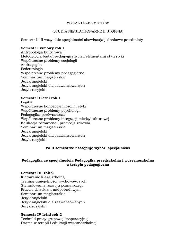 WYKAZ PRZEDMIOTÓW (STUDIA NIESTACJONARNE II STOPNIA) Semestr I i II wszystkie specjalności obowiązują jednakowe przedmioty Semestr I zimowy rok 1 Antropologia kulturowa Metodologia badań pedagogicznych z elementami statystyki Współczesne problemy socjologii Andragogika Pedeutologia Współczesne problemy pedagogiczne Seminarium magisterskie Język angielski Język angielski dla zaawansowanych Język rosyjski Semestr II letni rok 1 Logika Współczesne koncepcje filozofii i etyki Współczesne problemy psychologii Pedagogika porównawcza Współczesne problemy integracji międzykulturowej Edukacja zdrowotna i promocja zdrowia Seminarium magisterskie Język angielski Język angielski dla zaawansowanych Język rosyjski Po II semestrze następuję wybór specjalności Pedagogika ze specjalnością Pedagogika przedszkolna i wczesnoszkolna z terapią pedagogiczną Semestr III rok 2 Kierowanie klasą szkolną Trening umiejętności wychowawczych Stymulowanie rozwoju poznawczego Praca z dzieckiem nadpobudliwym Seminarium magisterskie Język angielski Język angielski dla zaawansowanych Język rosyjski Semestr IV letni rok 2 Techniki pracy grupowej kooperacyjnej Drama w terapii i edukacji wczesnoszkolnej Seminarium magisterskie Język angielski Język angielski dla zaawansowanych Język rosyjski Pedagogika ze specjalnością Pedagogika przedszkolna i wczesnoszkolna z językiem angielskim Semestr III zimowy rok 2 Dziecko zdolne w grupie Niepowodzenia szkolne i środki zaradcze Stymulowanie rozwoju poznawczego Seminarium magisterskie Język angielski Język angielski dla zaawansowanych Język rosyjski Semestr IV letni rok 2 Trening umiejętności wychowawczych Współpraca przedszkola i szkoły z rodzicami Wybrane techniki pracy z dziećmi na lekcjach języka angielskiego British study American study Conversation Seminarium magisterskie Język angielski Język angielski dla zaawansowanych Język rosyjski Pedagogika ze specjalnością Pedagogika przedszkolna i wczesnoszkolna Semestr III zimowy rok 2 Dziecko zdolne w grupie Niepowodzenia szkolne i środki zaradcze Stymulowanie rozwoju poznawczego Seminarium magisterskie Język angielski Język angielski dla zaawansowanych Język rosyjski Semestr IV letni rok 2 Dojrzałość szkolna Drama w zajęciach z dziećmi Seminarium magisterskie Język angielski Język angielski dla zaawansowanych Język rosyjski Pedagogika opiekuńczo wychowawcza z terapią pedagogiczną Semestr III zimowy rok 2 Drama w zajęciach świetlicowych Terapia rodziny Praca nauczyciela z klasami integracyjnymi Praca z dziećmi i młodzieżą w placówkach opiekuńczych Seminarium magisterskie Język angielski Język angielski dla zaawansowanych Język rosyjski Semestr IV letni rok 2 Terapia rodziny Współpraca pedagoga z radą pedagogiczną i placówkami terapii pedagogiczno – psychologicznej Seminarium magisterskie Język angielski Język angielski dla zaawansowanych Język rosyjski Pedagogika opiekuńczo-wychowawcza z ustawodawstwem rodzinnym Semestr III zimowy rok 2 Drama w zajęciach świetlicowych Terapia rodziny Samorząd terytorialny w systemie pomocy społecznej Seminarium magisterskie Język angielski Język angielski dla zaawansowanych Język rosyjski Semestr IV letni rok 2 Terapia rodziny Praca nauczyciela z klasami integracyjnymi Pomoc społeczna rodzinie Seminarium magisterskie Język angielski Język angielski dla zaawansowanych Język rosyjski Pedagogika ze specjalnością Pedagogika kulturoznawczamenadżer i animator kultury Semestr III zimowy rok 2 Kreowanie wizerunku kultury Media w edukacji i kulturze Sztuka XXIw. Aksjologia sztuki współczesnej Sztuka przemawiania negocjowania mediowanie Ustawodawstwo w kulturze Etykieta menadżera i animatora kultury Funkcjonowanie wybranych instytucji kultury. Studia przypadków Seminarium magisterskie Język angielski Język angielski dla zaawansowanych Język rosyjski Semestr IV letni rok 2 Historia kultury europejskiej Wiedza o teatrze z metodyką Film w kulturze światowej Problemy kultury muzycznej Malarstwo w kulturze Organizowanie imprez i przedsięwzięć kulturalnych Ochrona dóbr kultury Seminarium magisterskie Język angielski Język angielski dla zaawansowanych Język rosyjski Pedagogika ze specjalnością Pedagogika pracy z zarządzaniem i marketingiem Semestr III zimowy rok 2 Pedagogika zarządzania Zarządzanie projektami europejskimi Standardy kwalifikacji zawodowych Język angielski Język angielski dla zaawansowanych Język rosyjski Seminarium magisterskie Semestr IV letni rok 2 Zarządzanie zasobami ludzkimi Podstawy teoretyczne pedagogiki pracy Język angielski Język angielski dla zaawansowanych Język rosyjski Seminarium magisterskie Pedagogika ze specjalnością Pedagogika z fotografią artystyczną Wykaz przedmiotów specjalnościowych zostanie zamieszczony we wtorek. Informujemy, że lektoraty z języka obcego trwają przez cały okres studiów II stopnia. Na wniosek studentów możemy utworzyć lektorat z języka niemieckiego oraz francuskiego. Lektorat zostanie utworzony gdy zgłosi się grupa 15 osobowa. Seminarium magisterskie rozpoczyna się na 1 semestrze. Regulamin praktyk studenckich zostanie podany przed rozpoczęciem pierwszego zjazdu Uczelnia zastrzega sobie możliwość wprowadzenia zmian w powyższym wykazie.