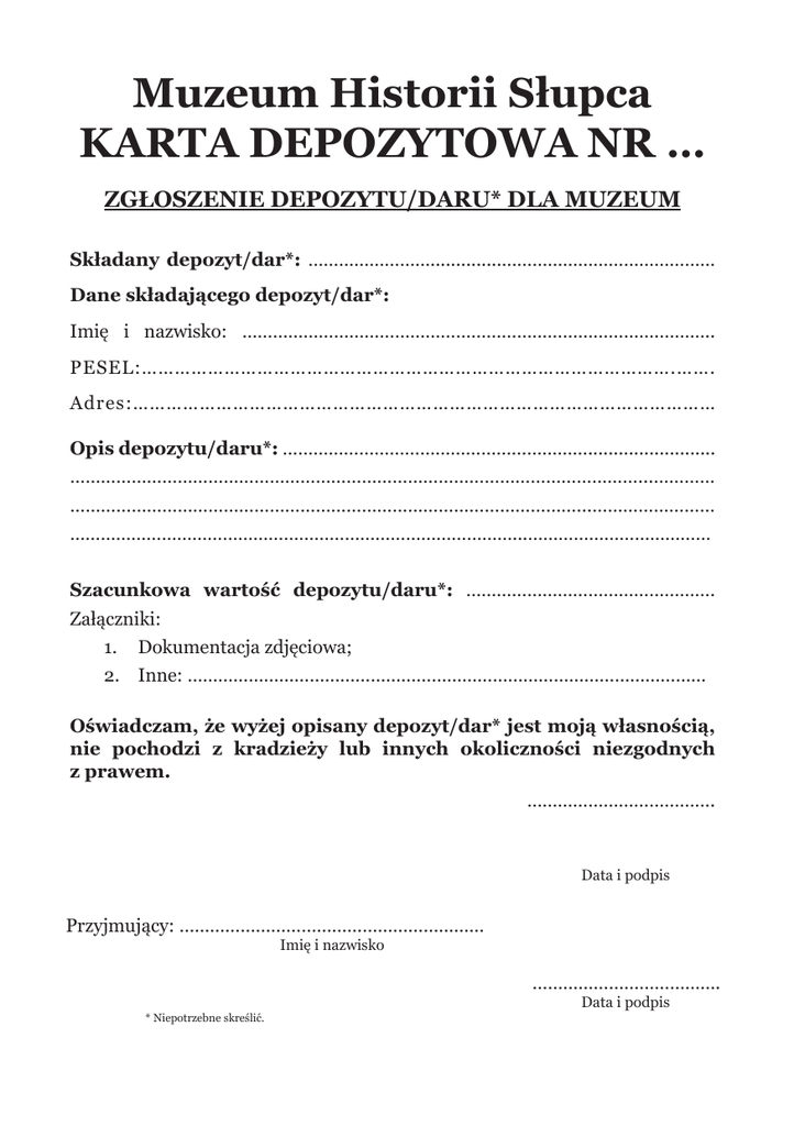 Muzeum Historii Słupca KARTA DEPOZYTOWA NR … ZGŁOSZENIE DEPOZYTU/DARU* DLA MUZEUM Składany depozyt/dar*: ……………………..............…………………………………… Dane składającego depozyt/dar*: Imię i nazwisko: ……………………………………………………………………….……….. PESEL:…………………………………………………………………………………….……. Adres:…………………………………………………………………………………………… Opis depozytu/daru*: ……………………………………………………......................... …………………………………………………………………………………………………...………… ………………………………………………………………………………………...…………………… ……………………………………………………………………………...……………………………… Szacunkowa wartość depozytu/daru*: …………………………………………. Załączniki: 1. Dokumentacja zdjęciowa; 2. Inne: ………………………………………………………………………………………… Oświadczam, że wyżej opisany depozyt/dar* jest moją własnością, nie pochodzi z kradzieży lub innych okoliczności niezgodnych z prawem. ………………………………. Data i podpis Przyjmujący: …………………………………………………… Imię i nazwisko ………………………………. * Niepotrzebne skreślić. Data i podpis