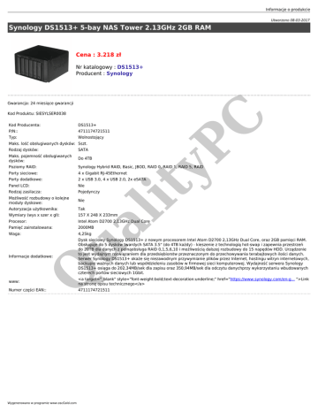 Informacje o produkcie Utworzono 08-03-2017 Synology DS1513+ 5-bay NAS Tower 2.13GHz 2GB RAM Cena : 3.218 zł Nr katalogowy : DS1513+ Producent : Synology Gwarancja: 24 miesiące gwarancji DS1513+ P/N:: 4711174721511 Typ: Wolnostojący Maks. lość obsługiwanych dysków: 5szt. yP Kod Producenta: C Kod Produktu: SIESYLSER0038 SATA Maks. pojemność obsługiwanych dysków: Do 4TB Poziomy RAID: Synology Hybrid RAID, Basic, JBOD, RAID 0, RAID 1, RAID 5, RAID Porty sieciowe: 4 x Gigabit RJ-45Ethernet Porty dodatkowe: 2 x USB 3.0, 4 x USB 2.0, 2x eSATA Panel LCD: Nie Rodzaj zasilacza: ua lit Rodzaj dysków: Pojedynczy Możliwość rozbudowy o kolejne moduły dyskowe: Nie Autoryzacja użytkownika: Tak Wymiary (wys x szer x gł): 157 X 248 X 233mm Procesor: Intel Atom D2700 2,13GHz Dual Core Pamięć zainstalowana: Waga: 4,25kg Dysk sieciowy Synology DS1513+ z nowym procesorem Intel Atom D2700 2,13GHz Dual Core, oraz 2GB pamięci RAM. Obsługuje do 5 dysków twardych SATA 3.5" (do 4TB każdy) - kieszenie z technologią hot-swap i zapewnia przestrzeń do 20TB dla danych z pełnąobsługa RAID 0,1,5,6,10 i możliwością dalszej rozbudowy do 15 napędów HDD. Urządzenie to jest wydajnym rozwiązaniem dla przedsiębiorstw przeznaczonym do przechowywania terabajtowych ilości danych. Serwer Synology DS1513+ okaże się niezawodnym przywymianie plików przez Internet, hostingu witryn internetowych, backupie ważnych danych lub współdzieleniu zasobów w firmowej sieci komputerowej. Wydajność serwera Synology DS1513+ osiąga do 202,34MB/sek dla zapisu oraz 350,94MB/sek dla odczytu danychprzy wykorzystaniu wbudowanych czterech portów sieciowych 1Gbit. Q Informacje dodatkowe: www: 2000MB Numer części EAN:: Wygenerowano w programie www.oscGold.com <a target="_blank" style="font-weight:bold;text-decoration:underline;" href="https://www.synology.com/en-g... ">Link na stronę opisu technicznego</a> 4711174721511