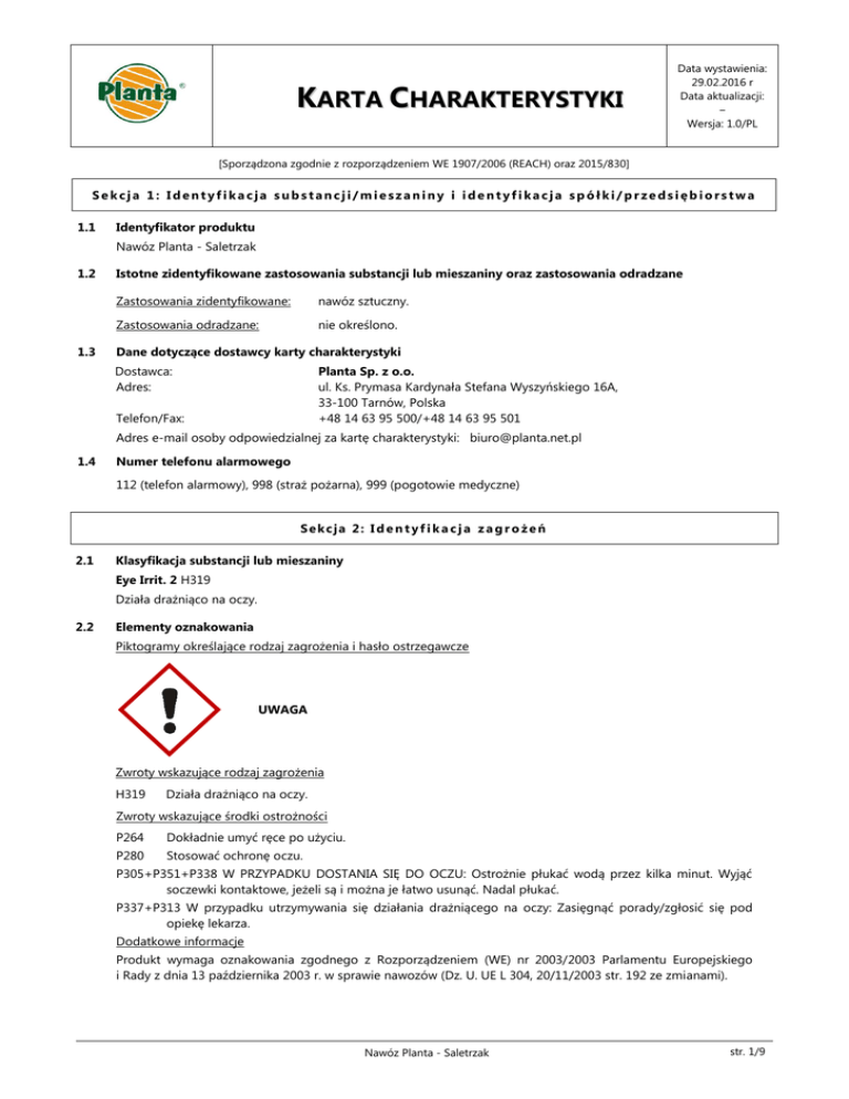 KARTA CHARAKTERYSTYKI Data wystawienia: 29.02.2016 r Data aktualizacji: − Wersja: 1.0/PL [Sporządzona zgodnie z rozporządzeniem WE 1907/2006 (REACH) oraz 2015/830] Sekcja 1: Identyfikacja substancji/mieszaniny i identyfikacja spółki/przedsiębiorstwa 1.1 Identyfikator produktu Nawóz Planta - Saletrzak 1.2 1.3 Istotne zidentyfikowane zastosowania substancji lub mieszaniny oraz zastosowania odradzane Zastosowania zidentyfikowane: nawóz sztuczny. Zastosowania odradzane: nie określono. Dane dotyczące dostawcy karty charakterystyki Dostawca: Adres: Planta Sp. z o.o. ul. Ks. Prymasa Kardynała Stefana Wyszyńskiego 16A, 33-100 Tarnów, Polska +48 14 63 95 500/+48 14 63 95 501 Telefon/Fax: Adres e-mail osoby odpowiedzialnej za kartę charakterystyki: [email protected] 1.4 Numer telefonu alarmowego 112 (telefon alarmowy), 998 (straż pożarna), 999 (pogotowie medyczne) Sekcja 2: I d e n t y f i k a c j a z a g r o ż e ń 2.1 Klasyfikacja substancji lub mieszaniny Eye Irrit. 2 H319 Działa drażniąco na oczy. 2.2 Elementy oznakowania Piktogramy określające rodzaj zagrożenia i hasło ostrzegawcze UWAGA Zwroty wskazujące rodzaj zagrożenia H319 Działa drażniąco na oczy. Zwroty wskazujące środki ostrożności P264 Dokładnie umyć ręce po użyciu. P280 Stosować ochronę oczu. P305+P351+P338 W PRZYPADKU DOSTANIA SIĘ DO OCZU: Ostrożnie płukać wodą przez kilka minut. Wyjąć soczewki kontaktowe, jeżeli są i można je łatwo usunąć. Nadal płukać. P337+P313 W przypadku utrzymywania się działania drażniącego na oczy: Zasięgnąć porady/zgłosić się pod opiekę lekarza. Dodatkowe informacje Produkt wymaga oznakowania zgodnego z Rozporządzeniem (WE) nr 2003/2003 Parlamentu Europejskiego i Rady z dnia 13 października 2003 r. w sprawie nawozów (Dz. U. UE L 304, 20/11/2003 str. 192 ze zmianami). Nawóz Planta - Saletrzak str. 1/9 KARTA CHARAKTERYSTYKI 2.3 Data wystawienia: 29.02.2016 r Data aktualizacji: − Wersja: 1.0/PL Inne zagrożenia Komponenty mieszaniny nie spełniają kryteriów PBT lub vPvB zgodnie z załącznikiem XIII do REACH. Nie dopuszczać do przedostania się substancji do wód powierzchniowych i gruntowych. W dużych stężeniach substancja powoduje wtórną eutrofizację zbiorników wodnych - szybki wzrost glonów i spadek zawartości tlenu w wodach. Sekcja 3: 3.1 Substancje Nie dotyczy. 3.2 Mieszaniny Skład/informacja o składnikach azotan amonowy Zakres stężeń: 77,14-80% Numer CAS: 6484-52-2 Numer WE: 229-347-8 Numer indeksowy: - Numer rejestracji właściwej: 01-2119490981-27-XXXX Klasyfikacja: Ox. Sol. 3 H272, Eye Irrit. 2 H319 Specyficzne stężenia graniczne: Eye Irrit. 2: 80% < C ≤ 100% Dodatkowo w skład produktu wchodzi dolomit w stężeniu 19,50-22,66%. Pełen tekst zwrotów H przytoczony został w sekcji 16 karty. Sekcja 4: 4.1 Środki pierwszej pomocy Opis środków pierwszej pomocy W kontakcie ze skórą: skonsultować się z lekarzem w przypadku wystąpienia niepokojących objawów. Zdjąć zanieczyszczoną odzież. Narażone partie skóry zmyć dokładnie wodą z mydłem. W kontakcie z oczami: skonsultować się z lekarzem w przypadku wystąpienia niepokojących objawów. Chronić niepodrażnione oko, wyjąć szkła kontaktowe. Zanieczyszczone oczy przepłukiwać dokładnie wodą przez 10-15 min. Unikać silnego strumienia wody - ryzyko uszkodzenia rogówki. W przypadku spożycia: wezwać lekarza, pokazać opakowanie lub etykietę. Wypłukać usta wodą. Nigdy nie podawać niczego do ust osobie nieprzytomnej. Nie wywoływać wymiotów. Po narażeniu drogą oddechową: skonsultować się z lekarzem w razie wystąpienia niepokojących dolegliwości. Wyprowadzić poszkodowanego na świeże powietrze, zapewnić ciepło i spokój. 4.2 Najważniejsze ostre i opóźnione objawy oraz skutki narażenia W kontakcie ze skórą: długotrwały kontakt może powodować zaczerwienienie, wysuszenie skóry. W kontakcie z oczami: zaczerwienienie, łzawienie, pieczenie, podrażnienie. Po połknięciu: możliwe bóle brzucha, nudności i wymioty. Po inhalacji: wdychanie pyłów produktu może powodować chwilowe podrażnienie dróg oddechowych. 4.3 Wskazania dotyczące wszelkiej natychmiastowej pomocy lekarskiej i szczególnego postępowania z poszkodowanym Decyzję o sposobie postępowania ratunkowego podejmuje lekarz po dokładnej ocenie stanu poszkodowanego. Osoby narażone na działanie produktu pozostawić pod opieką lekarską przez 48 h (możliwość wystąpienia objawów z opóźnieniem). Nawóz Planta - Saletrzak str. 2/9 KARTA CHARAKTERYSTYKI Sekcja 5: 5.1 Data wystawienia: 29.02.2016 r Data aktualizacji: − Wersja: 1.0/PL Postępowanie w przypadku pożaru Środki gaśnicze Odpowiednie środki gaśnicze: rozproszony strumień wody. Niewłaściwe środki gaśnicze: zwarty strumień wody – niebezpieczeństwo rozprzestrzenienia pożaru. 5.2 Szczególne zagrożenia związane z substancją lub mieszaniną Podczas spalania mogą tworzyć się toksyczne spaliny zawierające tlenki węgla, tlenki azotu, amoniak, aminy oraz inne niezidentyfikowane produkty rozkładu. Unikać wdychania produktów spalania, mogą stwarzać zagrożenie dla zdrowia. Pojemniki narażone na działanie ognia mogą eksplodować. 5.3 Informacje dla straży pożarnej Środki ochrony ogólnej typowe w przypadku pożaru. Nie należy przebywać w zagrożonej ogniem strefie bez odpowiedniego ubrania odpornego na chemikalia i aparatu do oddychania z niezależnym obiegiem powietrza. Zagrożone ogniem pojemniki chłodzić z bezpiecznej odległości rozpylonym strumieniem wody. Zbierać zużyte środki gaśnicze. Produkt niepalny, ale zawiera składniki utleniające – podtrzymujące palenie. Sekcja 6: P o s t ę p o w a n i e w p r z yp a d k u n i e z a m i e r z o ne g o u w o l n i e n i a d o ś r o d o w i s k a 6.1 Indywidualne środki ostrożności, sprzęt ochronny i procedury w sytuacjach awaryjnych Dla osób nienależących do personelu likwidującego skutki awarii: