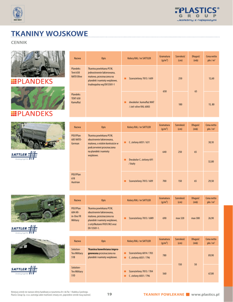 TKANINY WOJSKOWE CENNIK Nazwa Opis Kolory RAL / nr SATTLER Plandeks Tent 650 NATO Olive Tkanina powlekana PCW, jednostronnie lakierowana, matowa, przeznaczona na plandeki i namioty wojskowe, trudnopalna wg EN13501-1 Gramatura (g/m²) Szarozielony 7013 / 609 Szerokość (cm) 250 650 Plandeks TENT 650 Kamuflaż dwukolor: kamuflaż MAT Opis Kolory RAL / nr SATTLER POLYPlan 685 NATOGerman Tkanina powlekana PCW, obustronnie lakierowana, matowa, o niskim kontraście w podczerwieni przeznaczona na plandeki i namioty wojskowe. Gramatura (g/m²) 65 Szerokość (cm) 15, 80 Długość (mb) C. zielony 6031 / 631 Cena netto pln / m2 30,10 640 250 65 Dwukolor C. zielony 691 / biały POLYPlan 618 Austrian Cena netto pln / m2 12,60 180 / ziel-olive RAL 6003 Nazwa Długość (mb) 32,80 Szarozielony 7013 / 609 700 150 65 29,50 Opis Kolory RAL / nr SATTLER Gramatura (g/m²) Szerokość (cm) Długość (mb) Cena netto pln / m2 Tkanina powlekana PCW, obustronnie lakierowana, matowa, przeznaczona na plandeki i namioty wojskowe, z cetyfikatami FR B1/M2 oraz EN 13501-1. Szarozielony 7013 / 6M9 690 max 320 max 300 26,90 Nazwa Opis Kolory RAL / nr SATTLER Gramatura (g/m²) Szerokość (cm) Długość (mb) Cena netto pln / m2 SolutionTex Military 51B Tkanina bawełniana impregnowana przeznaczona na plandeki i namioty wojskowe. Szarozielony 6014 / 783 Nazwa POLYPlan 684 Allin-One FR Military C. zielony 6031 / 796 780 89,90 150 SolutionTex Military 51D Niniejszy cennik nie stanowi oferty handlowej w rozumieniu Art. 66 Par. 1 Kodeksu Cywilnego. Plastics Group Sp. z o.o. zastrzega sobie możliwość zmiany cen, poprzednie cenniki tracą ważność. Szarozielony 7013 / 784 C. zielony 6031 / 796 19 560 TKANINY POWLEKANE 50 67,00 www.plastics.pl