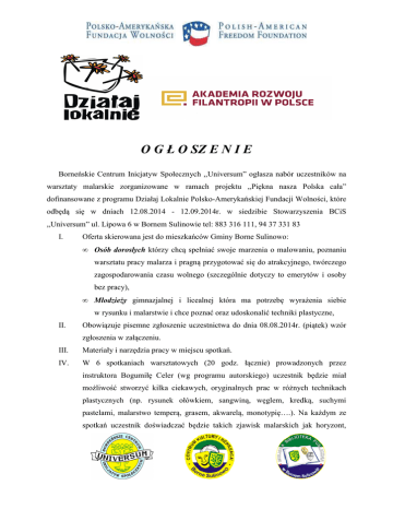 O G Ł O SZ E N I E Borneńskie Centrum Inicjatyw Społecznych ,,Universum” ogłasza nabór uczestników na warsztaty malarskie zorganizowane w ramach projektu ,,Piękna nasza Polska cała” dofinansowane z programu Działaj Lokalnie Polsko-Amerykańskiej Fundacji Wolności, które odbędą się w dniach 12.08.2014 - 12.09.2014r. w siedzibie Stowarzyszenia BCiS ,,Universum” ul. Lipowa 6 w Bornem Sulinowie tel: 883 316 111, 94 37 331 83 I. Oferta skierowana jest do mieszkańców Gminy Borne Sulinowo: • Osób dorosłych którzy chcą spełniać swoje marzenia o malowaniu, poznaniu warsztatu pracy malarza i pragną przygotować się do atrakcyjnego, twórczego zagospodarowania czasu wolnego (szczególnie dotyczy to emerytów i osoby bez pracy), • Młodzieży gimnazjalnej i licealnej która ma potrzebę wyrażenia siebie w rysunku i malarstwie i chce poznać oraz udoskonalić techniki plastyczne, II. Obowiązuje pisemne zgłoszenie uczestnictwa do dnia 08.08.2014r. (piątek) wzór zgłoszenia w załączeniu. III. Materiały i narzędzia pracy w miejscu spotkań. IV. W 6 spotkaniach warsztatowych (20 godz. łącznie) prowadzonych przez instruktora Bogumiłę Celer (wg programu autorskiego) uczestnik będzie miał możliwość stworzyć kilka ciekawych, oryginalnych prac w różnych technikach plastycznych (np. rysunek ołówkiem, sangwiną, węglem, kredką, suchymi pastelami, malarstwo temperą, grasem, akwarelą, monotypię….). Na każdym ze spotkań uczestnik doświadczać będzie takich zjawisk malarskich jak horyzont, perspektywa, kontrast czy kolor (podstawowe pojęcia dla zrozumienia sztuki). Będzie też okazja nauczyć się obserwacji, skupienia uwagi, refleksji co w połączeniu z warsztatem pracy daje podstawę do tworzenia własnej wypowiedzi plastycznej. Prowadzący warsztaty zapewnia, że jeśli uczestnik lubi malować lub zawsze o tym marzył to zajęcia warsztatowe pomogą mu nabrać pewności siebie, odkryje swój potencjał twórczy, kreatywność a poznanie i doskonalenie warsztatu będzie atrakcyjną próbą ,,zabawy twórczej”. Radość tworzenia sprawia, że uczymy się najtrudniejszej sztuki – SZTUKI ŻYCIA. Uczestnik zobowiązany jest wnieść na spotkania chęć pracy twórczej i dobry humor (doświadczenie nie ma tu większego znaczenia). V. Ilość miejsc ograniczona - 15 /zapisy wg kolejności zgłoszeń/. Zgłoszenia pisemne wg wzoru: • Imię i nazwisko: ……………………………( Osoby niepełnoletnie imię i nazwisko opiekuna) • Wiek:……………………………………….. • Adres zamieszkania………………………… • Telefon …………………………………….. Do zobaczenia na spotkaniu organizacyjnym dnia 12.08.2014r. o godz. 10.00 w siedzibie Stowarzyszenia Borneńskie Centrum Inicjatyw Społecznych ,,Universum” ul. Lipowa 6 w Bornem Sulinowie I piętro (siedziba MiejskoGminnego Ośrodka Pomocy Społecznej w Bornem Sulinowie)