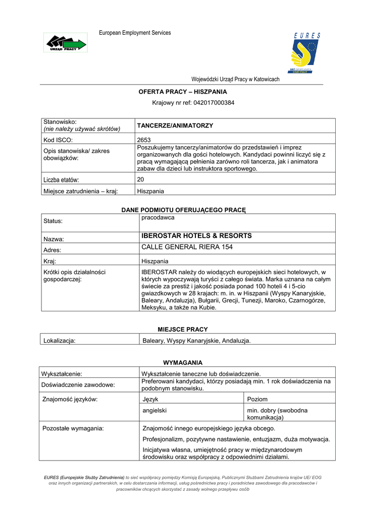 European Employment Services Wojewódzki Urząd Pracy w Katowicach OFERTA PRACY – HISZPANIA Krajowy nr ref: 042017000384 Stanowisko: (nie należy używać skrótów) Kod ISCO: TANCERZE/ANIMATORZY Opis stanowiska/ zakres obowiązków: 2653 Poszukujemy tancerzy/animatorów do przedstawień i imprez organizowanych dla gości hotelowych. Kandydaci powinni liczyć się z pracą wymagającą pełnienia zarówno roli tancerza, jak i animatora zabaw dla dzieci lub instruktora sportowego. Liczba etatów: 20 Miejsce zatrudnienia – kraj: Hiszpania Status: DANE PODMIOTU OFERUJĄCEGO PRACĘ pracodawca Nazwa: IBEROSTAR HOTELS & RESORTS Adres: CALLE GENERAL RIERA 154 Kraj: Hiszpania Krótki opis działalności gospodarczej: IBEROSTAR należy do wiodących europejskich sieci hotelowych, w których wypoczywają turyści z całego świata. Marka uznana na całym świecie za prestiż i jakość posiada ponad 100 hoteli 4 i 5-cio gwiazdkowych w 28 krajach: m. in. w Hiszpanii (Wyspy Kanaryjskie, Baleary, Andaluzja), Bułgarii, Grecji, Tunezji, Maroko, Czarnogórze, Meksyku, a także na Kubie. MIEJSCE PRACY Lokalizacja: Baleary, Wyspy Kanaryjskie, Andaluzja. WYMAGANIA Wykształcenie: Doświadczenie zawodowe: Znajomość języków: Pozostałe wymagania: Wykształcenie taneczne lub doświadczenie. Preferowani kandydaci, którzy posiadają min. 1 rok doświadczenia na podobnym stanowisku. Język Poziom angielski min. dobry (swobodna komunikacja) Znajomość innego europejskiego języka obcego. Profesjonalizm, pozytywne nastawienie, entuzjazm, duża motywacja. Inicjatywa własna, umiejętność pracy w międzynarodowym środowisku oraz współpracy z odpowiednimi działami. EURES (Europejskie Służby Zatrudnienia) to sieć współpracy pomiędzy Komisją Europejską, Publicznymi Służbami Zatrudnienia krajów UE/ EOG oraz innych organizacji partnerskich, w celu dostarczania informacji, usług pośrednictwa pracy i poradnictwa zawodowego dla pracodawców i pracowników chcących skorzystać z zasady wolnego przepływu osób Wielozadaniowość (praca jako tancerz oraz animator). Gotowość do przeniesienia się na sezon letni oraz przejścia szkolenia przed podjęciem zatrudnienia (kwiecień 2017). WYNAGRODZENIE I WARUNKI ZATRUDNIENIA Wysokość pensji brutto: 1500 Waluta, w jakiej wypłacana jest pensja: Euro Rodzaj stawki wynagrodzenia: miesięczna Pracodawca zapewnia zakwaterowanie i wyżywienie. Zwrot kosztów transportu po zakończeniu kontraktu. Darmowe szkolenie (kwiecień 2017). Dodatkowe świadczenia (zakwaterowanie, wyżywienie, koszty związane ze zmianą miejsca zamieszkania, koszty podróży itp.): Nazwa firmy, z którą zostanie podpisana umowa: IBEROSTAR HOTELS & RESORTS Rodzaj umowy: Umowa o pracę. Wymiar czasu pracy (praca na pełen etat/ część etatu): pełen etat Czas trwania umowy: Koniec kwietnia – połowa/koniec października 2017 (nieokreślony/ określony) Data wygaśnięcia umowy (w przypadku umowy na czas określony): określony 40 (Max. 56) Liczba godzin tygodniowo: Praca według grafiku, 6 dni w tygodniu. Zmiany i praca w dni wolne: Data rozpoczęcia: Okres zatrudnienia: od kwietnia do października 2017. Możliwe zatrudnienie na min. 3 miesiące od 01.06.2017 do 30.09.2017, przy czym obowiązkowy jest udział w 2tygodniowym szkoleniu, które rozpocznie się od połowy kwietnia 2017 roku. Inne informacje: Na początku marca 2017 roku pracodawca planuje organizację spotkania w Katowicach z wybranymi przez siebie kandydatami. Kandydaci zostaną poinformowani o dokładnym miejscu oraz terminie rozmów. SPOSÓB SKŁADANIA WNIOSKU Wymagane dokumenty (list motywacyjny, CV itp.): CV + list motywacyjny + prezentacja video (mile widziana, ale nie jest to wymóg konieczny). Język, w którym muszą być sporządzone przedkładane dokumenty: angielski lub hiszpański Do kogo należy wysłać dokumenty: (do pracodawcy/ doradcy EURES) Gdzie należy wysłać dokumenty: pracodawca + kopia do wiadomości doradca EURES [email protected] wraz z kopią do wiadomości [email protected] wpisując w temacie wiadomości „dancers/entertainers” WAŻNOŚĆ EURES (Europejskie Służby Zatrudnienia) to sieć współpracy pomiędzy Komisją Europejską, Publicznymi Służbami Zatrudnienia krajów UE/ EOG oraz innych organizacji partnerskich, w celu dostarczania informacji, usług pośrednictwa pracy i poradnictwa zawodowego dla pracodawców i pracowników chcących skorzystać z zasady wolnego przepływu osób Data publikacji: 01.02.2017 Termin przedkładania podań o pracę / zakończenia ważności oferty: 31.03.2017 Uprzejmie informujemy, że pracodawca skontaktuje się wyłącznie z wybranymi kandydatami. UWAGA: 1. Umowa z zagranicznym pracodawcą zostanie zawarta zgodnie z prawem kraju zatrudnienia. Oznacza to, że wszystkie roszczenia odnośnie do warunków, które obejmuje umowa, można kierować wyłącznie do odpowiedniego sądu w kraju zatrudnienia. Publiczne służby zatrudnienia (EURES) nie mogą pośredniczyć ani reprezentować pracownika w sądzie kraju zatrudnienia w przypadku sporu z pracodawcą. 2. Publiczne służby zatrudnienia (EURES) dokładają wszelkich starań, aby zapewnić rzetelność i wiarygodność ofert pracy zgłoszonych w lokalnym urzędzie pracy. Należy wyjaśnić, że oferta pracy została zgłoszona przez stronę trzecią i EURES nie odpowiada za ewentualne rozbieżności między warunkami pracy określonymi w ofercie pracy i warunkami oferowanymi przez potencjalnego pracodawcę. 3. Na podstawie ustawy o ochronie danych osobowych z dnia 29 sierpnia 1997 r. (Dz. U. z 2002 r. Nr 101, poz. 926 ze zm.) informujemy, że administratorem danych osobowych wskazanych w dokumentach przekazanych w odpowiedzi na ofertę pracy jest Wojewódzki Urząd Pracy w Katowicach, ul. Kościuszki 30, 40-048 Katowice. 4. Dane osobowe wskazane dobrowolnie w ww. dokumentach będą przetwarzane i udostępniane publicznym służbom zatrudnienia, pracodawcom lub podmiotom reprezentującym pra