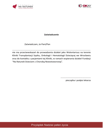 Zaświadczenie Zaświadczam, że Pani/Pan ………………………………………………………………………………………………………………………….. nie ma przeciwwskazań do prowadzenia działań jako Wolontariusz na terenie Kliniki Transplantacji Szpiku, Onkologii i Hematologii Dziecięcej we Wrocławiu oraz do kontaktu z pacjentami tej Kliniki, w ramach wspierania działań Fundacji “Na Ratunek Dzieciom z Chorobą Nowotoworową”. ……………………………………………… pieczątka i podpis lekarza Przylądek Nadziei pełen życia