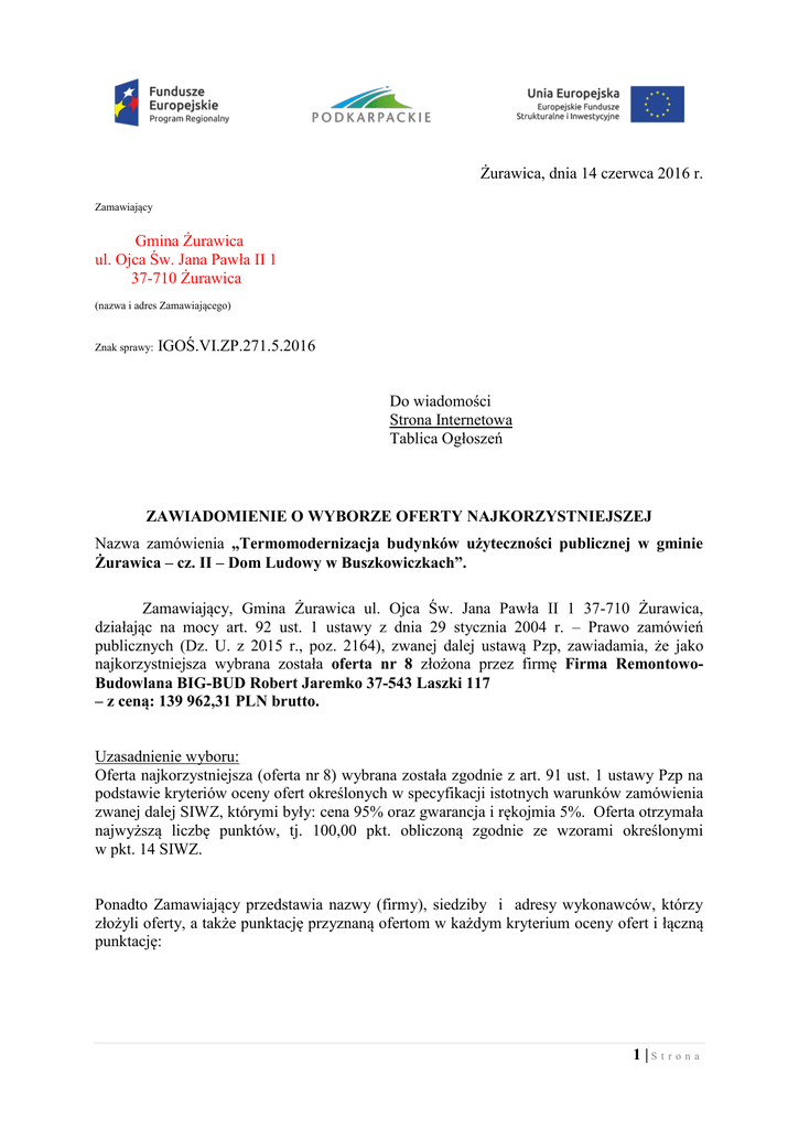 Żurawica, dnia 14 czerwca 2016 r. Zamawiający Gmina Żurawica ul. Ojca Św. Jana Pawła II 1 37-710 Żurawica (nazwa i adres Zamawiającego) Znak sprawy: IGOŚ.VI.ZP.271.5.2016 Do wiadomości Strona Internetowa Tablica Ogłoszeń Wykonawca Do wiadomości SA ul. Białobrzeska 159 ZAWIADOMIENIE O WYBORZE OFERTY NAJKORZYSTNIEJSZEJ Nazwa zamówienia „Termomodernizacja budynków użyteczności publicznej w gminie Żurawica – cz. II – Dom Ludowy w Buszkowiczkach”. Zamawiający, Gmina Żurawica ul. Ojca Św. Jana Pawła II 1 37-710 Żurawica, działając na mocy art. 92 ust. 1 ustawy z dnia 29 stycznia 2004 r. – Prawo zamówień publicznych (Dz. U. z 2015 r., poz. 2164), zwanej dalej ustawą Pzp, zawiadamia, że jako najkorzystniejsza wybrana została oferta nr 8 złożona przez firmę Firma RemontowoBudowlana BIG-BUD Robert Jaremko 37-543 Laszki 117 – z ceną: 139 962,31 PLN brutto. Uzasadnienie wyboru: Oferta najkorzystniejsza (oferta nr 8) wybrana została zgodnie z art. 91 ust. 1 ustawy Pzp na podstawie kryteriów oceny ofert określonych w specyfikacji istotnych warunków zamówienia zwanej dalej SIWZ, którymi były: cena 95% oraz gwarancja i rękojmia 5%. Oferta otrzymała najwyższą liczbę punktów, tj. 100,00 pkt. obliczoną zgodnie ze wzorami określonymi w pkt. 14 SIWZ. Ponadto Zamawiający przedstawia nazwy (firmy), siedziby i adresy wykonawców, którzy złożyli oferty, a także punktację przyznaną ofertom w każdym kryterium oceny ofert i łączną punktację: 1 |S t r o n a Liczba punktów w kryterium „Gwarancja i rękojmia” Łączna liczba punktów ofert Nazwa (firma) i adres wykonawcy Liczba punktów w kryterium „cena” 1 Firma RemontowoBudowlana BIG-BUD Robert Jaremko 37-543 Laszki 117 95,00 pkt. 5,00 pkt. 100,00 pkt. 91,81 pkt. 5,00 pkt. 96,81 pkt. 88,73 pkt. 5,00 pkt. 93,73 pkt. 85,71 pkt. 5,00 pkt. 90,71 pkt. 85,00 pkt. 5,00 pkt. 90,00 pkt. 77,76 pkt. 4,17 pkt. 81,93 pkt. 73,58 pkt. 5,00 pkt. 78,58 pkt. 66,99 pkt. 4,17 pkt. 71,16 pkt. 66,63 pkt. 4,17 pkt. 70,80 pkt. 64,73 pkt. 4,17 pkt. 68,89 pkt. Ranking 2 3 4 5 6 7 8 9 10 Firma Usługowa „EL-MAR” Maria Karaś Gorliczyna 134 37-200 Przeworsk Usługowy Zakład MurarskoMalarski Zbigniew Antosyk Buszkowice 217 37-710 Żurawica Usługi Budowlane „ROMEX” Zawitkowski Roman ul. Dojazdowa 33 37-500 Jarosław Zakład Usługowy Teresa Witek ul. Kochanowskiego 82 37-700 Przemyśl „Inter-Pol” Szówsko ul. Zamojska 10 37-500 Jarosław Usługi Ogólnobudowlane „KONTUR” Bogusław Majchrowicz 37-741 Krasiczyn 100 Firma Ogólnobudowlana „ESBUD” Edward Strzemiński Prałkowce 4A, 37-700 Przemyśl TGE INSTAL Sp. z o.o. Rakszawa 199, 37-111 Rakszawa Zakład BudowlanoKonserwatorski ARKADY ul. Długosza 9 37-500 Jarosław 2 |S t r o n a INFORMACJA O WYKONAWCACH WYKLUCZONYCH Zamawiający zawiadamia, że w postępowaniu nie zostali wykluczeni Wykonawcy. INFORMACJA O OFERTACH ODRZUCONYCH Zamawiający zawiadamia, że z udziału w postępowaniu zostały odrzucone oferty następujących Wykonawców: 1. Przedsiębiorstwo Wielobranżowe Inwest Sp. j. L. Kaczmarczyk ul. Wojska Polskiego 3 39-300 Mielec. Uzasadnienie W dniu 25.04.2016 r. Zamawiający, ogłosił przetarg nieograniczony mający na celu wyłonienie Wykonawcy, któremu powierzona zostanie realizacja zadania pn; „Termomodernizacja budynków użyteczności publicznej w gminie Żurawica – cz. II – Dom Ludowy w Buszkowiczkach” Mając na uwadze, narzucone przez instytucje wdrażającą współczynniki przenikania cieplnego, które muszą zostać uzyskane w wyniku termomodernizacji obiektu – Zamawiający opisując przedmiot zamówienia, określił minimalne wartości współczynnika przenikania ciepła dla poszczególnych elementów, a to w szczególności: - stolarka okienna w kolorze drewnopodobnym, pakiet 3 szybowy o współczynniku przenikania ciepła dla całego okna 0,90 W/km2 zgodnie z załącznikiem nr 5 do SIWZ (wyjaśnienie do przedmiaru b. elewacja) oraz odpowiedź na pytanie nr 1 (wyjaśnienie do SIWZ nr 1 z dn. 09.05.2016 r.). - stolarka drzwiowa w kolorze drewnopodobnym wykonana z PCV pakiet 3 szybowy o współczynniku przenikania ciepła dla całych drzwi 0,80 W/km2 zgodnie z załącznikiem nr 5 do SIWZ (wyjaśnienie do przedmiaru b. elewacja) oraz odpowiedź na pytanie nr 3 (wyjaśnienie do SIWZ nr 1 z dn. 05.05.2016 r.). Wykonawca w ofercie z dnia 11.05.2016 r., nie wskazał, parametrów tj; koloru, współczynnika przenikania ciepła, pakietu szybowego – okien i drzwi jakie przyjął do wyceny oraz do zamontowania. Mając na uwadze powyższe okoliczności faktyczne, Zamawiający pismem z dn. 07.06.2016 r., wezwał do wyjaśnień treści złożonej oferty. Wykonawca w wyznaczonym do dn. 10.06.2016 r. udzielił poniższych odpowiedzi: - stolarka okienna w kolorze białym, pakiet 3 szybowy o współczynniku przenikania ciepła dla całego okna 0,95 W/km2 (winno być max 0,90 W/km2) - stolarka drzwiowa wykonana z Aluminium (winno być z PCV) pakiet szybowy 33.1/16/33.1 o współczynniku przenikania ciepła dla całych drzwi 1,73 W/km2 (winno być max 0,80 W/km2). Mając na względzie, że zawarcie umowy o zamówienie publiczne, na podstawie złożonej oferty Wykonawcy, prowadziło by do odmiennej w sposobie realizacji zamówienia niż określone przez Zamawiającego w SIWZ zgodnie z art. 89 ust 1 pkt. 2 ustawy z dnia 29 stycznia 2004 r. – Prawo zamówień publicznych, stanowi podstawę do odrzucenia oferty, gdyż jej treść nie odpowiada treści specyfikacji istotnych warunków zamówienia. 3 |S t r o n a 2. Firma Usługi Remontowo-Budowlane Grzegorz Pacuła Tuczempy 326,37-514 Munina Uzasadnienie W dniu 25.04.2016 r. Zamawiający, ogłosił przetarg nieograniczony mający na celu wyłonienie Wykonawcy, któremu powierzona zostanie realizacja zadania pn; „Termomodernizacja budynków użyteczności publicznej w gminie Żurawica – cz. II – Dom Ludowy w Buszkowiczkach” Mając na uwadze, narzucone przez instytucje wdra