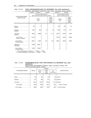 196 EDUKACJA I WYCHOWANIE TABL. 16 (131). LICEA OGÓLNOKSZTAŁCĄCE DLA MŁODZIEŻY (bez szkół specjalnych) GENERAL SECONDARY SCHOOLS FOR YOUTH (excluding special schools) 2000/01 WYSZCZEGÓLNIENIE SPECIFICATION 2003/04 2004/05 2003/04 szkoły ponadpodstawowe upper secondary (post-primary) schools szkoły ponadgimnazjalne upper secondary schools w tym miasta of which urban areas ogółem total 2004/05 w tym miasta of which urban areas ogółem total Szkoły .................................... Schools 182 11 - - 196 202 173 Oddziały ................................ Sections 2442 696 16 16 1458 2153 2011 Uczniowie .............................. Students 75850 20686 411 411 43647 64759 61085 w tym I klasa .................... of which 1st grade 21443 - - - 22153 22124 20806 w tym kobiety ..................... of which females 48621 12833 210 210 26612 39759 37664 Absolwenci ............................ Graduates 15559 20084 a . . x . . w tym kobiety ..................... of which females 10361 12508 b . . x . . a, b W tym absolwentów w miastach: a — 19208, b — 12001. a, b Of which graduates in urban areas: a — 19208, b — 12001. TABL. 17 (132). PONADGIMNAZJALNE LICEA PROFILOWANE DLA MŁODZIEŻY (bez szkół specjalnych) SPECIALIZED SECONDARY SCHOOLS (upper secondary schools) FOR YOUTH (excluding special schools) 2004/05 WYSZCZEGÓLNIENIE 2003/04 ogółem total miasta urban areas wieś rural areas SPECIFICATION Szkoły ....................................... 130 128 108 20 Schools Oddziały ................................... 421 580 515 65 Sections Uczniowie ................................. 11813 15987 14376 1611 Students w tym klasa I ....................... 5605 4984 4521 463 w tym kobiety ......................... 6099 8480 7590 890 of which 1st grade of which females