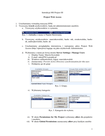 Instrukcja MS Project III Project Web Access 1. Uruchamiamy wirtualną maszynę EPM. 2. Tworzymy trzech uŜytkowników, będą oni administratorami zasobów. a. Tworzymy uŜytkowników w systemie. Rys. 1. Zakładka z menu w Panelu Sterowania. b. Tworzymy uŜytkowników: marcinkowalski, hasło: mk, ewakowalska, hasło: ek, andrzejkowalski, hasło: ak c. Uruchamiamy przeglądarkę internetową i wpisujemy adres Project Web Access (http://epm/pwa) logując się jako uŜytkownik Administrator. d. Wybieramy z menu po lewej stronie Server Settings i Manage Users i. Display Name: Marcin Kowalski ii. E-mail: [email protected] iii. Windows authentication, logon: marcinkowalski iv. Zaznaczamy: Prevent Active Directory synchronization for this user. v. Dodajemy go do grup: Rys. 2. Grupy. vi. Wybieramy kategorie: Rys. 3. Kategorie do wyboru. vii. W oknie Permissions for My Project wybieramy allow dla projektów i zasobów. viii. W oknie Global Permissions zaznaczamy allow przy kaŜdym zasobie 1 ix. Zapisujemy wpisane właściwości uŜytkownika. x. Klikamy na utworzonym uŜytkowniku. xi. Edytujemy uŜytkownika i zmieniamy jego login na EPM\marcinkowalski. xii. Tworzymy pozostałych trzech uŜytkowników analogicznie do powyŜszego, z tymŜe kolejni uŜytkownicy mogą obsługiwać jedynie zasoby. 3. Współdzielone dokumenty. a. Logujemy się jako uŜytkownik Marcin Kowalski. b. Tworzymy nowy dokument programu MS Word wybierając Project Web Access > Shared Documents. c. Piszemy kilka zdań i zapisujemy plik. d. Logujemy się jako inny uŜytkownik. e. Wybieramy dokument i edytujemy go, proszę zauwaŜyć, Ŝe istnieje równieŜ opcja tylko do odczytu. f. Po zapisaniu patrzymy na właściwości dokumentu i wybieramy check out, a następnie check in. Jako komentarz do check in moŜemy wpisać aktualne zmiany. Dokument powinien od teraz mieć odpowiednią nazwę uŜytkownika w polu modyfied. g. Wybieramy opcję alert me, pozwala ona na notyfikację za pomocą wybranego przy rejestracji uŜytkownika emaila, wybieramy OK. JeŜeli serwer jest poprawnie skonfigurowany emaile powinny zostać wysłane. h. Tworzymy na pulpicie dowolny plik, natomiast w Shared Documents wybieramy upload i zamieszczamy wybrany plik na serwerze. 4. Kalendarz organizacji. a. W ustawieniach serwera wybieramy Enterprise Calendars. b. Tworzymy nowy kalendarz dla naszej organizacji. c. Pracownicy firmy w bieŜącym miesiącu pracują od 8.30 do 16.30 z przerwą 30 minut o 12.00, w piątki pracują od 7.00 do 15.00 z przerwą o 11.30. Soboty pozostają jako dni wolne. d. Zapisujemy kalendarz pod wybraną przez siebie nazwą. e. Jak zauwaŜamy kalendarz pojawił się obok kalendarza standardowego i będzie dostępny przy tworzeniu nowych projektów (w programie MS Project) 5. Tworzenie poglądowego projektu. a. W Project Center wybieramy New Project. b. Uruchomi się program MS Project Professional. c. Tworzymy arkusz zasobów złoŜony z czterech osób i podajemy stawki wynagrodzenia zgodnie z uznaniem. d. Wybieramy kalendarz jako ten, który tworzyliśmy dla organizacji. e. W widoku Gantta tworzymy 5 zadań połączonych ze sobą typem rozpoczęciezakończenie. Długość zadań powinna wahać się od 1 do 5 dni. f. Przydzielamy zasoby ludzkie do zadań zgodnie z uznaniem. g. Zapisujemy projekt (jako plik). h. W menu Collaborate wybieramy Resource Center i dla utworzonych zasobów pracy wybieramy kierownika przydziałów Marcina Kowalskiego. Zamykamy widok. i. Zapisujemy projekt pod nową nazwą, tym razem na serwerze (save as). 2 j. Uruchamiamy ponownie przeglądarkę internetową i logujemy się do PWA jako Administrator, podglądamy projekty z centrum projektów. 6. Risks. a. Z menu Collaborate wybieramy Risks. b. Jest to miejsce gdzie moŜna dodać nowy punkt opisując ryzyko. c. Zakładamy, Ŝe pracujemy nad projektem, w którym finalnym produktem jest wytworzone oprogramowanie – gra komputerowa, jakie ryzyko ponosimy, jak temu przeciwdziałać, co zrobić, gdy niepoŜądana sytuacja nastąpi? (dyskusja) 7. Issues. a. Z menu Collaborate wybieramy Issues i dodajemy nowe. b. W projektach spotykamy często pewne zadania do rozwiązania czy rozwaŜenia i jest to odpowiednie miejsce by to opisać. c. W przykładowym projekcie interfejsu naleŜy rozwiązać problem walidacji danych wprowadzanych do systemu. Jakie rozwiązania są dostępne, jakie ograniczenia naleŜy załoŜyć na interfejs? (dyskusja) 8. Status Reports. a. Z menu Collaborate wybieramy Status Reports i dodajemy nowe. b. Nadajemy nazwę raportowi oraz termin jego Ŝądania (co tydzień we wtorek). c. Na Ŝądanie złoŜenia raportu powinien odpowiedzieć uŜytkownik Andrzej Kowalski. 9. Deliverables. a. Z menu Collaborate wybieramy Manage Deliverables i wybieramy nowe łącząc je z pierwszym zadaniem, czas trwania 1 dzień. b. Mianem Deliverables w środowisku projektowym określamy zbiór rezultatów generowanych przez zadanie w projekcie, które musza być osiągnięte by zrealizować część lub cały projekt. c. Klikamy link Open deliverables in browser. d. Dodajemy następne – tym razem trwające 5 dni i związane z kolejnym zadaniem. e. Obserwujemy je w przeglądarce. 10. Proposals and Activities. a. Logujemy się do WPA jako Administrator. b. Klikamy link Proposals and Activities. c. Dodajemy nowe (propozycje lub czynności kreujemy w podobny sposób). d. Dodajemy opis, wybieramy datę, zapisujemy i publikujemy. e. Propozycje to projekt inicjowany przez stronę internetową, czynności zaś związane są z ukończeniem projektu. 3