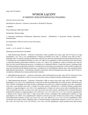 Sygn. akt IV K 358/15 WYROK ŁĄCZNY W IMIENIU RZECZYPOSPOLITEJ POLSKIEJ Dnia 26 czerwca 2015 roku Sąd Rejonowy Szczecin - Centrum w Szczecinie w Wydziale IV Karnym w składzie: Przewodniczący: SSR Artur Witek Protokolant: Mariusz Zając w obecności prokuratora Prokuratury Rejonowej Szczecin - Śródmieście w Szczecinie Danuty Łojewskiej – Sumisławskiej po rozpoznaniu w dniu 26 czerwca 2015 roku sprawy P. G. (1) urodz. (...) w S., syna B. i G. z domu G. skazanego prawomocnymi wyrokami: 1. Sądu Rejonowego Szczecin – Centrum w Szczecinie z dnia 5 grudnia 2012 roku, sygn. akt IV K 937/12 za ciąg przestępstw z art. 279 § 1 k.k. popełnionych w dniach 23 kwietnia 2012 roku i 5 września 2012 roku na kary 1 (jednego) roku i 6 (sześciu) miesięcy pozbawienia wolności oraz 180 (stu osiemdziesięciu) stawek dziennych grzywny w wysokości po 20 (dwadzieścia) złotych, za czyn z art. 288 § 1 k.k. popełniony w dniu 23 kwietnia 2012 roku na karę 4 (czterech) miesięcy pozbawienia wolności, za czyn z art. 178a § 1 k.k. popełniony w dniu 5 września 2012 roku na karę 100 (stu) stawek dziennych grzywny w wysokości po 10 (dziesięć) złotych, a nadto kary łączne 1 (jednego) roku i 8 (ośmiu) miesięcy pozbawienia wolności z warunkowym zawieszeniem jej wykonania na okres próby 5 (pięciu) lat oraz 200 (dwustu) stawek dziennych grzywny w wysokości po 20 (dwadzieścia) złotych, przy czym postanowieniem Sądu Rejonowego Szczecin – Prawobrzeże i Zachód w Szczecinie z dnia 26 listopada 2013 roku, sygn. akt IV K 937/12 zarządzono wykonanie kary łącznej pozbawienia wolności, 2. Sądu Rejonowego Szczecin – Centrum w Szczecinie z dnia 26 listopada 2014 roku, sygn. akt V K 1009/09 za czyn z art. 278 § 1 k.k. popełniony w dniu 22 czerwca 2013 roku na karę 5 (pięciu) miesięcy pozbawienia wolności, 3. Sądu Rejonowego Szczecin – Centrum w Szczecinie z dnia 31 marca 2015 roku, sygn. akt IV K 651/14 za ciąg przestępstw z art. 279 § 1 k.k. popełnionych w okresach od dnia 30 października 2013 roku do dnia 7 listopada 2013 roku, od dnia 19 listopada 2013 roku do dnia 23 listopada 2013 roku oraz w dniach 1 grudnia 2013 roku, 13 grudnia 2013 roku, 14/15 grudnia 2013 roku i 7 lutego 2014 roku na karę 2 (dwóch) lat i 2 (dwóch) miesięcy pozbawienia wolności, za ciąg przestępstw z art. 278 § 1 k.k. popełnionych w dniach 26 czerwca 2013 roku, 8 października 2013 roku, 22 grudnia 2013 roku, 22 marca 2014 roku i 30 marca 2014 roku na karę 1 (jednego) roku i 3 (trzech) miesięcy pozbawienia wolności, za ciąg przestępstw z art. 278 § 5 k.k. w zw. z art. 278 § 1 k.k. w zw. z art. 11 § 3 k.k. popełnionych w dniach 15/16 czerwca 2013 roku i 11 lipca 2013 roku na karę 1 (jednego) roku pozbawienia wolności, za ciąg przestępstw z art. 288 § 1 k.k. popełnionych w dniach 27 czerwca 2013 roku i 8 lipca 2013 roku na karę 1 (jednego) roku pozbawienia wolności, za czyn z art. 279 § 1 k.k. w zb. z art. 288 § 1 k.k. w zw. z art. 11 § 2 k.k. popełniony w dniu 29 stycznia 2014 roku na karę 1 (jednego) roku i 3 (trzech) miesięcy pozbawienia wolności, za czyn z art. 278 § 1 i 5 k.k. w zb. z art. 275 § 1 k.k. w zb. z art. 276 k.k. w zw. z art. 11 § 2 k.k. popełniony w dniu 29 marca 2014 roku na karę 9 (dziewięciu) miesięcy pozbawienia wolności, a nadto karę łączną 3 (trzech) lat i 4 (czterech) miesięcy pozbawienia wolności, I. na podstawie art. 91 § 2 k.k. łączy kary pozbawienia wolności wymierzone wyrokami Sądu Rejonowego Szczecin – Centrum w Szczecinie z dnia 26 listopada 2014 roku, sygn. akt V K 1009/09 oraz Sądu Rejonowego Szczecin – Centrum w Szczecinie z dnia 31 marca 2015 roku, sygn. akt IV K 651/14 i orzeka wobec P. G. (1) karę łączną 3 (trzech) lat i 5 (pięciu) miesięcy pozbawienia wolności. II. Na podstawie art. 577 k.p.k. zalicza skazanemu na poczet orzeczonej kary łącznej okresy rzeczywistego pozbawienia wolności od dnia 29 stycznia 2014 roku do dnia 30 stycznia 2014 roku oraz od dnia 8 kwietnia 2014 roku do dnia 10 kwietnia 2014 roku. III. Na podstawie art. 572 k.p.k. umarza postepowanie w pozostałej części. IV. Na podstawie art. 624 § 1 k.p.k. zwalnia skazanego P. G. (1) od zapłaty wydatków poniesionych przez Skarb Państwa. Sygn. akt IV K 358/15 UZASADNIENIE P. G. (1) został skazany prawomocnymi wyrokami: 4. Sądu Rejonowego Szczecin – Centrum w Szczecinie z dnia 5 grudnia 2012 roku, sygn. akt IV K 937/12 za ciąg przestępstw z art. 279 § 1 k.k. popełnionych w dniach 23 kwietnia 2012 roku i 5 września 2012 roku na kary roku i 6 miesięcy pozbawienia wolności oraz 180 stawek dziennych grzywny w wysokości po 20 złotych, za czyn z art. 288 § 1 k.k. popełniony w dniu 23 kwietnia 2012 roku na karę 4 miesięcy pozbawienia wolności, za czyn z art. 178a § 1 k.k. popełniony w dniu 5 września 2012 roku na karę 100 stawek dziennych grzywny w wysokości po 10 złotych, a nadto kary łączne roku i 8 miesięcy pozbawienia wolności z warunkowym zawieszeniem jej wykonania na okres próby 5 lat oraz 200 stawek dziennych grzywny w wysokości po 20 złotych, przy czym postanowieniem Sądu Rejonowego Szczecin – Prawobrzeże i Zachód w Szczecinie z dnia 26 listopada 2013 roku, sygn. akt IV K 937/12 zarządzono wykonanie kary łącznej pozbawienia wolności, 5. Sądu Rejonowego Szczecin – Centrum w Szczecinie z dnia 26 listopada 2014 roku, sygn. akt V K 1009/09 za czyn z art. 278 § 1 k.k. popełniony w dniu 22 czerwca 2013 roku na karę 5 miesięcy pozbawienia wolności, 6. Sądu Rejonowego Szczecin – Centrum w Szczecinie z dnia 31 marca 2015 roku, sygn. akt IV K 651/14 za ciąg przestępstw z art. 279 § 1 k.k. popełnionych w okresach od dnia 30 października 2013 roku do dnia 7 listopada 2013 roku, od dnia 19 listopada 2013 roku do dnia 23 listopada 2013 roku oraz w dniach 1 grudnia 2013 roku, 13 grudnia 2013 roku, 14/15 grudnia 2013 roku i 7 lutego 2014 roku na karę 2 lat i 2 miesięcy pozbawienia wol