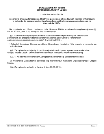 ZARZĄDZENIE NR 59/2015 BURMISTRZA MIASTA LUBOŃ z dnia 5 września 2015 r. w sprawie zmiany Zarządzenia 55/2015 o powołaniu obwodowych komisji wyborczych w Luboniu do przeprowadzenia referendum ogólnokrajowego zarządzonego na 6 września 2015r. Na podstawie art. 13 ust. 1 ustawy z dnia 14 marca 2003 r. o referendum ogólnokrajowym (tj. Dz. U. 2015 r., poz. 318) zarządza się, co następuje: § 1. Dokonać następujących zmian w składach obwodowych komisji ds. referendum powołanych do przeprowadzenia na terenie Lubonia głosowania w Referendum ogólnokrajowym zarządzonym na dzień 6 września 2015 r. 1) Odwołać Jarosława Gomułę ze składu Obwodowej Komisji nr 16 z powodu zrzeczenia się członkostwa. § 2. Zarządzenie podaje się do publicznej wiadomości przez wywieszenie w siedzibie Urzędu Miasta Luboń i umieszczenie na stronach Biuletynu Informacji Publicznej. § 3. 1. Nadzór nad wykonaniem Zarządzenia powierza się Sekretarzowi Miasta. 2. Wykonanie Zarządzenia powierza się kierownikowi Wydziału Organizacyjnego Urzędu Miasta. § 4. Zarządzenie wchodzi w życie z dniem 05.09.2015r. Id: F68F022D-4618-4FD0-9F53-72EB3D3D6808. Przyjety Strona 1 Załącznik do Zarządzenia Nr 56/2015 Burmistrza Miasta Luboń z dnia 26 sierpnia 2015 r. Obwodowa Komisja Wyborcza Nr 1 w Luboniu: Gimnazjum Nr 1, ul. Armii Poznań 27 1 Paweł Antoni Wolniewicz Prawo i Sprawiedliwość 2 Danuta Liminowicz Platforma Obywatelska 3 Maria Zabawa Sojusz Lewicy Demokratycznej 4 Andrzej Zawadzki Fundacja Wolność i Nadzieja 5 Grzegorz Łukowski Stowarzyszenie Ruch Obrony Obywateli 6 Bożena Kaczmarek Pracownik samorządowy Obwodowa Komisja Wyborcza Nr 2 w Luboniu: Szkoła Podstawowa nr 3, ul. Jana Henryka Dąbrowskiego 2a 1 Maciej Szymczak Prawo i Sprawiedliwość 2 Elżbieta Małecka Platforma Obywatelska 3 Jakub Loryncki Sojusz Lewicy Demokratycznej 4 Daria Simon-Pawlak Fundacja Wolność i Nadzieja 5 Anna Schlegel Stowarzyszenie Ruch Obrony Obywateli 6 Wojciech Janicki Pracownik samorządowy Obwodowa Komisja Wyborcza Nr 3 w Luboniu: KOM - LUB Spółka z o.o., ul. Niepodległości 11 1 Krzysztof Augustyniak Prawo i Sprawiedliwość 2 Nicola Wyżkiewicz Platforma Obywatelska 3 Maria Siatka Sojusz Lewicy Demokratycznej 4 Marcin Ledniawski Fundacja Kisiela 5 Maria Dziewierska Stowarzyszenie Ruch Obrony Obywateli 6 Elżbieta Królikiewicz Pracownik samorządowy Obwodowa Komisja Wyborcza Nr 4 w Luboniu: Biblioteka Miejska, ul. Żabikowska 42 1 Jolanta Korcz Prawo i Sprawiedliwość 2 Katarzyna Grabia Platforma Obywatelska 3 Ewelina Podolska Sojusz Lewicy Demokratycznej 4 Anna Gortat Fundacja Wolność i Nadzieja 5 Jan Frąckowiak Stowarzyszenie Ruch Obrony Obywateli 6 Irena Grzywaczyk Stowarzyszenie Bóg Honor Ojczyzna 7 Marzena Janusz Pracownik samorządowy Obwodowa Komisja Wyborcza Nr 5 w Luboniu: Biblioteka Miejska, ul. Żabikowska 42 1 MichałŁasecki Prawo i Sprawiedliwość 2 Marcin Koszembar Platforma Obywatelska 3 Halina Wilkowska Sojusz Lewicy Demokratycznej 4 Agnieszka Kasztelan Fundacja Wolność i Nadzieja 5 Urszula Kuszewska Stowarzyszenie Ruch Obrony Obywateli Id: F68F022D-4618-4FD0-9F53-72EB3D3D6808. Przyjety Strona 1 6 Pracownik samorządowy Sylwia Marciniak Obwodowa Komisja Wyborcza Nr 6 w Luboniu: Szkoła Podstawowa nr 2, ul. Żabikowska 40 1 Andrzej Siatka Prawo i Sprawiedliwość 2 Marcin Piniarski Platforma Obywatelska 3 Jacek Łuczak Sojusz Lewicy Demokratycznej 4 Krystyna Polus Fundacja Wolność i Nadzieja 5 Anna Janiak Fundacja Kisiela 6 Katarzyna Szeszuła Stowarzyszenie Ruch Obrony Obywateli 7 Marta Gidaszewska Pracownik samorządowy Obwodowa Komisja Wyborcza Nr 7 w Luboniu: Szkoła Podstawowa nr 2, ul. Żabikowska 40 1 Emil Majchrzak Prawo i Sprawiedliwość 2 Bartosz Mateusz Wilczek Platforma Obywatelska 3 Natalia Matalewska Sojusz Lewicy Demokratycznej 4 Sebastian Glabus Fundacja Wolność i Nadzieja 5 Alicja Labijak Fundacja Kisiela 6 Wanda Burzyńska Stowarzyszenie Ruch Obrony Obywateli 7 Aleksandra Sołecka Pracownik samorządowy Obwodowa Komisja Wyborcza Nr 8 w Luboniu: Spółdzielnia Mieszkaniowa, ul. Żabikowska 62 1 Renata Koperska Prawo i Sprawiedliwość 2 Lidia Godek Platforma Obywatelska 3 Anna Maria Szajek Sojusz Lewicy Demokratycznej 4 Piotr Teszner Fundacja Wolność i Nadzieja 5 Tomasz Filipiak Stowarzyszenie Ruch Obrony Obywateli 6 Julia Tórz Stowarzyszenie Młodzi Demokraci 7 Hanna Brocka Pracownik samorządowy Obwodowa Komisja Wyborcza Nr 9 w Luboniu: Miejski Ośrodek Pomocy Społecznej, ul. Źródlana 1 1 Anna Maria Krudysz Prawo i Sprawiedliwość 2 Aneta Ślaska Platforma Obywatelska 3 Grażyna Andrzejewska Sojusz Lewicy Demokratycznej 4 Przemysław Glabus Fundacja Wolność i Nadzieja 5 Anita Bielawska Stowarzyszenie Ruch Obrony Obywateli 6 Romana Gadzińska Pracownik samorządowy Obwodowa Komisja Wyborcza Społecznej, ul. Źródlana 1 Nr 10 w Luboniu: Miejski Ośrodek 1 Maria Żarnowiecka Prawo i Sprawiedliwość 2 Dorota Hirsch Platforma Obywatelska 3 Małgorzata Nawrocka Fundacja Wolność i Nadzieja Id: F68F022D-4618-4FD0-9F53-72EB3D3D6808. Przyjety Pomocy Strona 2 4 Adam Popadiuk Stowarzyszenie Ruch Obrony Obywateli 5 Jolanta Włodarska Pracownik samorządowy Obwodowa Komisja Wyborcza Nr 11 w Luboniu: Szkoła Podstawowa nr 1, ul. Józefa Poniatowskiego 16 1 Julia Wilczek Prawo i Sprawiedliwość 2 Małgorzata Ewa Nyćkowiak Platforma Obywatelska 3 Iga Zofia Przybył Sojusz Lewicy Demokratycznej 4 Magdalena Labijak Fundacja Wolność i Nadzieja 5 Kamila Borowicz Fundacja Kisiela 6 Anna Osińska Stowarzyszenie Ruch Obrony Obywateli 7 Lidia Potocka Kaczmarek Pracownik samorządowy Obwodowa Komisja Wyborcza Nr 12 w Luboniu: Gimnazjum nr 2 ul. Hugona Kołłątaja 1 1 Dagmara Czajka Prawo i Sprawiedliwość 2 Ewa Polowa Fundacja Wolność i Nadzieja 3 Aleksandra Troszczyńska Fundacja Kisiela 4 Katarzyna Osińska Stowarzyszenie Ruch Obrony Obywateli 5 Katarzyna Pilarska Pracownik samorządowy Obwodowa Komisja Wyborcza Nr 13 w Luboniu: Szkoła Pods
