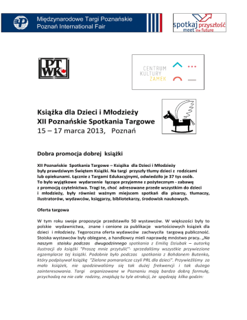 Książka dla Dzieci i Młodzieży XII Poznańskie Spotkania Targowe 15 – 17 marca 2013, Poznań Dobra promocja dobrej książki XII Poznańskie Spotkania Targowe – Książka dla Dzieci i Młodzieży były prawdziwym Świętem Książki. Na targi przyszły tłumy dzieci z rodzicami lub opiekunami. Łącznie z Targami Edukacyjnymi, odwiedziło je 37 tys osób. To było wyjątkowe wydarzenie łączące przyjemne z pożytecznym - zabawę z promocją czytelnictwa. Tragi te, choć adresowane przede wszystkim do dzieci i młodzieży, były również ważnym miejscem spotkań dla pisarzy, tłumaczy, ilustratorów, wydawców, księgarzy, bibliotekarzy, środowisk naukowych. Oferta targowa W tym roku swoje propozycje przedstawiło 50 wystawców. W większości były to polskie wydawnictwa, znane i cenione za publikacje wartościowych książek dla dzieci i młodzieży. Tegoroczna oferta wydawców zachwyciła targową publiczność. Stoiska wystawców były oblegane, a handlowcy mieli naprawdę mnóstwo pracy. „Na naszym stoisku podczas dwugodzinnego spotkania z Emilią Dziubak – autorką ilustracji do książki "Proszę mnie przytulić"- sprzedaliśmy wszystkie przywiezione egzemplarze tej książki. Podobnie było podczas spotkania z Bohdanem Butenko, który podpisywał książkę "Zielone pomarańcze czyli PRL dla dzieci". Przywieźliśmy za mało książek, nie spodziewaliśmy się tak dużej frekwencji i tak dużego zainteresowania. Targi organizowane w Poznaniu mają bardzo dobrą formułę, przychodzą na nie całe rodziny, znajdują tu tyle atrakcji, że spędzają kilka godzin: biorą udział w różnych spotkaniach, warsztatach, zabawach. Niektóre osoby kilkakrotnie wracały na nasze stoisko. Pobyt na targach uważamy za bardzo korzystny.” – powiedziała Elżbieta Cichy z Agencji Edytorskiej EZOP. Duże zainteresowanie zwiedzających, którzy nie tylko oglądali, ale także chętnie kupowali prezentowane książki, pokazało, że obecność dobrych i mądrych lektur jest doceniana w codziennym życiu rodzinnym i dla wielu osób tradycyjna książka stanowi wartość. Oto co powiedziała jedna z odwiedzających, pani Elżbieta, wychodząca z targów z pełną torbą książek: „ Co roku przychodzę na Targi Książki dla Dzieci i Młodzieży ze swoim mężem i dwójką dzieci. Dziś jestem tu sama, ponieważ robię zakupy na zapas. Kupiłam tu wiele bardzo dobrych, mądrych książek, którymi później, stopniowo, przy okazji różnych świąt, będę obdarowywać dzieci. Takich książek, jak te które są na targach, nie można tak łatwo kupić ani w empikach, ani w sklepach czy księgarniach. Często są to propozycje małych wydawców, którzy specjalizują się w książkach dla dzieci. Na targi wystawcy przywożą najnowsze swoje propozycje. Jest co kupować. Jutro i pojutrze przyjdziemy na targi całą rodziną - jest tyle atrakcyjnych wydarzeń organizowanych dla dzieci, więc na pewno będą zadowolone z takiego weekendu z książką na targach”. Na targach niemalże takim samym zainteresowaniem cieszyły się premiery książek, jak i ciekawe wznowienia wydań sprzed lat. Okazuje się, że dorośli bardzo lubią wracać do lektur swojego dzieciństwa i często właśnie je podsuwają swoim dzieciom. Na stoiskach targowych można było więc znaleźć wydania sprzed lat np. ze znakomitymi ilustracjami Jana Marcina Szancera. Istotnym wydarzeniem była prezentacja książki z ilustracjami Krystyny Lipki-Sztarbałło i tekstem Heekyoung Kim „Dokąd iść? Mapy mówią do nas”. W targach obok wydawnictw i księgarń brały udział także instytucje kulturalne, jak np. Muzeum Początków Państwa Polskiego oraz miasta partnerskie Poznania: Brno (Czechy) i Györ (Węgry). Prezentacje ilustracji i grafiki książkowej Podczas Targów Książka dla Dzieci i Młodzieży szczególnie podkreślane jest znaczenie ilustracji książkowych. W tym roku przygotowano aż osiem różnych wystaw ilustracji i wszystkie cieszyły się dużym zainteresowaniem. W cyklu „Mistrz Ilustracji” prezentowana była twórczość Krystyny Lipki-Sztarbałło. Na Salonie Ilustratorów pokazano prace 34 młodych artystów plastyków. Były wystawy, akcentujące tegoroczne rocznice związane ze znakomitymi twórcami: Julianem Tuwimem, Kazimierą Iłłakowiczówną i Janem Marcinem Szancerem. Ciekawie prezentowała się wystawa Nagród Polskiej Sekcji IBBY (książek i ilustracji) oraz zorganizowana przez katowicką Akademię Sztuk Pięknych i Bibliotekę Śląską pokonkursowa wystawa „Książka dobrze zaprojektowana – zacznijmy od dzieci”. Bardzo podobały się „Ilustracje z czterech stron świata” - wystawa Tatiany Zgaińskiej-Filipowskiej i Iwony Czapli pokazująca różnorodności stylów i technik kilkudziesięciu prac artystów z różnych kręgów kulturowych. Na targach można było podziwiać również sztukę ilustracji na wystawie pt „Dziecko w centrum. Szwedzka Literatura Dziecięca” przygotowanej przez Ambasadę Królestwa Szwecji i na specjalnej wystawie prezentującej prace węgierskiej ilustratorki Zsuzski Farkas. Atrakcje dla dzieci Z myślą o dzieciach przygotowano wiele różnorodnych atrakcji. Przede wszystkim na targach można było bezpośrednio spotkać się z ulubionymi pisarzami i ilustratorami. W tym roku do Poznania przyjechało wielu twórców i miłośnicy książek mieli szansę na zdobycie autografów m.in.: Zofii Beszczyńskiej, Elżbiety Krygowskiej – Butlewskiej, Anity Głowińskiej, Joanny Krzyżanek, Joanny Papuzińskiej, Michała Rusinka, Wojciecha Widłaka, Marcina Szczygielskiego, Agnieszki Tyszki, Barbary Stenki, Krystyny Lipki-Sztarbałło. Furorę wręcz zrobiło spotkanie ze szwedzkimi twórcami książki dla dzieci Martinem Widmarkiem i Heleną Willis, autorami bestsellerowej serii Biuro Detektywistyczne Lassego i Mai. Dzieci mogły również uczestniczyć w wielu rozwijających wyobraźnię zabawach, warsztatach i występach sce