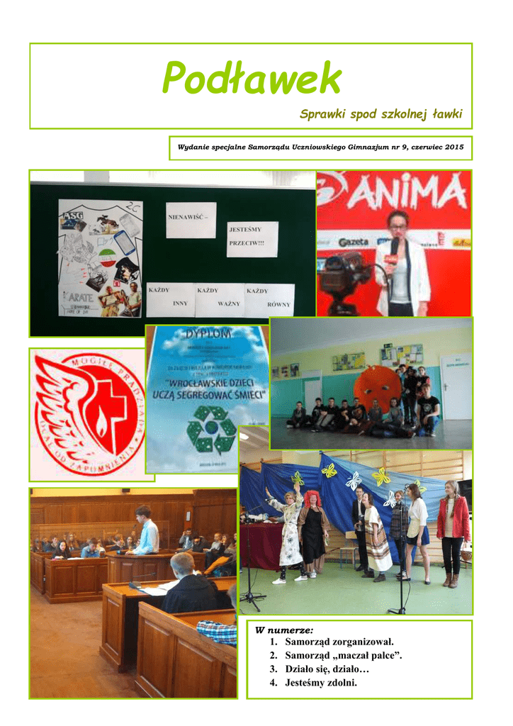 Podławek Sprawki spod szkolnej ławki Wydanie specjalne Samorządu Uczniowskiego Gimnazjum nr 9, czerwiec 2015 W numerze: 1. 2. 3. 4. Samorząd zorganizował. Samorząd „maczał palce”. Działo się, działo… Jesteśmy zdolni. Coś o nas Zaangażowanie, kreatywność, młodzieńcza energia, wytrwałość, nierzadko improwizacja to nasze mocne strony. Jesteśmy współgospodarzami szkoły, tworzymy drużynę. Razem współpracujemy, planujemy, organizujemy, współdecydujemy o biegu szkolnego życia, uczymy się i bawimy. Ale także kierujemy, egzekwujemy, kontrolujemy i oceniamy, ponieważ wiemy, że stanowimy jeden z organów szkoły, a to wielka odpowiedzialność. Staramy się, by podejmowane przez nas inicjatywy były twórcze, innowacyjne, aktywizujące całą społeczność uczniowską, by nasza szkoła była dla wszystkich miejscem atrakcyjnym i przyjaznym, by wyrażenie „drugi dom” nie było w odniesieniu do naszej szkoły jedynie pustym frazesem. Praca na rzecz społeczności uczniowskiej przynosi nam wiele satysfakcji. Co tu dużo mówić, to wielka frajda! Rzeczywiście, kiedy zastanawialiśmy się, co umieścić w specjalnym samorządowym wydaniu „Podławka”, kiedy zebraliśmy wszystko, co robiliśmy, w czym „maczaliśmy palce”, co ciekawego działo się w szkole, poczuliśmy dumę! Niezła ta nasza szkoła, dużo się w niej działo na wszystkich frontach, a my jesteśmy ważnymi współtwórcami tego, że upływający rok szkolny zdecydowanie określić możemy rokiem sukcesu. Udało nam się zrealizować większość z zaplanowanych działań, kilka nowych „wyszło” w trakcie. Poznaliśmy się, nauczyliśmy razem pracować, rozdzielać zadania, podejmować wyzwania i brać odpowiedzialność za swoje kroki. Byliśmy samorządem, który dzięki swojej pracy był z szacunkiem traktowany przez Dyrekcję i Radę Pedagogiczną jako równorzędny partner. Jest się czym pochwalić! Zapraszamy serdecznie do lektury specjalnego numeru „Podławka”, mając nadzieję, że stanie się on inspiracją dla przyszłych samorządowców. Samorząd Uczniowski SAMORZĄD ZORGANIZOWAŁ SAMORZĄD „MACZAŁ PALCE” DZIAŁO SIĘ, DZIAŁO… JESTEŚMY ZDOLNI S A M O R Z Ą D Z O R G A N I Z O W A Ł Wybory samorządowe 2014 i Młodzieżowe Wybory Prezydenckie 2015 By móc opowiadać o naszych działaniach, musimy zacząć od początku, od wyborów. Chcemy się nimi pochwalić, ponieważ w tym roku wybory w naszej szkole miały szerszy niż zwykle zakres. Oprócz tradycyjnych wyborów Zarządu Samorządu Uczniowskiego, odbyły się w naszej szkole również Młodzieżowe Wybory Prezydenckie. Zaczęliśmy od kampanii informacyjnej o roli samorządu uczniowskiego. Był to cykl lekcji prowadzonych przez nauczycieli WOS-u. W efekcie powstały plakaty informacyjne, które zdobiły naszą tablicę Samorządu Uczniowskiego. W kampanii wyborczej stosowano wiele metod, od plakatów z programami wyborczymi, bezpośrednich rozmów z wyborcami, po chociażby ciasteczka z chorągiewkami z prośbą, by koniecznie zagłosować na jedną z kandydatek. Było dużo zabawy, ale też integracji społeczności uczniowskiej oraz dostrzeżenia wagi kampanii wyborczej i samych wyborów samorządowych. Wybory władz Samorządu Uczniowskiego w Gimnazjum nr 9 są zawsze bardzo ważnym wydarzeniem. Ten dzień jest świętem demokracji w szkole i stanowi zwieńczenie kilku tygodni pracy w postaci przygotowań i kampanii wyborczej. Głosowanie w tym roku odbyło się 29 września, tradycyjnie już pod patronatem Centrum Edukacji Obywatelskiej. Nad całością czuwała Komisja Wyborcza, której przewodniczyła Sandra Ziębicka. Głównym celem akcji „Samorządy mają głos” jest zwiększenie roli samorządów uczniowskich w polskich szkołach, uczynienie z władz samorządu rzeczywistej reprezentacji uczniów i zyskanie przez nich realnego wpływu na obraz szkolnej rzeczywistości. W akcji bierze udział ponad 600 szkół z całej Polski, które zdecydowały się zorganizować wybory zgodnie ze standardami wypracowanymi przez Koalicję na rzecz samorządów uczniowskich. Gimnazjum nr 9 nie mogło nie przyłączyć się do kampanii, dzięki której każdy uczeń miał możliwość wzięcia udziału w wolnych, powszechnych i demokratycznych wyborach Zarządu Samorządu Uczniowskiego. Skład Zarządu Samorządu Uczniowskiego Gimnazjum nr 9 im. św. Jadwigi Śląskiej we Wrocławiu w roku szkolnym 2014/2015 1. 2. 3. 4. 5. 6. 7. 8. 9. Ewa Borkowska – przewodnicząca Karolina Durkacz – wiceprzewodnicząca Patrycja Krzemińska – skarbnik Paweł Czernuszka Dominika Gaździcka Aleksandra Kisielewska Aleksandra Kobuszewska Adam Malinowski Kacper Nowakowski Dziś z perspektywy czasu nie sposób nie wspomnieć o Julii Felbinger, która nie dostała się do Zarządu Samorządu Uczniowskiego, ale przez cały rok dzięki swojej charyzmie i zaangażowaniu skupiała młodzież wokół siebie i stanowiła filar i motor wielu działań podejmowanych przez samorządowców. Natomiast 29 kwietnia 2015 roku w Gimnazjum nr 9 im. św. Jadwigi Śląskiej we Wrocławiu odbyły się Młodzieżowe Wybory Prezydenckie. Akcja była zorganizowana pod egidą Centrum Edukacji Obywatelskiej i nosiła nazwę „Młodzi głosują”. Gimnazjaliści oddawali głosy na kandydatów startujących w wyborach prezydenckich 2015. Komisja wyborcza w składzie: Julia Felbinger, Aleksandra Kisielewska, Karolina Durkacz i przewodniczący Mateusz Kisielewski, przygotowała wybory, liczyła głosy oraz czuwała nad całością. Wybory w szkole wygrał Janusz Korwin-Mikke, na którego zagłosowano 74 razy, drugi był urzędujący prezydent Bronisław Komorowski z liczbą 52 głosów. Mimo że naszym uczniom nie udało się przewidzieć prawdziwego wyniku wyborów, akcja ta stanowiła doskonałą lekcję demokracji, przedsmak dorosłości oraz odpowiedzialności za podejmowane wybory. Joanna Sztyma Młodzi głosują ! HALLOWEEN A TOLERANCJA J