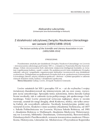 RES HISTORICA 38, 2014 Aleksandra Lubczyńska (Uniwersytet Jana Kochanowskiego w Kielcach) Z działalności odczytowej Związku Naukowo-Literackiego we Lwowie (1893/1898-1914) The lecture activity of the Scientific and Literary Association in Lviv (1893/1898-1914) Streszczenie: Przedmiotem artykułu jest działalność Związku Naukowo-Literackiego we Lwowie – stowarzyszenia założonego pod koniec XIX w. z inicjatywy Franciszka Rawity-Gawrońskiego. Celem stowarzyszenia było ułatwienie miejscowej inteligencji kontaktu ze światem współczesnej kultury, nauki i sztuki. Do podstawowych form działalności Związku należały: odczyty i pogadanki, organizowanie obchodów rocznicowych oraz działalność wydawnicza. Prelegentami na spotkaniach Związku byli m.in. profesorowie Uniwersytetu Lwowskiego, literaci, artyści, działacze społeczni – słowem – wybitni specjaliści w zakresie różnych dziedzin nauki, kultury i działalności społecznej. Słowa kluczowe: Galicja, Lwów, Związek Naukowo-Literacki. Lwów ostatnich lat XIX i początku XX w. – aż do wybuchu I wojny światowej charakteryzował się intensywnym, jak na owe czasy, rozwojem życia umysłowego. Sprzyjała temu autonomia, która dawała Galicji liczne swobody, tak w zakresie życia politycznego, jak społecznego i kulturalnego. Toteż Lwów przeżywał wówczas najlepszy okres w swoim rozwoju, urastał do rangi drugiej, obok Krakowa, stolicy, nie tylko zresztą Galicji, ale wszystkich zaborów. Swobody konstytucyjne, polski uniwersytet (Lwów, Kraków) i inne uczelnie (Akademia Techniczna, od 1877 r. Szkoła Politechniczna we Lwowie; Wyższa Szkoła Rolnicza, od 1901 r. Akademia Rolnicza w Dublanach; Akademia Medycyny Weterynaryjnej we Lwowie), biblioteki: Ossolineum, Uniwersytecka, Baworowskich, Dzieduszyckich i Pawlikowskich, wreszcie towarzystwa naukowe: Filozoficzne, Historyczne, Literackie im. Mickiewicza i Przyrodnicze Kopernika 122 Aleksandra Lubczyńska – to wszystko wpływało na niepowtarzalną atmosferę miasta, sprzyjało rozwojowi kadry naukowej oraz różnych zawodów. Inteligencja, aktywna i zaangażowana w życie kulturalne, naukowe i artystyczne miasta, odgrywała ogromną rolę w rozwoju wielu inicjatyw. Z kolei pejzaż literacki Lwowa to najwybitniejsi pisarze i poeci, m.in. Jan Kasprowicz, Leopold Staff, bracia Stanisław i Wincenty Korab Brzozowscy, Maryla Wolska, Bronisława Ostrowska, Gabriela Zapolska, Jerzy Żuławski i Kornel Makuszyński oraz najwybitniejsi krytycy epoki: Ostap Ortwin i Karol Irzykowski, których obecność czyniła ze Lwowa drugie, obok Krakowa, centrum Młodej Polski. Życie kulturalne i artystyczne toczyło się nie tylko w towarzystwach naukowych, salach wystawowych i koncertowych, czy teatrach, ale także w kawiarniach, restauracjach, cukierniach i klubach. Były to najbardziej swobodne przestrzenie dla prezentowania swoich poglądów przez osoby znaczące w jakiejś dziedzinie działalności twórczej, także dla wymiany tych poglądów i gorących dyskusji1. Polacy dominowali w mieście i nadawali mu swoiste piętno. Musieli jednak godzić się z faktem, że Lwów to także miasto Ukraińców, Żydów, Niemców, czy Ormian. Nie zawsze stosunki pomiędzy polską większością a niektórymi z tych narodowości układały się poprawnie. Trudno jednak o całkowity brak konfliktów w warunkach, w których każdy z narodów miał swoje aspiracje do stanowienia o sobie. Toteż koegzystujące w mieście środowiska narodowe większość przedsięwzięć realizowały oddzielnie, co jednak czasem, w sprzyjających warunkach, nie uniemożliwiało współpracy2. Do tych grup miejscowej inteligencji, właśnie na przełomie XIX i XX w. dołączać zaczęli przybysze, najczęściej z Królestwa Polskiego, którzy w Galicji szukali schronienia przed carskim wymiarem sprawiedliwości. Oni – będąc z zewnątrz – mocniej aniżeli miejscowi dostrzegali, jakie możliwości dawała autonomia. Co prawda istniały we Lwowie dość prężnie działające, wspomniane wyżej towarzystwa naukowe, ale – według przybyszów – brakowało takiego, które zjednoczyłoby inteligencję 1 Obraz różnych środowisk inteligencji lwowskiej przedstawiła Urszula Jakubowska w pracy Lwów na przełomie XIX i XX wieku. Przegląd środowisk prasotwórczych, Warszawa 1991. Tam również bibliografia, m.in. wspomnień ludzi, żyjących we Lwowie w tym okresie; podobnie w jednej z najnowszych prac zbiorowych: Lwów: miasto – społeczeństwo – kultura. Studia z dziejów miasta, t. 9: Życie codzienne miasta, red. K. Karolczak, Ł. T. Sroka, Kraków 2014. Tematyka ta obecna jest również we współczesnej historiografii ukraińskiej i w pamiętnikach, m.in.: Ukraïns’ka ìstorìografïâ na zlamì XX ì XXI stolìt’. Zdobutki ì problemi, red. L. Zaškìl’nâk, L’vìv 2004; S. Šah, L’vìv - mìsto moeï molodosti. Spomin prisvâčenij Tìnâm zabutih L’vov’ân, č. 1-2, L’vìv 2006. 2 U. Jakubowska, op.cit., s. 7. Z działalności odczytowej Związku Naukowo-Literackiego we Lwowie... 123 „dla wymiany myśli” i „dla samokształcenia”, poprzez dyskusje o najnowszych prądach umysłowych na świecie. W 1893 r. pojawiła się w środowisku lwowskiej inteligencji ciekawa inicjatywa, jaką był Związek Naukowo-Literacki. Jego zadaniem miało być ułatwienie zainteresowanym kontaktu ze światem współczesnej – nie tylko polskiej – kultury, nauki i sztuki. Pomysłodawcą był mieszkający wówczas we Lwowie literat i historyk-amator Franciszek Rawita-Gawroński3. Ambicją nowego stowarzyszenia było, aby – w odróżnieniu od istniejących już w mieście kilku kasyn-klubów dla inteligencji naukowej i literackiej, w których jednak panowała zbyt swobodna, raczej towarzyska, a nie intelektualna atmosfera – organizować systematyczne odczyty i dyskusje z zakresu różnych dziedzin nauki i kultury. Nowością miały być także – oprócz owych odczytów i dyskus
