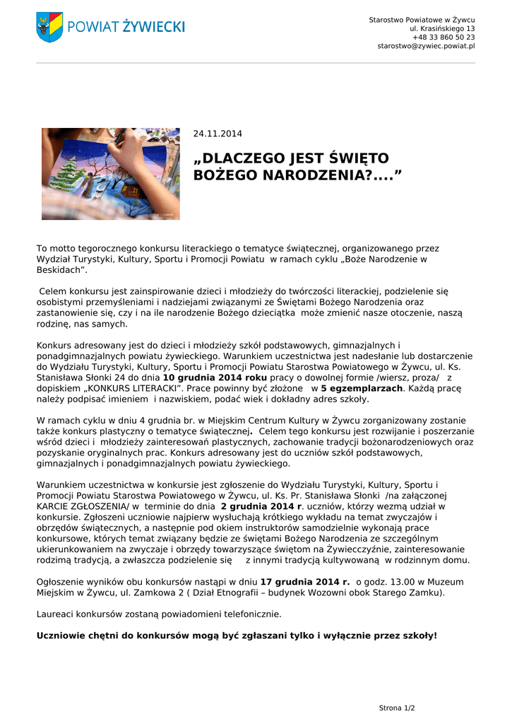 Starostwo Powiatowe w Żywcu ul. Krasińskiego 13 +48 33 860 50 23 [email protected] 24.11.2014 „DLACZEGO JEST ŚWIĘTO BOŻEGO NARODZENIA?....” To motto tegorocznego konkursu literackiego o tematyce świątecznej, organizowanego przez Wydział Turystyki, Kultury, Sportu i Promocji Powiatu w ramach cyklu „Boże Narodzenie w Beskidach”. Celem konkursu jest zainspirowanie dzieci i młodzieży do twórczości literackiej, podzielenie się osobistymi przemyśleniami i nadziejami związanymi ze Świętami Bożego Narodzenia oraz zastanowienie się, czy i na ile narodzenie Bożego dzieciątka może zmienić nasze otoczenie, naszą rodzinę, nas samych. Konkurs adresowany jest do dzieci i młodzieży szkół podstawowych, gimnazjalnych i ponadgimnazjalnych powiatu żywieckiego. Warunkiem uczestnictwa jest nadesłanie lub dostarczenie do Wydziału Turystyki, Kultury, Sportu i Promocji Powiatu Starostwa Powiatowego w Żywcu, ul. Ks. Stanisława Słonki 24 do dnia 10 grudnia 2014 roku pracy o dowolnej formie /wiersz, proza/ z dopiskiem „KONKURS LITERACKI”. Prace powinny być złożone w 5 egzemplarzach. Każdą pracę należy podpisać imieniem i nazwiskiem, podać wiek i dokładny adres szkoły. W ramach cyklu w dniu 4 grudnia br. w Miejskim Centrum Kultury w Żywcu zorganizowany zostanie także konkurs plastyczny o tematyce świątecznej. Celem tego konkursu jest rozwijanie i poszerzanie wśród dzieci i młodzieży zainteresowań plastycznych, zachowanie tradycji bożonarodzeniowych oraz pozyskanie oryginalnych prac. Konkurs adresowany jest do uczniów szkół podstawowych, gimnazjalnych i ponadgimnazjalnych powiatu żywieckiego. Warunkiem uczestnictwa w konkursie jest zgłoszenie do Wydziału Turystyki, Kultury, Sportu i Promocji Powiatu Starostwa Powiatowego w Żywcu, ul. Ks. Pr. Stanisława Słonki /na załączonej KARCIE ZGŁOSZENIA/ w terminie do dnia 2 grudnia 2014 r. uczniów, którzy wezmą udział w konkursie. Zgłoszeni uczniowie najpierw wysłuchają krótkiego wykładu na temat zwyczajów i obrzędów świątecznych, a następnie pod okiem instruktorów samodzielnie wykonają prace konkursowe, których temat związany będzie ze świętami Bożego Narodzenia ze szczególnym ukierunkowaniem na zwyczaje i obrzędy towarzyszące świętom na Żywiecczyźnie, zainteresowanie rodzimą tradycją, a zwłaszcza podzielenie się z innymi tradycją kultywowaną w rodzinnym domu. Ogłoszenie wyników obu konkursów nastąpi w dniu 17 grudnia 2014 r. o godz. 13.00 w Muzeum Miejskim w Żywcu, ul. Zamkowa 2 ( Dział Etnografii – budynek Wozowni obok Starego Zamku). Laureaci konkursów zostaną powiadomieni telefonicznie. Uczniowie chętni do konkursów mogą być zgłaszani tylko i wyłącznie przez szkoły! Strona 1/2 Starostwo Powiatowe w Żywcu ul. Krasińskiego 13 +48 33 860 50 23 [email protected] Strona 2/2 Powered by TCPDF (www.tcpdf.org)