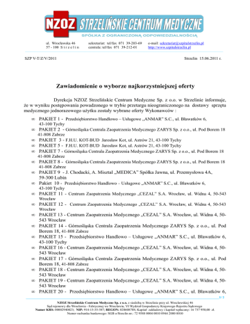 ul. Wrocławska 46 57 - 100 S t r z e l i n sekretariat: tel/fax 071 39-203-69 centrala: tel/fax 071 39-212-01 e-mail: [email protected] http://www.szpitalstrzelin.pl _____________________________________________________________________________________________________________________________________________________________ SZP V-T/Z/V/2011 Strzelin 15.06.2011 r. Zawiadomienie o wyborze najkorzystniejszej oferty Dyrekcja NZOZ Strzelińskie Centrum Medyczne Sp. z o.o. w Strzelinie informuje, że w wyniku postępowania powadzonego w trybie przetargu nieograniczonego na dostawy sprzętu medycznego jednorazowego użytku zostały wybrane oferty Wykonawców : • • • • • • • PAKIET 1 - Przedsiębiorstwo Handlowo – Usługowe „ANMAR” S.C., ul. Bławatków 6, 43-100 Tychy PAKIET 2 - Górnośląska Centrala Zaopatrzenia Medycznego ZARYS Sp. z o.o., ul. Pod Borem 18 41-808 Zabrze PAKIET 3 - F.H.U. KOT-BUD Jarosław Kot, ul. Astrów 21, 43-100 Tychy PAKIET 5 - F.H.U. KOT-BUD Jarosław Kot, ul. Astrów 21, 43-100 Tychy PAKIET 7 - Górnośląska Centrala Zaopatrzenia Medycznego ZARYS Sp. z o.o., ul. Pod Borem 18 41-808 Zabrze PAKIET 8 - Górnośląska Centrala Zaopatrzenia Medycznego ZARYS Sp. z o.o., ul. Pod Borem 18 41-808 Zabrze • PAKIET 9 - J. Chodacki, A. Misztal „MEDICA” Spółka Jawna, ul. Przemysłowa 4A, 59-300 Lubin Pakiet 10 - Przedsiębiorstwo Handlowo – Usługowe „ANMAR” S.C., ul. Bławatków 6, • PAKIET 11 - Centrum Zaopatrzenia Medycznego „CEZAL” S.A. Wrocław, ul. Widna 4, 50-543 43-100 Tychy Wrocław • PAKIET 12 - Centrum Zaopatrzenia Medycznego „CEZAL” S.A. Wrocław, ul. Widna 4, 50-543 • PAKIET 13 - Centrum Zaopatrzenia Medycznego „CEZAL” S.A. Wrocław, ul. Widna 4, 50543 Wrocław PAKIET 14 - Górnośląska Centrala Zaopatrzenia Medycznego ZARYS Sp. z o.o., ul. Pod Borem 18, 41-808 Zabrze PAKIET 15 - Przedsiębiorstwo Handlowo – Usługowe „ANMAR” S.C., ul. Bławatków 6, 43-100 Tychy PAKIET 16 - Centrum Zaopatrzenia Medycznego „CEZAL” S.A. Wrocław, ul. Widna 4, 50543 Wrocław PAKIET 17 - Górnośląska Centrala Zaopatrzenia Medycznego ZARYS Sp. z o.o., ul. Pod Borem 18, 41-808 Zabrze PAKIET 18 - Centrum Zaopatrzenia Medycznego „CEZAL” S.A. Wrocław, ul. Widna 4, 50543 Wrocław PAKIET 19 - Centrum Zaopatrzenia Medycznego „CEZAL” S.A. Wrocław, ul. Widna 4, 50543 Wrocław PAKIET 20 - Przedsiębiorstwo Handlowo – Usługowe „ANMAR” S.C., ul. Bławatków 6, • • • • • • • Wrocław ___________________________________________________________________________________________________________________1/ 2 NZOZ Strzelińskie Centrum Medyczne Sp. z o.o. z siedzibą w Strzelinie przy ul. Wrocławskiej 46 Sąd rejonowy dla Wrocławia - Fabrycznej we Wrocławiu, VI Wydział Gospodarczy Krajowego Rejestru Sądowego Numer KRS: 00002940023; NIP: 914-15-35-587; REGON: 020608708; Kapitał zakładowy i kapitał wpłacony: 16 737 950,00 zł. Numer rachunku bankowego: SGB o/Strzelin nr.: 72 9588 0004 0010 0944 2000 0010 • • • 43-100 Tychy PAKIET 21 - BALTON Sp. z o.o., ul. Nowy Świat 7 m. 14, 00-496 Warszawa PAKIET 22 - BERYL MED Ltd., 1st Floor 26, Foubers Place, London, England W 1F 7PP Adres korespondencyjny: ul. Racławicka 46/6, 30-017 Kraków • PAKIET 23 - Górnośląska Centrala Zaopatrzenia Medycznego ZARYS Sp. z o.o., ul. Pod Borem 18, 41-808 Zabrze PAKIET 25 - Górnośląska Centrala Zaopatrzenia Medycznego ZARYS Sp. z o.o., ul. Pod Borem 18, 41-808 Zabrze PAKIET 26 - Centrum Zaopatrzenia Medycznego „CEZAL” S.A. Wrocław, ul. Widna 4, 50543 Wrocław PAKIET 27 - Centrum Zaopatrzenia Medycznego „CEZAL” S.A. Wrocław, ul. Widna 4, 50543 Wrocław PAKIET 28 - Górnośląska Centrala Zaopatrzenia Medycznego ZARYS Sp. z o.o., ul. Pod Borem 18, 41-808 Zabrze PAKIET 30 - Centrum Zaopatrzenia Medycznego „CEZAL” S.A. Wrocław, ul. Widna 4, 50543 Wrocław PAKIET 32 - Górnośląska Centrala Zaopatrzenia Medycznego ZARYS Sp. z o.o., ul. Pod Borem 18, 41-808 Zabrze PAKIET 34 - Centrum Zaopatrzenia Medycznego „CEZAL” S.A. Wrocław, ul. Widna 4, 50543 Wrocław PAKIET 35 - Górnośląska Centrala Zaopatrzenia Medycznego ZARYS Sp. z o.o., ul. Pod Borem 18, 41-808 Zabrze PAKIET 36 - MERCATOR MEDICAL S.A., Siedziba spółki ul. H. Modrzejewskiej 30, 31-327 • PAKIET 37 - STERIGAT Sp. z o.o., ul. Zaściankowa 50, , 02-989 Warszawa , adres do • • • • • • • • • Kraków korespondencji: ul. Bukowiecka 92 lok. 23, 03-893 Warszawa PAKIET 40 - ECLIPSE Sp. z o.o. Spółka komandytowa, ul. Olszańska 5, 31-513 Kraków Uzasadnienie wyboru Wykonawców: Oferty w powyższym postępowaniu uzyskały największą ilość punktów ze względu na najniższą cenę – zgodnie z oceną ofert dokonaną na podstawie wzoru przyjętego w SIWZ. W pakietach 4, 6, 24, 29, 31, 33, 38 i 39 postępowanie zostało unieważnione na podstawie art. 93 ust. 1 pkt. 1) ustawy Prawo Zamówień Publicznych – nie złożono żadnej oferty. Informacje określone w art. 92 ust. 1 pkt. 1 Pzp Zamawiający podaje w załączniku nr 1. ___________________________________________________________________________________________________________________2/ 2 NZOZ Strzelińskie Centrum Medyczne Sp. z o.o. z siedzibą w Strzelinie przy ul. Wrocławskiej 46 Sąd rejonowy dla Wrocławia - Fabrycznej we Wrocławiu, VI Wydział Gospodarczy Krajowego Rejestru Sądowego Numer KRS: 00002940023; NIP: 914-15-35-587; REGON: 020608708; Kapitał zakładowy i kapitał wpłacony: 16 737 950,00 zł. Numer rachunku bankowego: SGB o/Strzelin nr.: 72 9588 0004 0010 0944 2000 0010