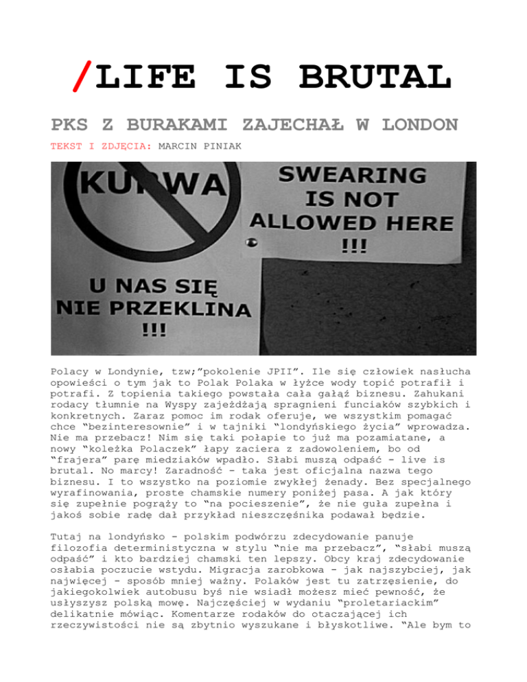 /LIFE IS BRUTAL PKS Z BURAKAMI ZAJECHAŁ W LONDON TEKST I ZDJĘCIA: MARCIN PINIAK Polacy w Londynie, tzw;”pokolenie JPII”. Ile się człowiek nasłucha opowieści o tym jak to Polak Polaka w łyżce wody topić potrafił i potrafi. Z topienia takiego powstała cała gałąź biznesu. Zahukani rodacy tłumnie na Wyspy zajeżdżają spragnieni funciaków szybkich i konkretnych. Zaraz pomoc im rodak oferuje, we wszystkim pomagać chce “bezinteresownie” i w tajniki “londyńskiego życia” wprowadza. Nie ma przebacz! Nim się taki połapie to już ma pozamiatane, a nowy “koleżka Polaczek” łapy zaciera z zadowoleniem, bo od “frajera” parę miedziaków wpadło. Słabi muszą odpaść - live is brutal. No marcy! Zaradność - taka jest oficjalna nazwa tego biznesu. I to wszystko na poziomie zwykłej żenady. Bez specjalnego wyrafinowania, proste chamskie numery poniżej pasa. A jak który się zupełnie pogrąży to “na pocieszenie”, że nie guła zupełna i jakoś sobie radę dał przykład nieszczęśnika podawał będzie. Tutaj na londyńsko - polskim podwórzu zdecydowanie panuje filozofia deterministyczna w stylu “nie ma przebacz”, “słabi muszą odpaść” i kto bardziej chamski ten lepszy. Obcy kraj zdecydowanie osłabia poczucie wstydu. Migracja zarobkowa - jak najszybciej, jak najwięcej - sposób mniej ważny. Polaków jest tu zatrzęsienie, do jakiegokolwiek autobusu byś nie wsiadł możesz mieć pewność, że usłyszysz polską mowę. Najczęściej w wydaniu “proletariackim” delikatnie mówiąc. Komentarze rodaków do otaczającej ich rzeczywistości nie są zbytnio wyszukane i błyskotliwe. “Ale bym to czarną r… “, “patrz tego k… jak wygląda” itp, itd. Tolerancja to nie jest mocna strona Polaków, jest w nas jakaś domniemana wyższość, poczucie “elitarności”. Druga rzecz - mamy coś takiego w twarzach, w sposobie poruszania i wyglądzie, że niemal bezbłędnie rozpoznasz “ziomala”. Polacy szybko orientują się, co mogą od państwa brytyjskiego wydębić, jakie benefity i ulgi, w jaki sposób fiskusa przekręcić i gdzie co pozałatwiać, żeby dobrze było. Dla przykładu - otwierając polską gazetę można dostać oczopląsu od ogłoszeń firm, które oferują swoje usługi “ułatwiające”. Usługi takie głównie bazują na nieznajomości mowy wyspiarskiej i polegają na wydębianiu pieniędzy za załatwienie rzeczy, które mało tego, że darmowe to jeszcze jakby się człowiek uparł to i bez angielskiego by je pozałatwiał. Kolejny “opłacalny” pomysł to tzw: “odsprzedawanie pracy”, czyli można w prasie znaleźć ogłoszenia, które oferują stanowisko pracy, które trzeba odkupić od byłego pracownika. Często “bez językowi” trafiają do polskiego “biznesmena” i tam za mniej niż minimalną stawakę czynią jego biznes “bardziej opłacalnym”. Większość polskich cwaniczków tylko patrzy, by ci nogę podłożyć, gdy nie daj boże lepiej masz od niego, jak pięć funtów więcej na godzinę “wyciągasz”. Głośna sprawa była niedawno jak to polscy robotnicy “zeskłotowali” mieszkanie, które remontowali. Skłotowanie to pewnego rodzaju luka w prawie brytyjskim, która zezwala “zająć” mieszkanie pod nieobecność gospodarza - z tym, że nie można się włamać. I zanim prawnie się sprawę rozwiąże mijają miesiące i skłoters już jest do przodu bo nie płacił za lokum. Jak go w końcu eksmitują (a nie mogą z miejsca na ulicę), to szybcikiem znajduje sobie nową hatę na “zagospodarowanie”. W Londynie Polak Polaka nie lubi z gruntu. Zabiera mu tutaj potencjalne możliwości i pieniądze. A jeszcze jak po angielsku dobrze mówi, to już kaplica. Polska specjalizacja - bezinteresowna zawieść. W tym bez wątpienia jesteśmy fachowcami. PARADYZINE.WORDPRESS.COM