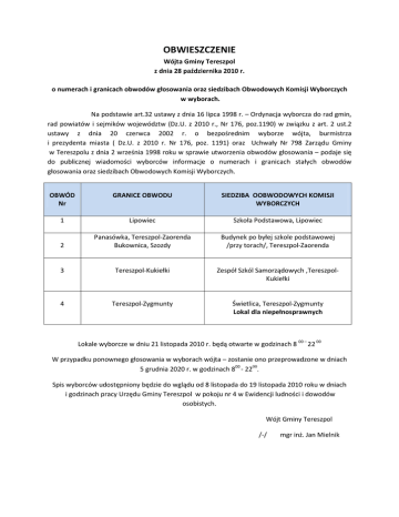 OBWIESZCZENIE Wójta Gminy Tereszpol z dnia 28 października 2010 r. o numerach i granicach obwodów głosowania oraz siedzibach Obwodowych Komisji Wyborczych w wyborach. Na podstawie art.32 ustawy z dnia 16 lipca 1998 r. – Ordynacja wyborcza do rad gmin, rad powiatów i sejmików województw (Dz.U. z 2010 r., Nr 176, poz.1190) w związku z art. 2 ust.2 ustawy z dnia 20 czerwca 2002 r. o bezpośrednim wyborze wójta, burmistrza i prezydenta miasta ( Dz.U. z 2010 r. Nr 176, poz. 1191) oraz Uchwały Nr 798 Zarządu Gminy w Tereszpolu z dnia 2 września 1998 roku w sprawie utworzenia obwodów głosowania – podaje się do publicznej wiadomości wyborców informacje o numerach i granicach stałych obwodów głosowania oraz siedzibach Obwodowych Komisji Wyborczych. OBWÓD Nr GRANICE OBWODU SIEDZIBA OOBWODOWYCH KOMISJI WYBORCZYCH 1 Lipowiec Szkoła Podstawowa, Lipowiec 2 Panasówka, Tereszpol-Zaorenda Bukownica, Szozdy Budynek po byłej szkole podstawowej /przy torach/, Tereszpol-Zaorenda 3 Tereszpol-Kukiełki Zespół Szkól Samorządowych ,TereszpolKukiełki 4 Tereszpol-Zygmunty Świetlica, Tereszpol-Zygmunty Lokal dla niepełnosprawnych Lokale wyborcze w dniu 21 listopada 2010 r. będą otwarte w godzinach 8 00 – 22 00 W przypadku ponownego głosowania w wyborach wójta – zostanie ono przeprowadzone w dniach 5 grudnia 2020 r. w godzinach 800 - 2200. Spis wyborców udostępniony będzie do wglądu od 8 listopada do 19 listopada 2010 roku w dniach i godzinach pracy Urzędu Gminy Tereszpol w pokoju nr 4 w Ewidencji ludności i dowodów osobistych. Wójt Gminy Tereszpol /-/ mgr inż. Jan Mielnik