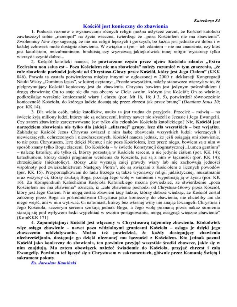 Katecheza 84 Kościół jest konieczny do zbawienia 1. Podczas rozmów z wyznawcami różnych religii można usłyszeć zarzut, że Kościół katolicki zawłaszczył sobie „monopol” na życie wieczne, twierdząc że „poza Kościołem nie ma zbawienia”. Zwolennicy New Age sugerują, że nie ma religii lepszych i gorszych, bo każda jest jednakowo dobra i w każdej człowiek może dostąpić zbawienia. W związku z tym – ich zdaniem – nie ma znaczenia, czy ktoś jest katolikiem, muzułmaninem, hinduistą czy wyznawcą jakiejkolwiek innej religii: wystarczy tylko wierzyć i czynić dobro... 2. Kościół katolicki naucza, że powtarzane często przez ojców Kościoła zdanie: „Extra Ecclesiam non salus est – Poza Kościołem nie ma zbawienia” należy rozumieć w tym znaczeniu, „że całe zbawienie pochodzi jedynie od Chrystusa-Głowy przez Kościół, który jest Jego Ciałem” (KKK 846). Prawda ta została potwierdzona między innymi w ogłoszonej w 2000 r. deklaracji Kongregacji Nauki Wiary „Dominus Iesus”, w której czytamy: „Przede wszystkim, należy stanowczo wierzyć w to, że pielgrzymujący Kościół konieczny jest do zbawienia. Chrystus bowiem jest jedynym pośrednikiem i drogą zbawienia; On to staje się dla nas obecny w Ciele swoim, którym jest Kościół; On to właśnie, podkreślając wyraźnie konieczność wiary i chrztu (por. Mt 16, 16; J 3, 5), potwierdził równocześnie konieczność Kościoła, do którego ludzie dostają się przez chrzest jak przez bramę” (Dominus Iesus 20; por. KK 14). 3. Dla wielu osób, także katolików, nauka ta jest trudna do przyjęcia. Przecież – mówią – na świecie żyją miliony ludzi, którzy nie są ochrzczeni, którzy nawet nie słyszeli o Jezusie i Jego Ewangelii. Czy zatem zbawienie zarezerwowane jest tylko dla członków Kościoła katolickiego? Nie, Kościół jest narzędziem zbawienia nie tylko dla jakiejś „elitarnej” grupy, lecz dla wszystkich – bez wyjątku. Zakładając Kościół Jezus Chrystus związał z nim łaskę zbawienia wszystkich ludzi: wierzących i niewierzących, ochrzczonych i nieochrzczonych. Kościół naucza jednak, że jeśli osiągają oni zbawienie, to nie poza Chrystusem, lecz dzięki Niemu; i nie poza Kościołem, lecz przez niego, bowiem są z nim w sposób znany tylko Bogu złączeni. Do Kościoła – w świetle Konstytucji dogmatycznej „Lumen gentium” – należą: katolicy, ale tylko ci, którzy pozostają w Kościele sercem, a nie jedynie ciałem (por. KK 14); katechumeni, którzy dzięki pragnieniu wcielenia do Kościoła, już są z nim w łączności (por. KK 14); chrześcijanie (niekatolicy), którzy „nie wyznają całej prawdy wiary lub nie zachowują jedności wspólnoty pod zwierzchnictwem Następcy Piotra”, ale są związani z Kościołem z licznych powodów (por. KK 15). Przyporządkowani do ludu Bożego są także wyznawcy religii judaistycznej, muzułmanie oraz wszyscy ci, którzy szukają Boga, poznają Jego wolę w sumieniu i wypełniają ją w życiu (por. KK 16). Za Kompendium Katechizmu Kościoła Katolickiego można powiedzieć, że stwierdzenie „poza Kościołem nie ma zbawienia” oznacza, iż „całe zbawienie pochodzi od Chrystusa-Głowy przez Kościół, który jest Jego Ciałem. Nie mogą zostać zbawieni tacy ludzie, którzy dobrze wiedząc, że Kościół został założony przez Boga za pośrednictwem Chrystusa jako konieczny do zbawienia, nie chcieliby ani do niego wejść, ani w nim wytrwać. Ci natomiast, którzy bez własnej winy nie znając Ewangelii Chrystusa i Jego Kościoła, szczerym sercem szukają jednak Boga, a Jego wolę poznaną przez nakaz sumienia starają się pod wpływem łaski wypełniać w swoim postępowaniu, mogą osiągnąć wieczne zbawienie” (KomKKK 171). 4. Zapamiętajmy: Kościół jest włączony w Chrystusową tajemnicę zbawienia. Ktokolwiek więc osiąga zbawienie – nawet poza widzialnymi granicami Kościoła – osiąga je dzięki jego zbawczemu oddziaływaniu. Można też powiedzieć, że każdy dostępujący zbawienia niechrześcijanin, dostępuje go dzięki nieznanej mu łączności z Kościołem. Kto jednak poznał Kościół jako konieczny do zbawienia, ten powinien przyjąć wszystkie środki zbawcze, jakie się w nim znajdują. Ma zatem obowiązek należeć świadomie do Kościoła, przyjąć chrzest i całą Ewangelię. Powinien też łączyć się z Chrystusem w sakramentach, głównie przez Komunię Świętą i sakrament pokuty. Ks. Jarosław Kamiński