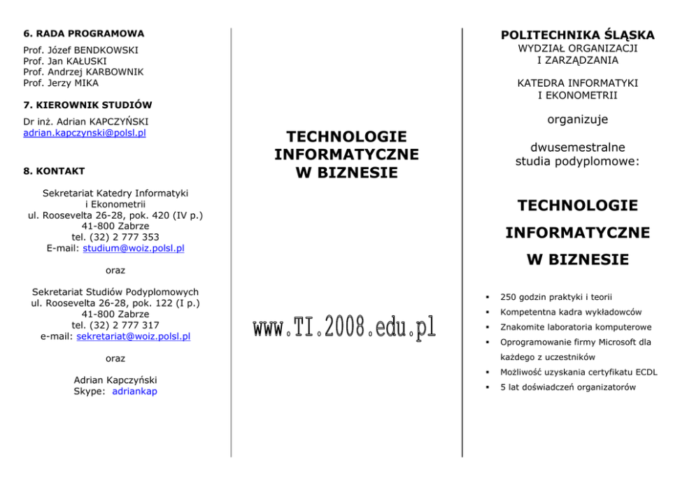 6. RADA PROGRAMOWA Prof. Prof. Prof. Prof. POLITECHNIKA ŚLĄSKA WYDZIAŁ ORGANIZACJI I ZARZĄDZANIA Józef BENDKOWSKI Jan KAŁUSKI Andrzej KARBOWNIK Jerzy MIKA KATEDRA INFORMATYKI I EKONOMETRII 7. KIEROWNIK STUDIÓW Dr inŜ. Adrian KAPCZYŃSKI [email protected] 8. KONTAKT organizuje TECHNOLOGIE INFORMATYCZNE W BIZNESIE dwusemestralne studia podyplomowe: Sekretariat Katedry Informatyki i Ekonometrii ul. Roosevelta 26-28, pok. 420 (IV p.) 41-800 Zabrze tel. (32) 2 777 353 E-mail: [email protected] TECHNOLOGIE INFORMATYCZNE W BIZNESIE oraz Sekretariat Studiów Podyplomowych ul. Roosevelta 26-28, pok. 122 (I p.) 41-800 Zabrze tel. (32) 2 777 317 e-mail: [email protected] 250 godzin praktyki i teorii Kompetentna kadra wykładowców Znakomite laboratoria komputerowe Oprogramowanie firmy Microsoft dla kaŜdego z uczestników oraz Adrian Kapczyński Skype: adriankap MoŜliwość uzyskania certyfikatu ECDL 5 lat doświadczeń organizatorów 1. CEL STUDIÓW Celem studiów jest przygotowanie słuchaczy do efektywnego stosowania nowoczesnych technologii informatycznych w prowadzeniu biznesu. W trakcie zajęć słuchacze poznają, w zakresie teorii (wykłady i seminaria) i praktyki (laboratoria) zasady funkcjonowania oraz moŜliwości systemów informatycznych klasy ERP, sieci komputerowych, technologii internetowych, relacyjnych baz danych, systemów sztucznej inteligencji, wybranych aplikacji narzędziowych oraz narzędzi i systemów Open source, a takŜe innych zagadnień związanych z informatyką – m.in. CRM, aspekty prawne oraz bezpieczeństwo systemów komputerowych. JeŜeli zaleŜy Państwu na uzupełnieniu treści programowych o interesujący temat, prosimy o kontakt drogą poczty elektronicznej: [email protected]. w godz. od 9:00 do 16:45 na Wydziale Organizacji i Zarządzania w Zabrzu. Tematyka studiów obejmuje: Uczestnik zobowiązany jest do zaliczenia wszystkich przedmiotów oraz napisania pracy końcowej. Obrona pracy przewidziana jest po 12 miesiącach od rozpoczęcia zajęć. 3. WARUNKI UCZESTNICTWA Kandydaci powinni posiadać dyplom magistra, magistra inŜyniera, inŜyniera lub licencjata. Studia prowadzone są w zjazdach (sobota-niedziela) co dwa tygodnie, 1. Aspekty prawne w informatyce 2. Bazy danych i inteligencja biznesowa 3. Bezpieczeństwo systemów komputerowych 4. Inteligentne systemy wspomagania decyzji 5. Otwarte oprogramowanie w zastosowaniach biznesowych 6. Podstawy technologii informatycznych 7. Seminarium dyplomowe Opłata wynosi 3900 zł za dwa semestry (moŜe być wniesiona w ratach). 8. Sieci komputerowe 4. ZAPISY 11. UŜytkowanie programów narzędziowych Prosimy o kontakt telefoniczny poprzez pocztę elektroniczną: • 2. ORGANIZACJA ZAJĘĆ Studia trwają dwa semestry, i obejmują 250 godzin zajęć teoretycznych oraz praktycznych. Rozpoczynamy 04.10.2008 r. 5. TEMATYKA STUDIÓW Sekretariat Katedry Informatyki i Ekonometrii tel.: (32) 2 777 353, e-mail: [email protected] 10. Technologie internetowe i elektroniczny biznes 12. Wykorzystanie platformy Microsoft .NET w przedsiębiorstwie 13. Zarządzanie informacją 14. Zarządzanie projektami 15. Zintegrowane informatyczne systemy zarządzania RAZEM: 250 godz. lub • lub 9. Studium przypadku: CRM Sekretariat Studiów Podyplomowych, tel. (32) 2 777 317, e-mail: [email protected]
