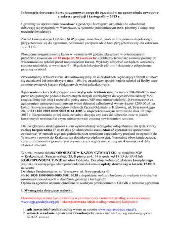 Informacja dotycząca kursu przygotowawczego do egzaminów na uprawnienia zawodowe z zakresu geodezji i kartografii w 2013 r. Egzaminy na uprawnienia zawodowe z geodezji i kartografii aktualnie (do odwołania) odbywają się wyłącznie w Warszawie, w systemie jednodniowym (test, pisemny i ustny oraz rozdanie świadectw). Zarząd krakowskiego Oddziału SGP pragnąc umożliwić, osobom z regionu małopolskiego, przygotowanie się do egzaminu, postanowił przeprowadzić kurs przygotowawczy dla zakresów 1, 2, 4 i 5. Planujemy zorganizowanie kursu w wymiarze 60 godzin lekcyjnych w orientacyjnym przedziale czasowym od 25 maja do 30 czerwca br. (dokładny terminarz zostanie podany do wiadomości na tydzień przed rozpoczęciem kursu). Wykłady odbywać się będą w weekendy (sobota-niedziela), w wymiarze 9 - 10 godzin lekcyjnych (45 min.) dziennie z półgodzinną przerwą na obiad. Przewidujemy iż koszt kursu, skalkulowany przy 18 uczestnikach, wynoszący1200,00 zł. może się zwiększyć lub zmniejszyć o max. 10% i w zasadniczy sposób będzie zależał od liczby osób zainteresowanych kursem (dokonanych wpłat zaliczkowych). Zgłoszenia na kurs będą przyjmowane wyłącznie telefonicznie, na numer 784-186-828 (sms) przez obligatoryjne podanie kompletnych danych niezbędnych do wystawienia faktury VAT (nazwa firmy lub imię i nazwisko, pełny adres, NIP oraz numer telefonu). Równocześnie ze zgłoszeniem zainteresowani kursem winni dokonać zaliczkowej wpłaty kwoty 1200,00 zł. na konto: Stowarzyszenie Geodetów Polskich Zarząd Oddziału w Krakowie, ul. Straszewskiego 28, nr 83 1020 2892 0000 5002 0161 4205 w nieprzekraczalnym terminie do dnia 10 maja 2013 r. Bezpośrednio po tej dacie zapadnie decyzja czy kurs się odbędzie, oraz w jakich konkretnych terminach o czym zainteresowani zostaną powiadomieni sms-em. Dla zwiększenia atrakcyjności kursu wprowadzamy szczególne udogodnienie dla tych, którzy zechcą bezpośrednio (7 do10 dni) po ukończeniu kursu zdawać egzamin na uprawnienia zawodowe. W ramach tego udogodnienia poza terminem zapewniamy przejazd na egzamin do Warszawy i powrót do Krakowa (za dodatkową odpłatnością). Normalnie obowiązuje zasada, iż termin zdawania egzaminu jest wyznaczany z reguły nie później niż 4 miesiące od daty złożenia wniosku. Wnioski można składać OSOBIŚCIE w KAŻDY CZWARTEK, w siedzibie SGP w Krakowie, ul. Straszewskiego 28, II piętro, pok. 14 w godz. od 18:15 do 19:45 lub KORESPO8DE8CYJ8IE na adres Oddziału. Decyduje kolejność złożenia kompletnego wniosku zawierającego także potwierdzenie dokonania opłaty skarbowej w kwocie 17.00 zł. na konto: Dzielnica Śródmieście m. st. Warszawy, ul. Nowogrodzka 43 Nr 60 1030 1508 0000 0005 5001 0038 z dopiskiem: opłata skarbowa za wydanie świadectwa uprawnień zawodowych w dziedzinie geodezji i kartografii. Opłata za egzamin zostanie określona w osobnym powiadomieniu GUGiK o terminie egzaminu I. Wymagania dotyczące wniosku: Dokumentacja winna być oprawiona w przeźroczysty skoroszyt (według wzoru na stronie www.sgp.geodezja.org.pl} i skompletowana ściśle według poniższej kolejności: 1. spis zawartości teczki (według wzoru na stronie www.sgp.geodezja.org.pl), 2. wniosek o nadanie uprawnień zawodowych (winien być złożony wg ustalonego przez GUGiK wzoru), 3. dwie (podpisane) fotografie o wymiarach 36 x 45 mm, 4. opis prac wykonanych w ramach praktyki zawodowej, (uznanych przez osobę zainteresowaną za istotne. Bezwzględnie opis ma być napisany czytelnie, pismem technicznym lub drukiem, oraz ma być odpowiednio rozbudowany. Komisja oceniające ten opis powinna być przekonane, że wnioskodawca brał udział przy wykonywaniu tych prac). 5. wykaz prac wykonanych w ramach praktyki zawodowej (według ujednoliconego wzoru GUGiK, poświadczony przez pracodawcę. Może być odrębnie napisane oświadczenie pracodawcy), 6. oświadczenie osoby zainteresowanej o niekaralności (wg wzoru GUGiK), 7. dowód dokonanej opłaty skarbowej, 8. dane potrzebne do wystawienia faktury VAT (bezwzgłędnie obowiązujące), 9. odpis lub kserokopia dyplomu/świadectwa szkolnego,( potwierdzona przez notariusza lub uprawnioną szkołę za zgodność z oryginałem). 10. odpis lub kserokopia aktu małżeńskiego (w wypadku rozbieżności nazwiska na dyplomie lub świadectwie z aktualnie używanym wg dowodu osobistego, potwierdzona przez notariusza za zgodność z oryginałem) 11. kopia świadectwa uprawnień zawodowych (potwierdzona przez notariusza za zgodność z oryginałem). 12. dokumenty potwierdzające staż pracy zawodowej (kserokopię świadectwa pracy potwierdzoną przez notariusza za zgodność z oryginałem bądź, zaświadczenie aktualnego pracodawcy określające rodzaj umowy, czasokres i wymiar zatrudnienia. Trzeba wyszczególnić w spisie każdy z nich oddzielnie). 13. inne dokumenty mające wpływ na ocenę dotychczasowego dorobku zawodowego (trzeba wyszczególnić w spisie każdy z nich oddzielnie). Poszczególnych kart nie należy zszywać zszywkami, ani wkładać pojedynczo kart do koszulek plastikowych.(za wyjątkiem zdjęć, które należy umieścić w koszulce). Wszystkie karty muszą być ponumerowane. W8IOSKI 8IEKOMPLET8E 8IE BĘDĄ PRZYJMOWA8E, A PRZESŁA8E POCZTĄ BĘDĄ ZWRACA8E. II. Wnioski można składać OSOBIŚCIE w KAŻDY CZWARTEK, w siedzibie SGP w Krakowie, ul. Straszewskiego 28, II piętro, pok. 14 w godz. od 18:15 do 19:45 lub KORESPO8DE8CYJ8IE na adres Oddziału. Decyduje kolejność złożenia kompletnego wniosku zawierającego także potwierdzenie dokonania opłaty skarbowej w kwocie 17.00 zł. na konto: Dzielnica Śródmieście m. st. Warszawy, ul. Nowogrodzka 43 Nr 60 1030 1508 0000 0005 5001 0038 z dopiskiem: opłata skarbowa za wydanie świadectwa uprawnień zawodowych w dziedzinie geodezji i kartografii. Wysokość opłaty za egzamin zostanie określona w osobnym powiadomieniu GUGiK o terminie egzaminu. Ilość osób mogących zdawać egzamin bez