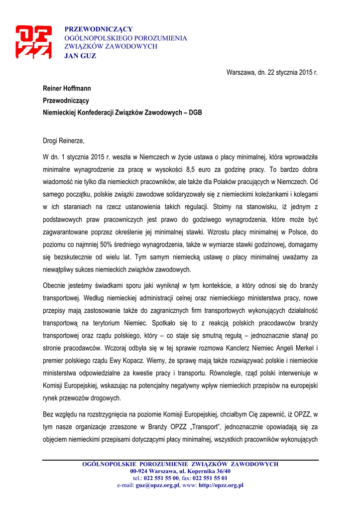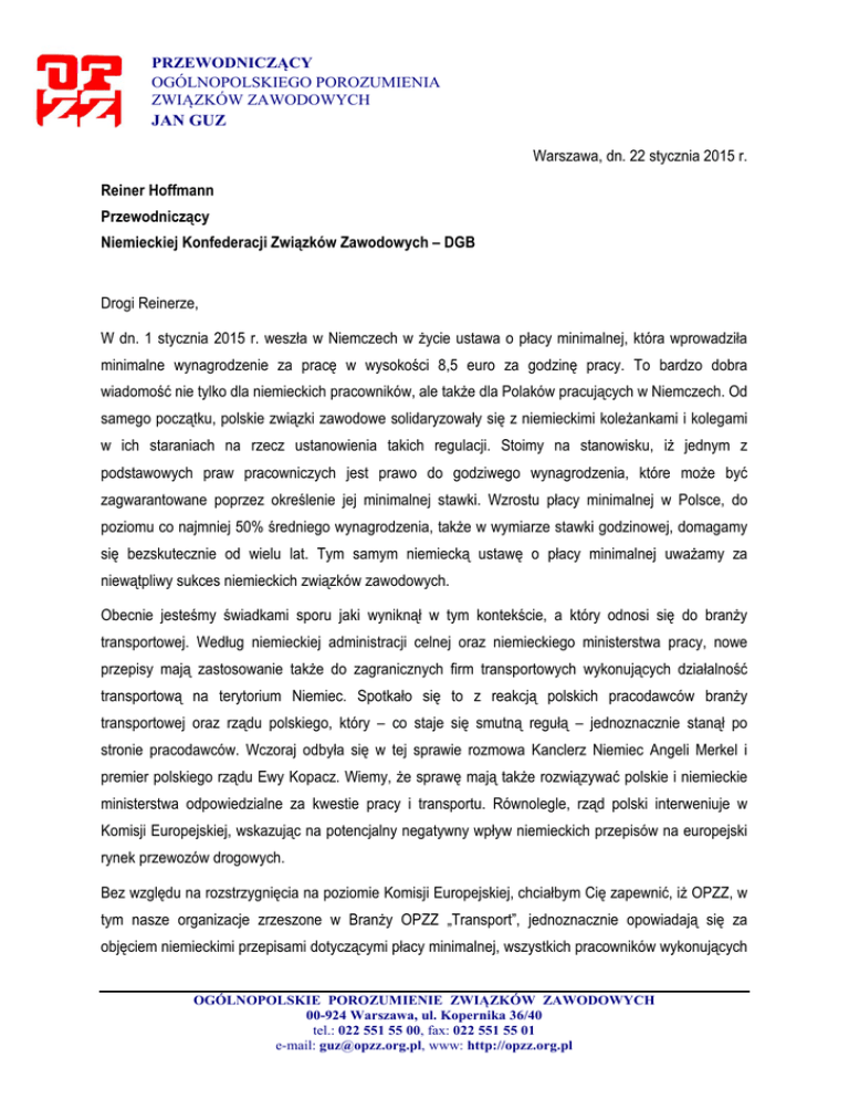 PRZEWODNICZĄCY OGÓLNOPOLSKIEGO POROZUMIENIA ZWIĄZKÓW ZAWODOWYCH JAN GUZ Warszawa, dn. 22 stycznia 2015 r. Reiner Hoffmann Przewodniczący Niemieckiej Konfederacji Związków Zawodowych – DGB Drogi Reinerze, W dn. 1 stycznia 2015 r. weszła w Niemczech w życie ustawa o płacy minimalnej, która wprowadziła minimalne wynagrodzenie za pracę w wysokości 8,5 euro za godzinę pracy. To bardzo dobra wiadomość nie tylko dla niemieckich pracowników, ale także dla Polaków pracujących w Niemczech. Od samego początku, polskie związki zawodowe solidaryzowały się z niemieckimi koleżankami i kolegami w ich staraniach na rzecz ustanowienia takich regulacji. Stoimy na stanowisku, iż jednym z podstawowych praw pracowniczych jest prawo do godziwego wynagrodzenia, które może być zagwarantowane poprzez określenie jej minimalnej stawki. Wzrostu płacy minimalnej w Polsce, do poziomu co najmniej 50% średniego wynagrodzenia, także w wymiarze stawki godzinowej, domagamy się bezskutecznie od wielu lat. Tym samym niemiecką ustawę o płacy minimalnej uważamy za niewątpliwy sukces niemieckich związków zawodowych. Obecnie jesteśmy świadkami sporu jaki wyniknął w tym kontekście, a który odnosi się do branży transportowej. Według niemieckiej administracji celnej oraz niemieckiego ministerstwa pracy, nowe przepisy mają zastosowanie także do zagranicznych firm transportowych wykonujących działalność transportową na terytorium Niemiec. Spotkało się to z reakcją polskich pracodawców branży transportowej oraz rządu polskiego, który – co staje się smutną regułą – jednoznacznie stanął po stronie pracodawców. Wczoraj odbyła się w tej sprawie rozmowa Kanclerz Niemiec Angeli Merkel i premier polskiego rządu Ewy Kopacz. Wiemy, że sprawę mają także rozwiązywać polskie i niemieckie ministerstwa odpowiedzialne za kwestie pracy i transportu. Równolegle, rząd polski interweniuje w Komisji Europejskiej, wskazując na potencjalny negatywny wpływ niemieckich przepisów na europejski rynek przewozów drogowych. Bez względu na rozstrzygnięcia na poziomie Komisji Europejskiej, chciałbym Cię zapewnić, iż OPZZ, w tym nasze organizacje zrzeszone w Branży OPZZ „Transport”, jednoznacznie opowiadają się za objęciem niemieckimi przepisami dotyczącymi płacy minimalnej, wszystkich pracowników wykonujących OGÓLNOPOLSKIE POROZUMIENIE ZWIĄZKÓW ZAWODOWYCH 00-924 Warszawa, ul. Kopernika 36/40 tel.: 022 551 55 00, fax: 022 551 55 01 e-mail: [email protected], www: http://opzz.org.pl pracę na terenie Niemiec, a w szczególności polskie firmy spedycyjne zatrudniające kierowców, którzy wykonują przewozy na terenie Niemiec. Pragnę podkreślić, iż sprawa ta w żaden sposób nie była przedmiotem jakichkolwiek konsultacji w ramach dialogu społecznego, który w Polsce wciąż jest w zawieszeniu od czerwca 2013 roku. Rząd polski postanowił być wyłącznie wyrazicielem interesów pracodawców, uznając iż polski pracownik może być nierówno traktowany. Z przykrością stwierdzam zatem, iż to polskie i niemieckie związki zawodowe, we współpracy z rządem niemieckim, w większym stopniu troszczą się o godziwe wynagrodzenie dla polskich pracowników, niż rząd polski. OPZZ od wielu lat domaga się ujednolicenia standardów socjalnych, w tym tych odnoszących się do minimalnego wynagrodzenia na poziomie europejskim, w myśl zasady: „równa płaca, za tę samą pracę”. Jak pamiętasz, w ostatnich tygodniach, dość często wymienialiśmy poglądy na tej sprawie i byliśmy zgodni, iż nie możemy pozwolić, aby polscy pracownicy byli dyskryminowani na niemieckim rynku pracy. Tylko w ten sposób możemy walczyć z nierównościami, niesprawiedliwością, a także z dumpingiem społecznym i dumpingiem płacowym, czyli z jednymi z największych zagrożeń dla europejskiego modelu społecznego. Pragnę Cię poinformować, iż polskie związki zawodowe branży transportowej podjęły działania na rzecz ustanowienia sektorowego układu zbiorowego pracy w Polsce, który uwzględniałby także kwestie płacy minimalnej. Chciałbym Cię zapewnić o naszym wsparciu dla Waszych starań o zapewnienie wszystkim pracownikom wykonującym pracę na terenie Niemiec jednolitych standardów pracy i wynagrodzenia. Zwracam się do Ciebie o podjęcie niezbędnych działań na rzecz objęcia minimalnym wynagrodzeniem polskich pracowników transportowych. Jestem gotowy do udzielenia Ci wszelkich dodatkowych wyjaśnień, które związane są z powyższą sprawą. Ze związkowym pozdrowieniem, Jan Guz, przewodniczący OPZZ