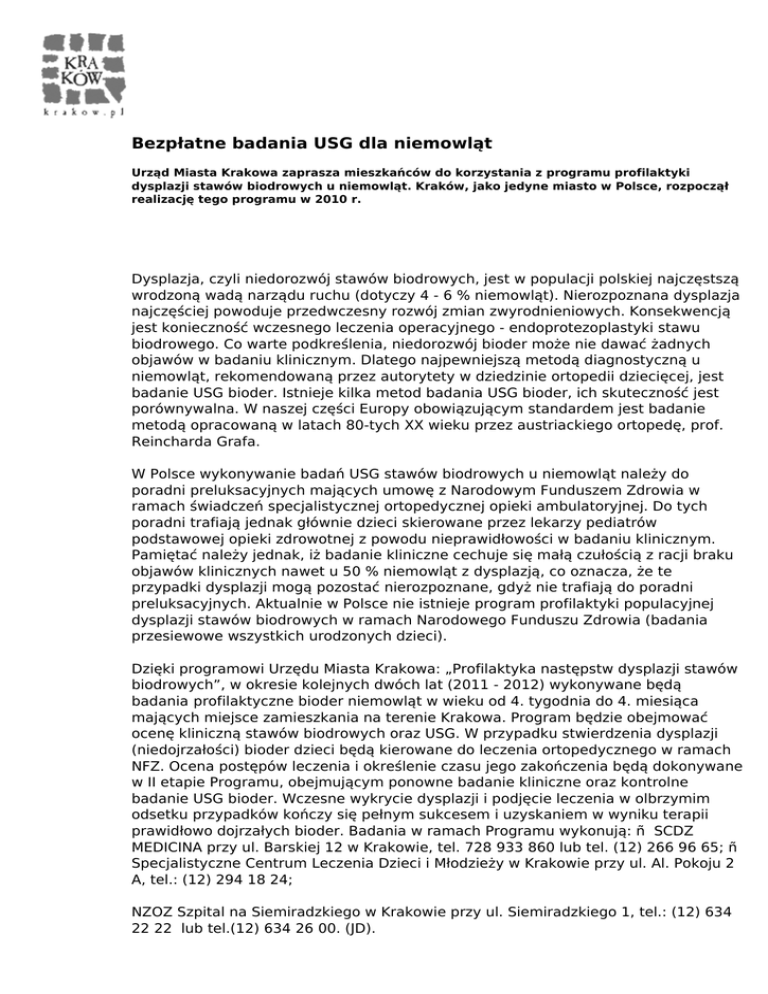 Bezpłatne badania USG dla niemowląt Urząd Miasta Krakowa zaprasza mieszkańców do korzystania z programu profilaktyki dysplazji stawów biodrowych u niemowląt. Kraków, jako jedyne miasto w Polsce, rozpoczął realizację tego programu w 2010 r. Dysplazja, czyli niedorozwój stawów biodrowych, jest w populacji polskiej najczęstszą wrodzoną wadą narządu ruchu (dotyczy 4 - 6 % niemowląt). Nierozpoznana dysplazja najczęściej powoduje przedwczesny rozwój zmian zwyrodnieniowych. Konsekwencją jest konieczność wczesnego leczenia operacyjnego - endoprotezoplastyki stawu biodrowego. Co warte podkreślenia, niedorozwój bioder może nie dawać żadnych objawów w badaniu klinicznym. Dlatego najpewniejszą metodą diagnostyczną u niemowląt, rekomendowaną przez autorytety w dziedzinie ortopedii dziecięcej, jest badanie USG bioder. Istnieje kilka metod badania USG bioder, ich skuteczność jest porównywalna. W naszej części Europy obowiązującym standardem jest badanie metodą opracowaną w latach 80-tych XX wieku przez austriackiego ortopedę, prof. Reincharda Grafa. W Polsce wykonywanie badań USG stawów biodrowych u niemowląt należy do poradni preluksacyjnych mających umowę z Narodowym Funduszem Zdrowia w ramach świadczeń specjalistycznej ortopedycznej opieki ambulatoryjnej. Do tych poradni trafiają jednak głównie dzieci skierowane przez lekarzy pediatrów podstawowej opieki zdrowotnej z powodu nieprawidłowości w badaniu klinicznym. Pamiętać należy jednak, iż badanie kliniczne cechuje się małą czułością z racji braku objawów klinicznych nawet u 50 % niemowląt z dysplazją, co oznacza, że te przypadki dysplazji mogą pozostać nierozpoznane, gdyż nie trafiają do poradni preluksacyjnych. Aktualnie w Polsce nie istnieje program profilaktyki populacyjnej dysplazji stawów biodrowych w ramach Narodowego Funduszu Zdrowia (badania przesiewowe wszystkich urodzonych dzieci). Dzięki programowi Urzędu Miasta Krakowa: „Profilaktyka następstw dysplazji stawów biodrowych”, w okresie kolejnych dwóch lat (2011 - 2012) wykonywane będą badania profilaktyczne bioder niemowląt w wieku od 4. tygodnia do 4. miesiąca mających miejsce zamieszkania na terenie Krakowa. Program będzie obejmować ocenę kliniczną stawów biodrowych oraz USG. W przypadku stwierdzenia dysplazji (niedojrzałości) bioder dzieci będą kierowane do leczenia ortopedycznego w ramach NFZ. Ocena postępów leczenia i określenie czasu jego zakończenia będą dokonywane w II etapie Programu, obejmującym ponowne badanie kliniczne oraz kontrolne badanie USG bioder. Wczesne wykrycie dysplazji i podjęcie leczenia w olbrzymim odsetku przypadków kończy się pełnym sukcesem i uzyskaniem w wyniku terapii prawidłowo dojrzałych bioder. Badania w ramach Programu wykonują: ñ SCDZ MEDICINA przy ul. Barskiej 12 w Krakowie, tel. 728 933 860 lub tel. (12) 266 96 65; ñ Specjalistyczne Centrum Leczenia Dzieci i Młodzieży w Krakowie przy ul. Al. Pokoju 2 A, tel.: (12) 294 18 24; NZOZ Szpital na Siemiradzkiego w Krakowie przy ul. Siemiradzkiego 1, tel.: (12) 634 22 22 lub tel.(12) 634 26 00. (JD). Powered by TCPDF (www.tcpdf.org)