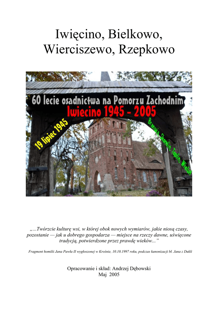 Iwięcino, Bielkowo, Wierciszewo, Rzepkowo „...Twórzcie kulturę wsi, w której obok nowych wymiarów, jakie niosą czasy, pozostanie — jak u dobrego gospodarza — miejsce na rzeczy dawne, uświęcone tradycją, potwierdzone przez prawdę wieków...” Fragment homilii Jana Pawła II wygłoszonej w Krośnie, 10.10.1997 roku, podczas kanonizacji bł. Jana z Dukli Opracowanie i skład: Andrzej Dębowski Maj 2005
