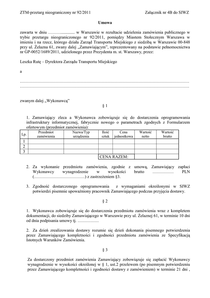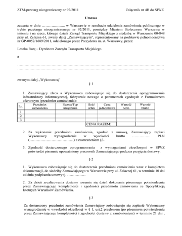 ZTM-przetarg nieograniczony nr 92/2011 Załącznik nr 4B do SIWZ Umowa zawarta w dniu ………............. w Warszawie w rezultacie udzielenia zamówienia publicznego w trybie przetargu nieograniczonego nr 92/2011, pomiędzy Miastem Stołecznym Warszawa w imieniu i na rzecz, którego działa Zarząd Transportu Miejskiego z siedzibą w Warszawie 00-848 przy ul. Żelazna 61, zwany dalej „Zamawiającym”, reprezentowany na podstawie pełnomocnictwa nr GP-0052/1689/2011, udzielonego przez Prezydenta m. st. Warszawy, przez: Leszka Rutę – Dyrektora Zarządu Transportu Miejskiego a ………………………………………………………………………………………………………… ………………………………………………………………………………………………………… zwanym dalej „Wykonawcą” §1 1. Zamawiający zleca a Wykonawca zobowiązuje się do dostarczenia oprogramowania infrastruktury informatycznej, fabrycznie nowego o parametrach zgodnych z Formularzem ofertowym (przedmiot zamówienia): Lp. Przedmiot zamówienia Nazwa/Typ urządzenia Ilość sztuk Cena jednostkowa Wartość netto Wartość brutto 1 2 3 CENA RAZEM: 2. Za wykonanie przedmiotu zamówienia, zgodnie z umową, Zamawiający zapłaci brutto …………… PLN Wykonawcy wynagrodzenie w wysokości (………………………………) z zastrzeżeniem §3. 3. Zgodność dostarczonego oprogramowania z wymaganiami określonymi w SIWZ potwierdzi pisemnie upoważniony pracownik Zamawiającego podczas przyjęcia dostawy. §2 1. Wykonawca zobowiązuje się do dostarczenia przedmiotu zamówienia wraz z kompletem dokumentacji, do siedziby Zamawiającego w Warszawie przy ul. Żelaznej 61, w terminie 10 dni od dnia podpisania umowy tj. …………… 2. Za dzień zrealizowania dostawy rozumie się dzień dokonania pisemnego potwierdzenia przez Zamawiającego kompletności i zgodności przedmiotu zamówienia ze Specyfikacją Istotnych Warunków Zamówienia. §3 Za dostarczony przedmiot zamówienia Zamawiający zobowiązuje się zapłacić Wykonawcy wynagrodzenie w wysokości określonej w § 1, ust.2 przelewem (po pisemnym potwierdzeniu przez Zamawiającego kompletności i zgodności dostawy z zamówieniem) w terminie 21 dni , ale nie później niż do dnia 30.12.2011r,od daty otrzymania przez Zamawiającego poprawnie wystawionej faktury VAT, na rachunek w niej wskazany. §4 1. Wraz z dostawą przedmiotu zamówienia, Wykonawca dostarczy dotyczące oprogramowania opisanego w § 1 umowy Karty Gwarancyjne Producenta. 2. Okresy Gwarancji i warunki serwisu określone zostały w Specyfikacji Istotnych Warunków Zamówienia. 3. Termin gwarancji będzie liczony od daty przyjęcia przez Zamawiającego przedmiotu zamówienia zgodnie z § 2 ust. 2. 4. Wykonawca zapewni przyjmowanie zgłoszeń serwisowych od poniedziałku do piątku w godzinach 8 – 16 zgodnie z procedurą opisaną w zał. 1. do niniejszej umowy (Wykonawca dostarczy procedurę przyjmowania zgłoszeń przed podpisaniem umowy). 5. Wykonawca zobowiązuje się do przystąpienia do naprawy gwarancyjnej w następnym dniu roboczym od powiadomienia go o awarii i do określenia terminu wykonania naprawy, który nie może być dłuższy niż 14 dni kalendarzowych, o ile warunki gwarancji nie stanowią inaczej §5 1. Wykonawca zapłaci Zamawiającemu karę umowną za opóźnienie w dostawie kompletnego przedmiotu zamówienia, zgodnego ze złożoną ofertą, w wysokości 1% wartości brutto wynagrodzenia o którym mowa w §1 ust.2, przysługującego za każdy dzień opóźnienia. 2. Wykonawca zapłaci Zamawiającemu karę umowną za każdy dzień opóźnienia w przystąpieniu do naprawy gwarancyjnej w wysokości 1% wartości brutto wynagrodzenia oraz o karę w tej samej wysokości w przypadku gdyby termin naprawy był dłuższy niż 14 dni za każdy następny dzień. 3. W przypadku gdy termin naprawy przekraczałby 14 dni Wykonawca zobowiązany jest na swój koszt do dostarczenia Zamawiającemu oprogramowania zamiennego o takich samych parametrach jak oprogramowania naprawiane do czasu zakończenia jego naprawy. 4. W przypadku, gdyby opóźnienie w dostawie przekroczyło 15 dni Zamawiający ma prawo rozwiązać umowę w trybie natychmiastowym. Zamawiający ma również prawo do naliczenia kar umownych. 5. Zamawiający ma prawo dochodzić odszkodowania przewyższającego karę umowną na zasadach ogólnych. 6. Wykazanie przez Wykonawcę braku winy w sytuacjach określonych w ust. 1, 2, 4 nie zwalnia go od obowiązku zapłaty naliczonych przez zamawiającego kar umownych. §6 1. W razie wystąpienia istotnej zmiany okoliczności powodującej, że wykonanie umowy nie będzie służyło interesowi publicznemu, czego nie można było przewidzieć w chwili zawarcia umowy, Zamawiający może odstąpić od umowy. 2. W takim wypadku Wykonawca może żądać wyłącznie wynagrodzenia należnego z tytułu wykonania części umowy. 2 §7 Integralną częścią umowy są oferta złożona przez Wykonawcę oraz Specyfikacja Istotnych Warunków Zamówienia, których postanowienia wiążą obie strony umowy. §8 W sprawach nie uregulowanych niniejszą umową mają zastosowanie przepisy kodeksu cywilnego oraz Prawo zamówień publicznych Dz. U. z 2010 r. Nr 113 poz. 759 z późniejszymi zmianami. §9 Wszelkie spory wynikłe na tle realizacji niniejszej umowy rozstrzygane będą przez sąd powszechny właściwy dla siedziby Zamawiającego. § 10 Umowę sporządzono w dwóch jednobrzmiących egzemplarzach, po jednym egzemplarzu dla każdej ze Stron. ZAMAWIAJĄCY WYKONAWCA 3