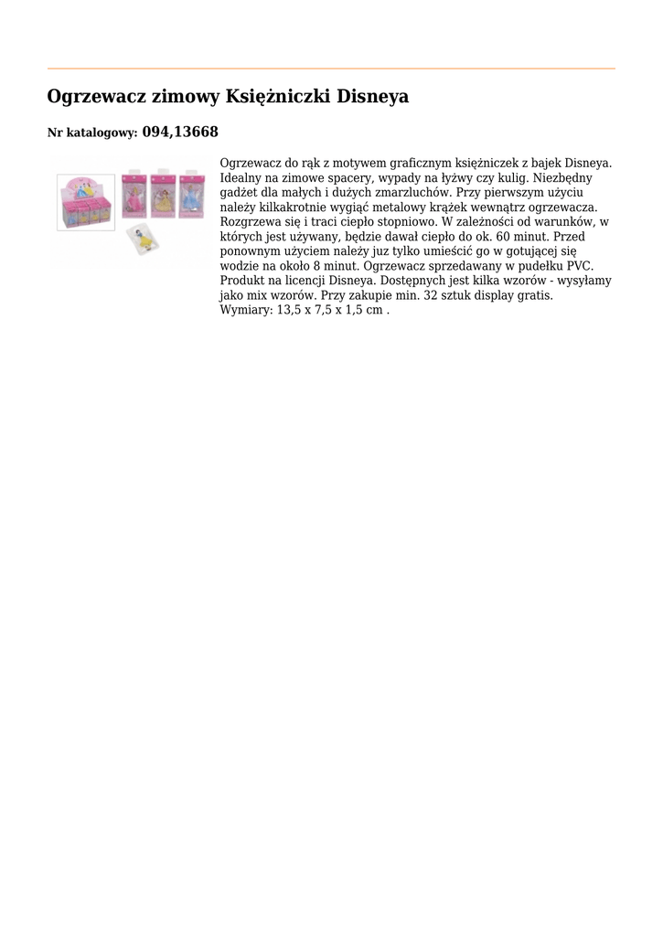 Ogrzewacz zimowy Księżniczki Disneya Nr katalogowy: 094,13668 Ogrzewacz do rąk z motywem graficznym księżniczek z bajek Disneya. Idealny na zimowe spacery, wypady na łyżwy czy kulig. Niezbędny gadżet dla małych i dużych zmarzluchów. Przy pierwszym użyciu należy kilkakrotnie wygiąć metalowy krążek wewnątrz ogrzewacza. Rozgrzewa się i traci ciepło stopniowo. W zależności od warunków, w których jest używany, będzie dawał ciepło do ok. 60 minut. Przed ponownym użyciem należy juz tylko umieścić go w gotującej się wodzie na około 8 minut. Ogrzewacz sprzedawany w pudełku PVC. Produkt na licencji Disneya. Dostępnych jest kilka wzorów - wysyłamy jako mix wzorów. Przy zakupie min. 32 sztuk display gratis. Wymiary: 13,5 x 7,5 x 1,5 cm .
