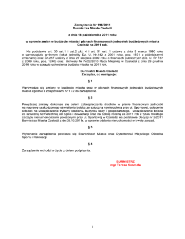 Zarządzenie Nr 196/2011 Burmistrza Miasta Czeladź z dnia 18 października 2011 roku w sprawie zmian w budŜecie miasta i planach finansowych jednostek budŜetowych miasta Czeladź na 2011 rok. Na podstawie art. 30 ust.1 i ust.2 pkt. 4 i art. 51 ust. 1 ustawy z dnia 8 marca 1990 roku o samorządzie gminnym (tekst jednolity Dz. U. Nr.142 z 2001 roku, poz. 1591 z późniejszymi zmianami) oraz art.257 ustawy z dnia 27 sierpnia 2009 roku o finansach publicznych (Dz. U. Nr 157 z 2009 roku, poz. 1240) oraz Uchwały Nr IV/22/2010 Rady Miejskiej w Czeladzi z dnia 29 grudnia 2010 roku w sprawie uchwalenia budŜetu miasta na 2011 rok. Burmistrz Miasta Czeladź Zarządza, co następuje: §1 Wprowadza się zmiany w budŜecie miasta oraz w planach finansowych jednostek budŜetowych miasta zgodnie z załącznikami nr 1 i 2 do zarządzenia. §2 PowyŜszej zmiany dokonuje się celem zabezpieczenia środków w planie finansowym jednostki na naprawę uszkodzonego oświetlenia boiska ze sztuczną nawierzchnią przy ul. Sportowej, opłacenie składek na ubezpieczenie trybuny stadionu, budynku kasy i gospodarczego, ubezpieczenie boiska ze sztuczną nawierzchnią od ognia i dewastacji oraz na opłatę roczną za 2011 rok z tytułu trwałego zarządu nieruchomościami połoŜonymi przy ul. Sportowej w Czeladzi na podstawie Decyzji nr 2/2011 Burmistrza Miasta Czeladź z dn.05.10.2011r. w sprawie oddania nieruchomości w trwały zarząd. §3 Wykonanie zarządzenia powierza się Skarbnikowi Miasta oraz Dyrektorowi Miejskiego Ośrodka Sportu i Rekreacji. §4 Zarządzenie wchodzi w Ŝycie z dniem podpisania. BURMISTRZ mgr Teresa Kosmala 1 Załącznik nr 1 do Zarządzenia nr 196/2011 Burmistrza Miasta Czeladź z dnia 18.10.2011r. ZESTAWIENIE ZMIAN W WYDATKACH BUDśETU GMINY CZELADŹ NA 2011 ROK Dział Rozdział 926 92604 Treść Zwiększenia Zmniejszenia Kultura fizyczna 22 306,50 22 306,50 Instytucje kultury fizycznej 22 306,50 22 306,50 Wydatki bieŜące w tym: - 22 306,50 Wynagrodzenia i składki od nich naliczane - 22 306,50 Wydatki bieŜące w tym: Wydatki związane z realizacją statutowych zadań ZMIANY OGÓŁEM 22 306,50 - 22 306,50 - 22 306,50 22 306,50 Załącznik nr 2 do zarządzenia nr 196/2011 Burmistrza Miasta Czeladź z dnia 18.10.2011r. ZESTAWIENIE ZMIAN W PLANACH FINANSOWYCH JEDNOSTEK BUDśETOWYCH GMINY CZELADŹ NA 2011 ROK Dział Rozdział 926 92604 § Treść Zwiększenia Zmniejszenia Kultura fizyczna 22 306,50 22 306,50 Instytucje kultury fizycznej 22 306,50 22 306,50 Wynagrodzenia osobowe 4010 pracowników - 16 000,00 4040 Dodatkowe wynagrodzenie roczne - 1 486,19 4110 Składki na ubezpieczenia społeczne - 4 000,00 4120 Składki na Fundusz Pracy - 820,31 4270 Zakup usług remontowych 17 000,00 - 4430 RóŜne opłaty i składki 1 000,00 - Opłaty na rzecz budŜetów jednostek 4520 samorządu terytorialnego 4 306,50 - ZMIANY OGÓŁEM 22 306,50 22 306,50