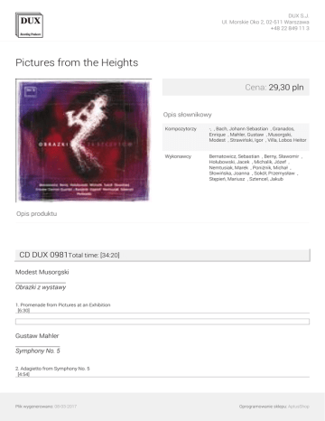 DUX S.J. Ul. Morskie Oko 2, 02-511 Warszawa +48 22 849 11 3 Pictures from the Heights Cena: 29,30 pln Opis słownikowy Kompozytorzy -, ∎, Bach, Johann Sebastian ∎, Granados, Enrique ∎, Mahler, Gustaw ∎, Musorgski, Modest ∎, Strawiński, Igor ∎, Villa, Lobos Heitor ∎ Wykonawcy Bernatowicz, Sebastian ∎, Berny, Sławomir ∎, Hołubowski, Jacek ∎, Michalik, Józef ∎, Nemtusiak, Marek ∎, Poniżnik, Michał ∎, Słowińska, Joanna ∎, Sokół, Przemysław ∎, Stępień, Mariusz ∎, Sztencel, Jakub ∎ Opis produktu CD DUX 0981Total time: [34:20] Modest Musorgski Obrazki z wystawy 1. Promenade from Pictures at an Exhibition [6:30] Gustaw Mahler Symphony No. 5 2. Adagietto from Symphony No. 5 [4:54] Plik wygenerowano: 08-03-2017 Oprogramowanie sklepu: AptusShop DUX S.J. Ul. Morskie Oko 2, 02-511 Warszawa +48 22 849 11 3 Promenade 3. Promenade [0:26] Lobos Heitor Villa Bachianas Brasileiras: Aria nr 5 4. Bachianas Brasileiras No. 5 [6:30] Promenade 5. Promenade (attacca) [0:28] Johann Sebastian Bach Violin Concerto in G minor BWV 1056R 6. Largo from Violin Concerto in G minor BWV 1056R [5:14] Promenade 7. Promenade (attacca) [1:26] Plik wygenerowano: 08-03-2017 Oprogramowanie sklepu: AptusShop DUX S.J. Ul. Morskie Oko 2, 02-511 Warszawa +48 22 849 11 3 Igor Strawiński The Firebird 8. The Firebird [5:49] Enrique Granados Spanish Dance No. 2 9. Spanish Dance No. 2 [4:50] Modest Musorgski Obrazki z wystawy 10. The Great Gate of Kiev from Pictures at an Exhibition [3:56] Wykonawcy: Jacek Hołubowski /akordeon/ Jakub Sztencel /klarnet/klarnet basowy/ Joanna Słowińska /vocal/ Józef Michalik /gitara basowa/ Marek Nemtusiak /klarnet/ Mariusz Stępień /klarnet/saksofon sopranowy/ Michał Poniżnik /klarnet/ Przemysław Sokół /trąbka/ Sebastian Bernatowicz /fortepian/ Sławomir Berny /perkusja/ Plik wygenerowano: 08-03-2017 Powered by TCPDF (www.tcpdf.org) Oprogramowanie sklepu: AptusShop