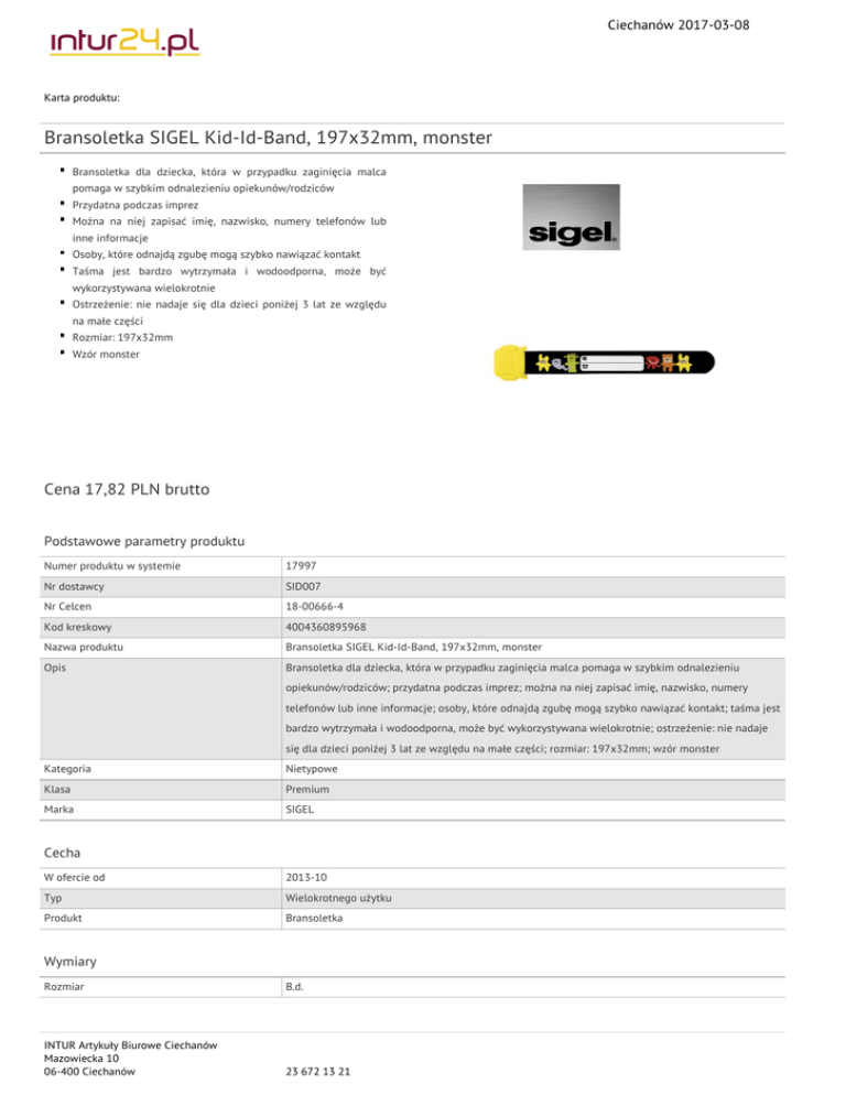 Ciechanów 2017-03-08 Karta produktu: Bransoletka SIGEL Kid-Id-Band, 197x32mm, monster Bransoletka dla dziecka, która w przypadku zaginięcia malca pomaga w szybkim odnalezieniu opiekunów/rodziców Przydatna podczas imprez Można na niej zapisać imię, nazwisko, numery telefonów lub inne informacje Osoby, które odnajdą zgubę mogą szybko nawiązać kontakt Taśma jest bardzo wytrzymała i wodoodporna, może być wykorzystywana wielokrotnie Ostrzeżenie: nie nadaje się dla dzieci poniżej 3 lat ze względu na małe części Rozmiar: 197x32mm Wzór monster Cena 17,82 PLN brutto Podstawowe parametry produktu Numer produktu w systemie 17997 Nr dostawcy SID007 Nr Celcen 18-00666-4 Kod kreskowy 4004360895968 Nazwa produktu Bransoletka SIGEL Kid-Id-Band, 197x32mm, monster Opis Bransoletka dla dziecka, która w przypadku zaginięcia malca pomaga w szybkim odnalezieniu opiekunów/rodziców; przydatna podczas imprez; można na niej zapisać imię, nazwisko, numery telefonów lub inne informacje; osoby, które odnajdą zgubę mogą szybko nawiązać kontakt; taśma jest bardzo wytrzymała i wodoodporna, może być wykorzystywana wielokrotnie; ostrzeżenie: nie nadaje się dla dzieci poniżej 3 lat ze względu na małe części; rozmiar: 197x32mm; wzór monster Kategoria Nietypowe Klasa Premium Marka SIGEL Cecha W ofercie od 2013-10 Typ Wielokrotnego użytku Produkt Bransoletka Wymiary Rozmiar B.d. INTUR Artykuły Biurowe Ciechanów Mazowiecka 10 06-400 Ciechanów 23 672 13 21 Ciechanów 2017-03-08 Karta katalogowa produktu cd. Bransoletka SIGEL Kid-Id-Band, 197x32mm, monster Wysokość (mm) B.d. Wymiary (mm) 32x197 Szerokość (mm) 32 Wspólny słownik zamówień CPV 22455100-5 Bransoletki identyfikacyjne Certyfikaty Nowy produkt w ofercie Standard Hit Standard Kolor Kolor Mix kolorów Pozostałe zdjęcia produktu Serdecznie zapraszamy do współpracy INTUR Artykuły Biurowe Ciechanów zespół. INTUR Artykuły Biurowe Ciechanów Mazowiecka 10 06-400 Ciechanów 23 672 13 21