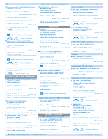 42 Tel. 194-34 TELEFONICZNA INFORMACJA MEDYCZNA n lek. stom. ANNA KATARZYNA SOBCZUK GABINET PRYWATNY Olsztyn ul.Kociuszki 21/1 (Medsan) 600 03 06 09 / 89 533 59 15 n PRACOWNIA dzieci, doroli PROTETYKI DENTYSTYCZNEJ n lek. med. STANIS£AW GAWROÑSKI ANNA SPYCHALSKA licencjonowany technik dentystyczny specjalista chorób dzieci specjalista medycyny rodzinnej Olsztyn ul. Gêbika 2/34 Olsztyn ul.Lawendowa 72 (os.Redykajny) rejestracja telefoniczna codziennie 604 236 674 89 523 78 69 / 508 960 458 codziennie na telefon czynne od pn. do pt. w godz. 9.00-16.00 e-mail: [email protected] Olsztyn ul.Toruñska 1A/43 ZDROWIE DZIECKA 89 526 99 00 r. 12.00-18.00, czw.pt. 8.00-13.00 Zawarta umowa z NFZ Gabinet bez barier architektonicznych ZDROWIE DZIECKA n lek. stom. S£AWOMIR SZYMAÑSKI specjalista chirurgii szczêkowo-twarzowej n GABINET UROLOGIA l lek. ANDRZEJ ZAJ¥C po uzgodnieniu telefonicznym lekarz medycyny seksualnej FECSM Gi¿ycko ul. Wilanowska 24 Centrum Medyczne VILL-MED od pn. do pt. od godz. 9.00 rejestracja tel. codziennie Leczenie równie¿ osób upoledzonych umys³owo n lek. gastroenterologia i interna ZDROWIE DZIECKA ________________________________________ Leczenie równie¿ osób upoledzonych umys³owo w ramach umowy z NFZ Zawarta umowa z NFZ STOMATOL.-PRAC.PROTETYKI DENT. l JOANNA £UCZAK Olsztyn ul. Warmiñska 7 lok. 9 501 593 345 Olsztyn ul. Leyka 22 / 5 501 593 345 czynne od pn. do pt. od godz. 17.00 soboty i niedziele po uzgodnieniu telefonicznym 89 533 28 50 codziennie na telefon interna lek. JERZY MATUSZEWSKI specjalista chorób wewnêtrznych 507 198 124 / 505 941 752 od pn. do pt. po rejestracji tel. 607 559 548 codziennie po uzgodnieniu tel. Gabinet bez barier architektonicznych laryngologia doroli, dzieci n lek. med. IRENEUSZ WOJCIECHOWSKI n ¯ECHOWICZ MEDEUSZ-PLUS lek. med. ZBIGNIEW MAS£OWSKI specjalista chirurgii ogólnej, urolog Olsztyn ul.Osiñskiego 9 89 677 70 70 695 502 525 / 89 523 75 05 po godz. 20 codziennie na telefon logopedia (terapia mowy) l mgr JUSTYNA LE¯AÑSKA pt. od godz. 16.00 rejestracja tel. lub osobista pn. 12.00-20.00, wt. 12.00-18.00, r. 7.30-19.00, czw. 11.00-18.00, pt. 9.00-17.00 technik dentystyczny Olsztyn ul.Ko³obrzeska 14c/13 n Olsztyn ul.Gêbika 10 B (NZOZ PIECZEWO) wykonawstwo, ekspresowa naprawa protez logopeda, specjalista diagnozy i terapii mowy u dzieci, m³odzie¿y i doros³ych KLINIKA JÊZYKA www.medeusz.pl Gabinet bez barier architektonicznych diagnostyka, leczenie, USG urologiczne Olsztyn ul.¯o³nierska 41A, II piêtro (naprzeciwko Szpitala Dzieciêcego) 790 818 501 od pn. do sob. po rejestracji tel. rejestracja codziennie l lek. med. RYSZARD MAREK n PRACOWNIA PROTETYCZNA ZDROWIE DZIECKA specjalista urolog EL¯BIETA SKRZYPCZAK technik dentystyczny Olsztyn ul. ¯ytnia 74 89 527 81 48 / 604 552 518 Olsztyn ul.Kêtrzyñskiego 5/6 (z ty³u budynku) 604 501 572 mgr SYLWIA KAWA£KO WIZYTY DOMOWE l PRACOWNIA PROTETYCZNA chirurgia onkologiczna i ogólna EDYTA ZIELIÑSKA l dr n. med. ANDRZEJ GABRYEL technik dentystyczny Olsztyn ul. Wyszyñskiego 16 pok. 14A 89 534 24 48 l LOGO-MED CENTRUM TERAPII MOWY I KOMUNIKACJI www.logopeda-olsztyn.com.pl e-mail: [email protected] pn. 16.00-18.00, inne terminy po uzgodnieniu tel. czynne od pn. do pt. w godz. 8.00-15.00 specjalista chirurgii onkologicznej, specjalista chirurgii ogólnej logopeda Olsztyn ul.Niepodlegloci 53/55 parter gab. 10 882 162 168 przyjêcia od pn. do sob. w godz. 8.00-20.00 rejestracja tel. codziennie Olsztyn ul.Partyzantów 36 500 829 556 czynne od pn. do pt. w godz. 9.00-16.00 n l lek. med. IRENA ¯EBROWSKA med. MACIEJ KUSKOWSKI specjalista urolog FEBU, chirurg Gabinet bez barier architektonicznych e-mail: [email protected] ZDROWIE DZIECKA r. od godz. 16.00 Rejestracja tel. od pn. do pt. w godz. 8.00-18.00 89 543 09 94 od. pn. do pt. 9.30-13.00 505 839 516 specjalista urolog FEBU, androlog kliniczny EAA, 87 428 29 25 Olsztyn ul. Genera³a Hallera 4 b (pêtla autobusu nr 15) specjalista chorób dzieciêcych i medycyny rodzinnej UROLOGICZNO-ANDROLOGICZNY lek. TOMASZ PURWIN codziennie po uzgodnieniu tel. INFORMACJA ROZSZERZONA W OG£OSZENIU RAMKOWYM ZDROWIE DZIECKA www.InformacjaMedyczna.olsztyn.pl