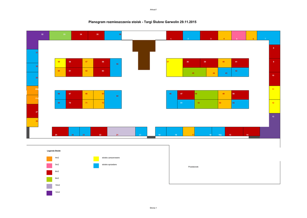 Arkusz1 Planogram rozmieszczenia stoisk - Targi Ślubne Garwolin 29.11.2015 32 33 34 35 36 2 1 3 4 5 6 7 8 31 59 58 57 56 37 38 39 40 41 9 55 30 60 61 62 63 42 45 44 43 10 29 28b 11 68 67 66 65 46 47 48 49 50 64 28a 69 70 71 72 51 52 53 54 12 27 13 26 25 24 23 22 21 20 19 18 17 Legenda Stoisk 4m2 stoisko zarezerowane 5m2 stoisko sprzedane Przedsionek 6m2 8m2 10m2 12m2 Strona 1 16 16a 15 14