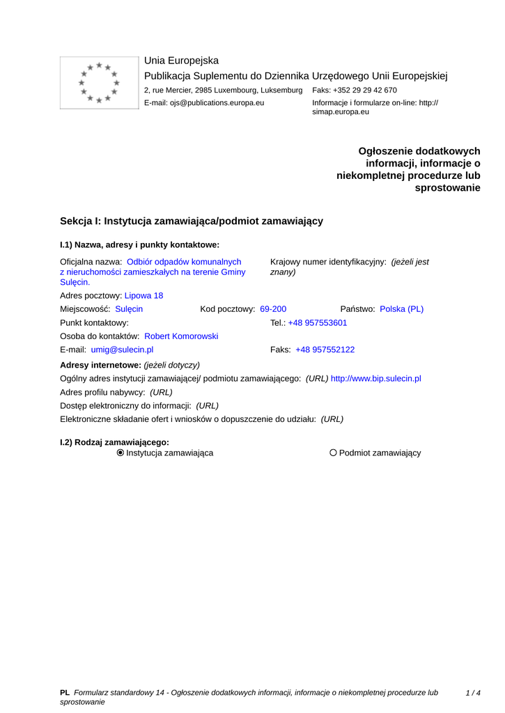 Unia Europejska Publikacja Suplementu do Dziennika Urzędowego Unii Europejskiej 2, rue Mercier, 2985 Luxembourg, Luksemburg Faks: +352 29 29 42 670 E-mail: [email protected] Informacje i formularze on-line: http:// simap.europa.eu Ogłoszenie dodatkowych informacji, informacje o niekompletnej procedurze lub sprostowanie Sekcja I: Instytucja zamawiająca/podmiot zamawiający I.1) Nazwa, adresy i punkty kontaktowe: Oficjalna nazwa: Odbiór odpadów komunalnych z nieruchomości zamieszkałych na terenie Gminy Sulęcin. Krajowy numer identyfikacyjny: (jeżeli jest znany) _____ Adres pocztowy: Lipowa 18 Miejscowość: Sulęcin Kod pocztowy: 69-200 Punkt kontaktowy: _____ Państwo: Polska (PL) Tel.: +48 957553601 Osoba do kontaktów: Robert Komorowski E-mail: [email protected] Faks: +48 957552122 Adresy internetowe: (jeżeli dotyczy) Ogólny adres instytucji zamawiającej/ podmiotu zamawiającego: (URL) http://www.bip.sulecin.pl Adres profilu nabywcy: (URL) _____ Dostęp elektroniczny do informacji: (URL) _____ Elektroniczne składanie ofert i wniosków o dopuszczenie do udziału: (URL) _____ I.2) Rodzaj zamawiającego: Instytucja zamawiająca Podmiot zamawiający PL Formularz standardowy 14 - Ogłoszenie dodatkowych informacji, informacje o niekompletnej procedurze lub sprostowanie 1/4 Sekcja II: Przedmiot zamówienia II.1.1) Nazwa nadana zamówieniu: Odbiór odpadów komunalnych z nieruchomości zamieszkałych na terenie Gminy Sulęcin. II.1.2) Krótki opis zamówienia lub zakupu: (podano w pierwotnym ogłoszeniu) 1. Opis przedmiotu zamówienia: Przedmiotem zamówienia jest odbiór odpadów komunalnych pochodzących z nieruchomości zamieszkałych na terenie gminy Sulęcin. 2. Odbiorem zostaną objęte: a) Odpady komunalne zbierane w sposób selektywny „ u źródła” z podziałem na frakcje: papier; tworzywa sztuczne, w tym opakowania PET, opakowania wielomateriałowe i metal; szkło; odpady ulegające biodegradacji. b) Odpady komunalne zbierane w sposób nieselektywny – zmieszane. c) Przeterminowane leki i chemikalia; d) Zużyte baterie i akumulatory; e) Zużyty sprzęt elektryczny i elektroniczny; f) Meble i inne odpady wielkogabarytowe; g) Odpady budowlane i rozbiórkowe; h) Zużyte opony. Zasady, częstotliwość odbioru, ilości odpadów oraz zestawienie danych dotyczących gminy określa załącznik nr 1 do niniejszej specyfikacji. 3. Zapewnienie worków i pojemników przeznaczonych do selektywnej zbiórki odpadów. Ilość, rodzaj i wielkość worków określa załącznik nr 1 do niniejszej Specyfikacji. 4. Zapewnienie pojemników przeznaczonych na odpady zmieszane. Ilość, rodzaj i wielkość pojemników określa załącznik nr 1 do niniejszej Specyfikacji. II.1.3) Wspólny Słownik Zamówień (CPV) Główny przedmiot Dodatkowe przedmioty Słownik główny 90000000 90500000 90511000 90512000 90511300 90511400 Słownik uzupełniający (jeżeli dotyczy) PL Formularz standardowy 14 - Ogłoszenie dodatkowych informacji, informacje o niekompletnej procedurze lub sprostowanie 2/4 Sekcja IV: Procedura IV.1)Rodzaj procedury (podano w pierwotnym ogłoszeniu) Otwarta Ograniczona Ograniczona przyspieszona Negocjacyjna Negocjacyjna przyspieszona Dialog konkurencyjny Negocjacyjna z uprzednim ogłoszeniem Negocjacyjna bez uprzedniego ogłoszenia Negocjacyjna z publikacją ogłoszenia o zamówieniu Negocjacyjna bez publikacji ogłoszenia o zamówieniu Udzielenie zamówienia bez uprzedniej publikacji ogłoszenia o zamówieniu w Dzienniku Urzędowym Unii Europejskiej IV.2)Informacje administracyjne IV.2.1)Numer referencyjny: (podano w pierwotnym ogłoszeniu) IZiG. 271. 3 .2013. IV.2.2)Dane referencyjne ogłoszenia w przypadku ogłoszeń przesłanych drogą elektroniczną: Pierwotne ogłoszenie przesłane przez eNotices TED eSender Login: ENOTICES_umsulecin Dane referencyjne ogłoszenia: 2013-065508 rok i numer dokumentu IV.2.3)Ogłoszenie, którego dotyczy niniejsza publikacja: Numer ogłoszenia w Dz.U.: _____ z dnia: ______ (dd/mm/rrrr) IV.2.4)Data wysłania pierwotnego ogłoszenia: 15/05/2013 (dd/mm/rrrr) PL Formularz standardowy 14 - Ogłoszenie dodatkowych informacji, informacje o niekompletnej procedurze lub sprostowanie 3/4 Sekcja VI: Informacje uzupełniające VI.1) Ogłoszenie dotyczy: Procedury niepełnej Sprostowania Informacji dodatkowych VI.2) Informacje na temat niepełnej procedury udzielenia zamówienia: Postępowanie o udzielenie zamówienia zostało przerwane Postępowanie o udzielenie zamówienia uznano za nieskuteczne Zamówienia nie udzielono Zamówienie może być przedmiotem ponownej publikacji VI.3) Informacje do poprawienia lub dodania : VI.3.1) Zmiana oryginalnej informacji podanej przez instytucję zamawiającą Publikacja w witrynie TED niezgodna z oryginalną informacją, przekazaną przez instytucję zamawiającą Oba przypadki VI.3.2) W ogłoszeniu pierwotnym W odpowiedniej dokumentacji przetargowej (więcej informacji w odpowiedniej dokumentacji przetargowej) W obu przypadkach (więcej informacji w odpowiedniej dokumentacji przetargowej) VI.3.3) Tekst, który należy poprawić w pierwotnym ogłoszeniu Miejsce, w którym znajduje się Zamiast: zmieniany tekst: I,1) Nazwa, adresy i punkty Sekcja I: Instytucja zamawiająca I.1) kontaktowe: Nazwa, adresy i punkty kontaktowe: Oficjalna nazwa: Odbiór odpadów komunalnych z Oficjalna nazwa: nieruchomości zamieszkałych na terenie Gminy Sulęcin. VI.3.4) Daty, które należy poprawić w pierwotnym ogłoszeniu Miejsce, w którym znajdują się Zamiast: zmieniane daty: Powinno być: I,1) Nazwa, adresy i punkty kontaktowe: Oficjalna nazwa: Gmina Sulęcin. Powinno być: VI.3.5) Adresy i punkty kontaktowe, które należy poprawić VI.3.6) Tekst, który należy dodać do pierwotnego ogłoszenia Miejsce, w którym należy dodać tekst: Tekst do dodania: VI.4) Inne dodatkowe informacje: _____ VI.5) Data wysłania niniejszego ogłoszenia: 16/05/2013 (dd/mm/rrrr) - ID:2013-065854 PL Formularz standardowy 14 - Ogłoszenie dodatk