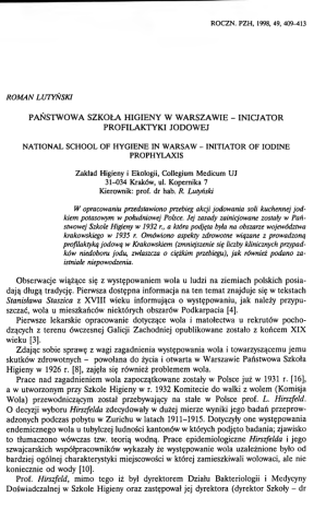 ROCZN. PZH, 1998, 49, 409-413 ROMAN LUTYŃSKI PA Ń ST W O W A SZ K O Ł A H IG IE N Y W W A R S Z A W IE - IN IC JA T O R P R O FIL A K T Y K I JO D O W E J NATIONAL SCHOOL OF HYGIENE IN WARSAW - INITIATOR OF IODINE PROPHYLAXIS Zakład Higieny i Ekologii, Collegium Medicum UJ 31-034 Kraków, ul. Kopernika 7 Kierownik: prof. dr hab. R. Lutyński W opracowaniu przedstawiono przebieg akcji jodowania soli kuchennej jod kiem potasowym w południowej Polsce. Jej zasady zainicjowane zostały w Pań stwowej Szkole Higieny w 1932 г., a która podjęta była na obszarze województwa krakowskiego w 1935 r. Omówiono aspekty zdrowotne wiązane z prowadzoną profilaktyką jodową w Krakowskiem (zmniejszenie się liczby klinicznych przypad ków niedoboru jodu, zwłaszcza o ciężkim przebiegu), jak również podano za istniałe niepowodzenia. O bserw acje wiążące się z występowaniem wola u ludzi na ziem iach polskich posia dają długą tradycję. Pierwsza dostępna inform acja na ten tem at znajduje się w tekstach Stanisława Staszica z X V III wieku inform ująca o występowaniu, jak należy przypu szczać, wola u m ieszkańców niektórych obszarów Podkarpacia [4]. Pierw sze lekarskie opracow anie dotyczące wola i m atołectw a u rekrutów pocho dzących z teren u ówczesnej Galicji Z achodniej opublikowane zostało z końcem X IX wieku [3]. Z dając sobie spraw ę z wagi zagadnienia występowania wola i towarzyszącemu jem u skutków zdrow otnych - pow ołana do życia i otw arta w W arszawie Państwowa Szkoła H igieny w 1926 r. [8], zajęła się rów nież problem em wola. P race nad zagadnieniem wola zapoczątkow ane zostały w Polsce już w 1931 r. [16], a w utw orzonym przy Szkole Higieny w r. 1932 Kom itecie do walki z wolem (Komisja W ola) przewodniczącym został przebywający na stałe w Polsce prof. L. Hirszfeld. O decyzji wyboru Hirszfelda zdecydowały w dużej m ierze wyniki jego badań przeprow adzonych podczas pobytu w Z urichu w latach 1911-1915. Dotyczyły one występowania endem icznego wola u tubylczej ludności kantonów w których podjęto badania; zjawisko to tłum aczono wówczas tzw. teo rią wodną. Prace epidem iologiczne Hirszfelda i jego szwajcarskich współpracowników wykazały że występowanie wola uzależnione było od bardziej ogólnej charakterystyki miejscowości w której zamieszkiwali wolowaci, ale nie koniecznie od wody [10]. Prof. Hirszfeld, m imo tego iż był dyrektorem Działu B akteriologii i Medycyny D oświadczalnej w Szkole Higieny oraz zastępow ał jej dyrektora (dyrektor Szkoły - dr 410 R. Lutyński Nr 4 L. Rajchm an powołany został na stanowisko przew odniczącego Sekcji Higieny Ligi N arodów w G enew ie), zaangażow ał się w działalność K om itetu do walki z wolem. Prace tego K om itetu, subsydiowane przez D ep artam en t Służby Zdrow ia M inisterstw a O pieki Społecznej, zostały ukierunkow ane w pierwszym rzędzie celem ustalenia nasi lenia występowania wola endem icznego w Polsce, a następnie poszukiw ania przyczyn jego powstawania, jak też środków zwalczania [16]. W 1935 r. K om itet po podjęciu uchwały określającej potrzebę zbierania danych statystycznych dotyczących w ystępowania wola (u uczniów szkół podstawowych, w szpi talach od pacjentów oraz w wojsku) opracow ał instrukcję w sprawie prow adzenia badań nad wolem. W instrukcji tej określono 3 stopnie pow iększenia tarczycy, aby nimi posługując się stworzyć rękojm ię porównywalności uzyskanych wyników [4]. N iezależnie od tego, zw rócono się do M inisterstw a Spraw W ojskowych o udostępnienie danych dotyczących zdrowia rekrutów , którzy stawali do poboru w latach 1930 i 1931 (roczniki 1909 i 1910). D zięki tem u uzyskano w stępne dane i obliczono odsetki poborow ych dotkniętych wolem pochodzących z wszystkich powiatów kraju [5, 9, 24]. D ane z województwa krakowskiego przem awiały za istnieniem w południowej Polsce, na o b szarze K arpat zachodnich i środkowych - endem icznie w ystępującego wola. W ynosiło ono na tych obszarach u rekrutów w roku 1930 - 15,6%, a w roku 1931 - 17,5% wszystkich poddanych oględzinom lekarskim , gdy w tych samych latach ogółem w Pol sce: 2,97% i 2,98% [24, 25]. Szczegółowe i w szechstronne badania na obszarze dotkniętym wolem u ludzi o d u żym nasileniu (wynoszącym 60,8% ogółu osób poddanych oględzinom lekarskim ) były przeprow adzone w 1933 r. w Krakowskiem we wsi Przysietnica w powiecie now osądec kim [6]. D okonując tam badań lekarskich mieszkańców jak i chemicznej analizy p o b ra nych próbek wody pitnej, oprócz wielu innych dom niem anych czynników przyczy niających się do endem ii wola w Przysietnicy, uogólniono że czynnikiem głównym stwierdzonych stanów patologicznych jest m ała ilość jodu w środowisku. Z nając również wyniki prow adzonej w E uropie zachodniej profilaktyki jodow ej, działania takie określono u nas jako celowe pod względem medycznym i m ające uzasadnienie społeczne [23]. W rezultacie oceny zaistniałej sytuacji epidem iologicznej w kraju i wyników zorganizowanych badań, K om itet do walki z wolem spowodował w prow adzenie do handlu jodow anej soli kuchennej wydobywanej w W ieliczce. Z a d e cydowano w zbogacenie soli jodkiem potasowym (K J) w ilości 5 mg/kg, a akcja ta w prow adzona została w życie z początkiem 1935 roku i dotyczyła obszaru województwa krakowskiego i czterech sąsiadujących powiatów województwa lwowskiego [9, 12]. Już w 1927 r. Państwowa Szkoła Higieny weszła w skład Państwowego Z akładu H igieny (przem ianow anego w 1923 r. z istniejącego od 1918 r. Państwowego C en tral nego Z akładu Epidem iologicznego), który wraz z filiami stworzył jednolity system kontroli żywności i wody w Polsce [7]. Na filii w Krakowie spoczywał dodatkow o obowiązek nadzorow ania zawartości KJ w soli jadalnej będącej w sprzedaży w tam tej szym województwie. Jak wynika z danych przedstawionych w referac