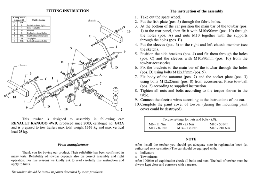 FITTING INSTRUCTION Clamp mark in acc. with ISO PN 1 L 2 + 3 31 4 R 5 58R 6 54 7 58L Cables joining chassis Left directional lights Rear fog lights Ground Right directional lights Right side parking lights Stoplights Left side parking lights 10 C 4 5 9 B chassis D 6 A 1 C 7 10 4 9 D 3 10 2 This towbar is designed to assembly in following car: RENAULT KANGOO 4WD, produced since 2003, catalogue no. G42A and is prepared to tow trailers max total weight 1350 kg and max vertical load 75 kg. The instruction of the assembly 1. Take out the spare wheel. 2. Put the fish-plate (pos. 5) through the fabric holes. 3. At the bottom of the car position the main bar of the towbar (pos. 1) to the rear panel, then fix it with M10x90mm (pos. 10) through the holes (pos. A) and nuts M10 together with the supports through the holes (pos. B). 4. Put the sleeves (pos. 6) to the right and left chassis member (see the sketch). 5. Position the side brackets (pos. 4) and fix them through the holes (pos. C) and the sleeves with M10x90mm (pos. 10) from the towbar accessories. 6. Fix the brackets to the main bar of the towbar through the holes (pos. D) using bolts M12x35mm (pos. 9). 7. Fix body of the automat (pos. 7) and the socket plate (pos. 3) using bolts M12x25mm (pos. 8) from accessories. Place tow-ball (pos. 2) according to supplied instruction. 8. Tighten all nuts and bolts according to the torque shown in the table. 9. Connect the electric wires according to the instructions of the car. 10. Complete the paint cover of towbar (during the mounting paint cover could be destroyed). Torque settings for nuts and bolts (8,8): M6 - 11 Nm M8 - 25 Nm M10 - 50 Nm M12 - 87 Nm M14 - 138 Nm M16 - 210 Nm NOTE From manufacturer Thank you for buying our product. Their reliability has been confirmed in many tests. Reliability of towbar depends also on correct assembly and right operation. For this reasons we kindly ask to read carefully this instruction and apply to hints. The towbar should be install in points described by a car producer. After install the towbar you should get adequate note in registration book (at authorised service station).The car should be equipped with: • Indicators • Tow mirrors After 1000km of exploitation check all bolts and nuts. The ball of towbar must be always kept clear and conserve with a grease. PPUH AUTO-HAK Sp. J. Towbar accessories: Produkcja Zaczepów Kulowych Henryk & Zbigniew Nejman 76-200 SŁUPSK ul. Słoneczna 16K tel/fax (059) 8-414-414; 8-414-413 E-mail: [email protected] www.autohak.com.pl Towing hitch (without electrical set) Class: A50-X Cat. no. G42A Technical data: D-value: 7,7 kN maximum trailer weight: 1350 kg maximum vertical cup load: 75 kg Designed for: Manufacturer: RENAULT Model: KANGOO Type: 4WD produced since 2003 Approval number according to Directive 94/20/EC: e20*94/20*1052*00 Foreword This towbar is designed according to rules of safety traffic regulations. The towing hitch is a safety component and can be install only by qualified personnel. Any alteration or conversion of the towing hitch is prohibited and would lead to cancellation of design certification. Remove insulating compound and underseal from vehicle (if present) in the area of the matting surfaces of the towing hitch. The vehicle manufacturer’s specifications regarding trailer load and max. vertical cup load are decisive for driving, and values for the towing hitch cannot be exceeded. D-value formula: Max trailer weight [kg] x Max vehicle weight [kg] Max trailer weight [kg] + Max vehicle weight [kg] X 9,81 = 1000 D [kN] INSTRUCTION De montage et d’exploitation du dispositif d'attelage à boule Désignation de borne selon la norme ISO PN 1 L 2 3 + 31 4 R 5 6 7 58R 54 58L Instructions de montage poutre d’origine Connexion des câbles 10 Pour indicateurs de direction gauche Feux de brouillard arrière Au poids du véhicule Pour indicateurs de direction droite Feux de circulation droites Pour feux de freinage Feux de circulation gauches C 4 5 9 B poutre d’origine D 6 A 1 C 7 10 4 9 D 3 10 2 Le dispositif d'attelage à boule est conçu pour être monté dans la voiture: RENAULT KANGOO 4WD, produit à partir de 2003, numéro de catalogue G42A et est utilisé pour tirer des remorques du poids total 1350 kg et de la pression totale sur la boule max 75 kg. 1. Enlever le bouchon du pare-chocs. 2. Mettre les éclisses avec le vis et l’écrou (pos.5) dans les trous du panneau arrière. 3. Au dessous du véhicule, placer la poutre principale (pos.1) au panneau arrière, ensuite serrer à l’aide des vis M10x90mm (pos. 10) à travers des trous (pos. A) et l’aide des écrous M10 à travers des trous (pos. B) avec des éclisses. 4. Mettre des douilles d’écartement (pos.6) avec des rondelles (pos.15) – (regarder le dessin) dans les longerons, dans les trous du côté droit et gauche. 5. Positionner les appuis latéraux (pos.4) et à travers des trous (pos.C) et à travers des douilles, serrer à l’aide des vis M10x90mm (pos.10). 6. Serrer la poutre de l’attelage avec les appuis latéraux à travers des trous (pos.D) à l’aide des vis M12x35mm (pos.9). 7. Serrer le carter du mécanisme automatique (pos.7) à l’aide des vis M12x25mm (pos.8) avec la tôle sous la prise (pos.3) à l’attelage préparé ainsi. Monter la boule d’attelage suivant l'instruction jointe au l’attelage avec l’attache facilement démontable. 8. Serrer tous les vis aux couples de serrage, comme indiqué dans le tableau. 9. Connecter les câbles de la prise 7 – à l'installation électrique en conformité avec les instructions d'une usine automobile (recommandé la mise en œuvre d’une station-service autorisée) 10. Remplir des pertes de peinture causés durant l'installation. Couples de serrage recommandé pour les vis et les écrous 8,8: M6 - 11 Nm M 8 - 25 Nm M 10 - 50 Nm M 12 - 87 Nm M 14 - 138 Nm M16 - 210 Nm Attention DE LA PART DU FABRICANT Merci d'avoir choisi le dispositif d'attelage à boule produit 