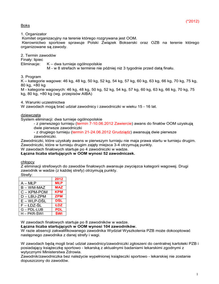 (*2012) Boks 1. Organizator Komitet organizacyjny na terenie którego rozgrywana jest OOM. Kierownictwo sportowe sprawuje Polski Związek Bokserski oraz OZB na terenie którego organizowane są zawody. 2. Termin zawodów Finały: lipiec Eliminacje: K – dwa turnieje ogólnopolskie M - w 8 strefach w terminie nie później niż 3 tygodnie przed datą finału. 3. Program K – kategorie wagowe: 46 kg, 48 kg, 50 kg, 52 kg, 54 kg, 57 kg, 60 kg, 63 kg, 66 kg, 70 kg, 75 kg, 80 kg, +80 kg M - kategorie wagowych: 46 kg, 48 kg, 50 kg, 52 kg, 54 kg, 57 kg, 60 kg, 63 kg, 66 kg, 70 kg, 75 kg, 80 kg, +80 kg (wg. przepisów AIBA) 4. Warunki uczestnictwa W zawodach mogą brać udział zawodnicy i zawodniczki w wieku 15 - 16 lat. dziewczęta System eliminacji: dwa turnieje ogólnopolskie - z pierwszego turnieju (termin 7-10.06.2012 Zawiercie) awans do finałów OOM uzyskują dwie pierwsze zawodniczki - z drugiego turnieju (termin 21-24.06.2012 Grudziądz) awansują dwie pierwsze zawodniczki. Zawodniczki, które uzyskały awans w pierwszym turnieju nie maja prawa startu w turnieju drugim. Zawodniczki, które w turnieju drugim zajęły miejsca 3-4 otrzymują punkty. W zawodach finałowych startuje po 4 zawodniczki w wadze. Łączna liczba startujących w OOM wynosi 52 zawodniczek. chłopcy Z eliminacji strefowych do zawodów finałowych awansuje zwycięzca kategorii wagowej. Drugi zawodnik w wadze (z każdej strefy) otrzymują punkty. Strefy: A – MŁP B – WM-MAZ C – KPM-POM D – LBU-ZPM E – WLP-DŚL F – ŁDZ-ŚL G – PDL-LUB H – PKR-ŚWI 2012 MŁP MAZ KPM ZPM DŚL ŁDZ PDL ŚWI W zawodach finałowych startuje po 8 zawodników w wadze. Łączna liczba startujących w OOM wynosi 104 zawodników. W razie absencji zakwalifikowanego zawodnika Wydział Wyszkolenia PZB może dokooptować następnego zawodnika z danej strefy i wagi. W zawodach będą mogli brać udział zawodnicy/zawodniczki zgłoszeni do centralnej kartoteki PZB i posiadający książeczkę sportowo - lekarską z aktualnymi badaniami lekarskimi zgodnymi z wytycznymi Ministerstwa Zdrowia. Zawodnik/zawodniczka bez należycie wypełnionej książeczki sportowo - lekarskiej nie zostanie dopuszczony do zawodów. 1 Każdy zawodnik musi posiadać licencję Polskiego Związku Bokserskiego. 5. Sposób przeprowadzenia zawodów Zgodnie z obowiązującym regulaminem sportowym PZB (3 rundy po 2 minuty z jednominutowymi przerwami). Sprzęt dla zawodniczek Sprzęt do startu w OOM (kaski i rękawice bokserskie), posiadający atest AIBA tj, Adidas, Top Ten, Wesing, FBT, Velocity, zapewnia organizator. Zawodniczka zobowiązana jest do posiadania w czasie walki ochraniaczy na zęby, suspensorium, dopasowany specjalistyczny ochraniacz na piersi oraz bandaże na dłoniach. Koszulki muszą być z krótkim rękawkiem bez kołnierzyka a włosy mogą być zabezpieczone jedynie przez gumkę lub wstążkę a zakazane jest używanie siatki do włosów, osłony włosów, szpilek, spinek itp. We wszystkich kategoriach wagowych używa się rękawic o wadze 10 uncji. Sprzęt dla zawodników Sprzęt do startu w OOM (kaski i rękawice bokserskie), posiadający atest AIBA tj, Adidas, Top Ten, Wesing, FBT, Velocity zapewnia organizator. Zawodnik zobowiązany jest do posiadania w czasie walki ochraniaczy na zęby, suspensorium oraz bandaże na dłoniach. We wszystkich kategoriach wagowych używa się rękawic o wadze 10 uncji. W zawodach obowiązuje system pucharowy (zawodnik przegrywający odpada). Zestawienie walczących par ustala się drogą losowania. Polski Związek Bokserski posiada prawo do rozstawiania zawodników. Program I dzień II dzień III dzień IV dzień V dzień VI dzień chłopcy przyjazd do kolacji, badanie lekarskie, waga zawodników, konferencja techniczna i losowanie walki ćwierćfinałowe I seria, walki ćwierćfinałowe II seria walki ćwierćfinałowe III seria, walki ćwierćfinałowe IV seria dzień wolny, wyjazd po śniadaniu zawodników wyeliminowanych walki półfinałowe dzień wolny dziewczęta przyjazd do kolacji, badanie lekarskie, waga zawodników, konferencja techniczna i losowanie walki półfinałowe dzień wolny walki finałowe, zakończenie OOM, wyjazd po obiedzie walki finałowe, zakończenie OOM, wyjazd po obiedzie liczba uczestników: K – zawodniczek – 52, trenerów – 20, pzs - 1 M - zawodników - 104, trenerów - 36, sędziów - 16, pzs - 2 6. Zgłoszenia Terminy zgłoszeń do eliminacji podają wiodące OZB. Dokumentacje z eliminacji należy przesłać do PZB w ciągu 7 dni po zakończeniu eliminacji. Zawodnicy zgłoszeni do OOM przedkładają podczas kontroli wagi kartę zdrowia oraz dowód tożsamości. Weryfikację i ostateczne potwierdzenie startu zgłoszonych zawodników do finału prowadzą Wydział Sportowy i Wyszkolenia PZB. 2 7. Punktacja K Lok. 1 2 PKT 9 7 M Lok. 1 2 PKT 9 7 3-4 5 26 II turniej PKT 3-4 5-8 strefy 5 4 42 PKT 3-4 3 2 2 6 8 strefy x 2 D. System ocen Boks I. Młodzieżowe Mistrzostwa Polski M - 19-23 lat 1.Program M - 46-49 kg, 52 kg, 56 kg, 60 kg, 64 kg, 69 kg, 75 kg, 81 kg, 91 kg, +91 kg 2. Punktacja Lok. 1 2 3-4 5-8 PKT 25 21 17 11 124 II. Mistrzostwa Polski Juniorów M - 17-18 lat 1.Program M - 46-49 kg, 52 kg, 56 kg, 60 kg, 64 kg, 69 kg, 75 kg, 81 kg, 91 kg, +91 kg 2. Punktacja Lok. 1 2 3-4 5-8 PKT 15 12 10 8 79 II. Mistrzostwa Polski Juniorek K – 17-18 lat 1.Program K – 45-48 kg, 51 kg, 54 kg, 57 kg, 60 kg, 64 kg, 69 kg, 75 kg, 81 kg, +81 kg 2. Punktacja Lok. 1 2 3-4 5-8 PKT 15 12 10 8 79 III. Olimpiada Młodzieży - Mistrzostwa Polski Juniorów młodszych – M - 15-16 lat 1.Program K – kategorie wagowe: 46 kg, 48 kg, 50 kg, 52 kg, 54 kg, 57 kg, 60 kg, 63 kg, 66 kg, 70 kg, 75 kg, 80 kg, +80 kg 2. Punktacja K Lok. 1 2 3-4 II turniej 3-4 PKT 9 7 5 26 PKT 3 6 1.Program M – 46 kg, 48 kg, 50 kg, 52 kg, 54 kg, 57 kg, 60 kg, 63 kg, 66 kg, 70 kg, 75 kg, 80 kg, +80 kg 2. Punktacja M Lok. 1 2 3-4 5-8 strefy 2 PKT 9 7 5 4 42 PKT 2 8 strefy x 2 3 Eliminacje do OOM dziewczęta I Turniej II 