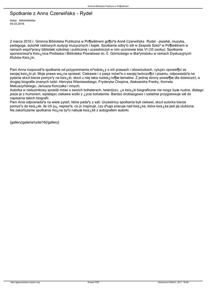 2 marca 2016 r. Gminna Biblioteka Publiczna w Po¶wiêtnem go¶ci³a Annê Czerwiñsk± Rydel - pisarkê, muzyka,