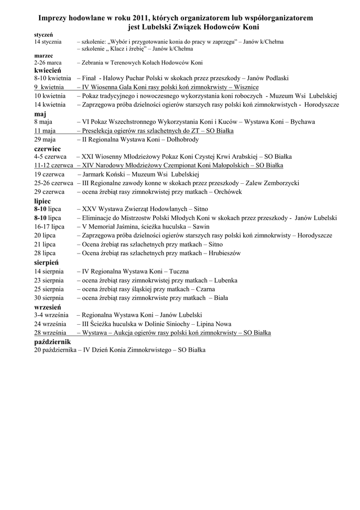 Imprezy hodowlane w roku 2011, których organizatorem lub współorganizatorem jest Lubelski Związek Hodowców Koni styczeń 14 stycznia marzec 2-26 marca – szkolenie: „Wybór i przygotowanie konia do pracy w zaprzęgu” – Janów k/Chełma – szkolenie „ Klacz i źrebię” – Janów k/Chełma – Zebrania w Terenowych Kołach Hodowców Koni kwiecień 8-10 kwietnia 9 kwietnia 10 kwietnia 14 kwietnia – Finał - Halowy Puchar Polski w skokach przez przeszkody – Janów Podlaski – IV Wiosenna Gala Koni rasy polski koń zimnokrwisty – Wisznice – Pokaz tradycyjnego i nowoczesnego wykorzystania koni roboczych - Muzeum Wsi Lubelskiej – Zaprzęgowa próba dzielności ogierów starszych rasy polski koń zimnokrwistych - Horodyszcze maj 8 maja 11 maja 29 maja – VI Pokaz Wszechstronnego Wykorzystania Koni i Kuców – Wystawa Koni – Bychawa – Preselekcja ogierów ras szlachetnych do ZT – SO Białka – II Regionalna Wystawa Koni – Dołhobrody czerwiec 4-5 czerwca 11-12 czerwca 19 czerwca 25-26 czerwca 29 czerwca – XXI Wiosenny Młodzieżowy Pokaz Koni Czystej Krwi Arabskiej – SO Białka – XIV Narodowy Młodzieżowy Czempionat Koni Małopolskich – SO Białka – Jarmark Koński – Muzeum Wsi Lubelskiej – III Regionalne zawody konne w skokach przez przeszkody – Zalew Zemborzycki – ocena źrebiąt rasy zimnokrwistej przy matkach – Orchówek lipiec 8-10 lipca 8-10 lipca 16-17 lipca 20 lipca 21 lipca 28 lipca – XXV Wystawa Zwierząt Hodowlanych – Sitno – Eliminacje do Mistrzostw Polski Młodych Koni w skokach przez przeszkody - Janów Lubelski – V Memoriał Jaśmina, ścieżka huculska – Sawin – Zaprzęgowa próba dzielności ogierów starszych rasy polski koń zimnokrwisty – Horodyszcze – Ocena źrebiąt ras szlachetnych przy matkach – Sitno – Ocena źrebiąt ras szlachetnych przy matkach – Hrubieszów sierpień 14 sierpnia 23 sierpnia 25 sierpnia 30 sierpnia – IV Regionalna Wystawa Koni – Tuczna – ocena źrebiąt rasy zimnokrwistej przy matkach – Lubenka – ocena źrebiąt rasy śląskiej przy matkach – Czarna – ocena źrebiąt rasy zimnokrwiste przy matkach – Biała wrzesień 3-4 września 24 września 28 września – Regionalna Wystawa Koni – Janów Lubelski – III Ścieżka huculska w Dolinie Siniochy – Lipina Nowa – Wystawa – Aukcja ogierów rasy polski koń zimnokrwisty – SO Białka październik 20 października – IV Dzień Konia Zimnokrwistego – SO Białka