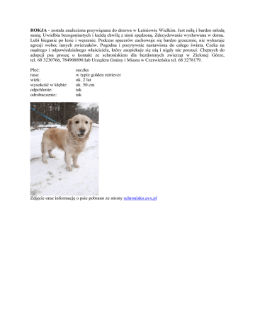 ROKJA - została znaleziona przywiązana do drzewa w Leśniowie Wielkim. Jest miłą i bardzo młodą sunią. Uwielbia bezogoniastych i każdą chwilę z nimi spędzoną. Zdecydowanie wychowana w domu. Lubi bieganie po lesie i węszenie. Podczas spacerów zachowuje się bardzo grzecznie, nie wykazuje agresji wobec innych zwierzaków. Pogodna i pozytywnie nastawiona do całego świata. Czeka na mądrego i odpowiedzialnego właściciela, który zaopiekuje się nią i nigdy nie porzuci. Chętnych do adopcji psa proszę o kontakt ze schroniskiem dla bezdomnych zwierząt w Zielonej Górze, tel. 68 3230766, 784908890 lub Urzędem Gminy i Miasta w Czerwieńsku tel. 68 3278179. Płeć: rasa: wiek: wysokość w kłębie: odpchlenie: odrobaczenie: suczka w typie golden retriever ok. 2 lat ok. 50 cm tak tak Zdjęcie oraz informację o psie pobrano ze strony schronisko.avx.pl