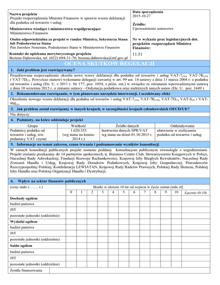 Nazwa projektu Projekt rozporządzenia Ministra Finansów w sprawie wzoru deklaracji dla podatku od towarów i usług Ministerstwo wiodące i ministerstwa współpracujące Ministerstwo Finansów Data sporządzenia 2015-10-27 Źródło: Upoważnienie ustawowe Osoba odpowiedzialna za projekt w randze Ministra, Sekretarza Stanu lub Podsekretarza Stanu Pan Jarosław Neneman, Podsekretarz Stanu w Ministerstwie Finansów Nr w wykazie prac legislacyjnych dot. projektów rozporządzeń Ministra Finansów: Kontakt do opiekuna merytorycznego projektu Bożena Dąbrowska, tel. (022) 694-31-70; [email protected] 11.51 OCENA SKUTKÓW REGULACJI 1. Jaki problem jest rozwiązywany? Projektowane rozporządzenie określa nowe wzory deklaracji dla podatku od towarów i usług VAT-7(16), VAT-7K(10) i VAT-7D(7). Powyższe stanowi wykonanie delegacji zawartej w art. 99 ust. 14 ustawy z dnia 11 marca 2004 r. o podatku od towarów i usług (Dz. U. z 2011 r. Nr 177, poz. 1054, z późn. zm.) w związku ze zmianami wprowadzonymi ustawą z dnia 10 września 2015 r. o zmianie ustawy - Ordynacja podatkowa oraz niektórych innych ustaw (Dz. U. poz. 1649 ) 2. Rekomendowane rozwiązanie, w tym planowane narzędzia interwencji, i oczekiwany efekt Określenie nowego wzoru deklaracji dla podatku od towarów i usług VAT-7(16), VAT-7K(10), VAT-7D(7), VAT-8(9) i VAT9M(5). 3. Jak problem został rozwiązany w innych krajach, w szczególności krajach członkowskich OECD/UE? Nie dotyczy. 4. Podmioty, na które oddziałuje projekt Grupa Wielkość Źródło danych Oddziaływanie Podatnicy podatku od 1.620.353 hurtownia danych SPR/VAT ułatwienie w rozliczaniu towarów i usług, tzw. (wg stanu na koniec wg stanu na dzień 01.10.2015 r. podatku od towarów i usług podatnicy VAT czynni 2014 r.) 5. Informacje na temat zakresu, czasu trwania i podsumowanie wyników konsultacji W ramach konsultacji publicznych projekt zostanie poddany konsultacjom publicznym równolegle z uzgodnieniami. Projekt zostanie przekazany do 14 partnerów społecznych, tj. Business Centre Club, Stowarzyszenia Księgowych w Polsce, Naczelnej Rady Adwokackiej, Fundacji Rozwoju Rachunkowości, Krajowej Izby Biegłych Rewidentów, Naczelnej Rady Zrzeszeń Handlu i Usług, Krajowej Rady Doradców Podatkowych, Krajowej Izby Gospodarczej, Pracodawców Rzeczypospolitej Polskiej, Konfederacja LEWIATAN, Krajowej Rady Radców Prawnych, Polskiej Rady Biznesu, Polskiej Izby Handlu oraz Polskiej Organizacji Handlu i Dystrybucji. 6. Wpływ na sektor finansów publicznych (ceny stałe z …… r.) 0 Dochody ogółem budżet państwa JST pozostałe jednostki (oddzielnie) Wydatki ogółem budżet państwa JST pozostałe jednostki (oddzielnie) Saldo ogółem budżet państwa JST pozostałe jednostki (oddzielnie) Źródła finansowania 1 Skutki w okresie 10 lat od wejścia w życie zmian [mln zł] 2 3 4 5 6 7 8 9 10 Łącznie (0-10) Dodatkowe informacje, w tym wskazanie źródeł danych i przyjętych do obliczeń założeń Z uwagi na charakter projektowanych zmian, wejście w życie rozporządzenia nie będzie miało wpływu na finanse publiczne, w tym budżet państwa i budżety jednostek samorządu terytorialnego. 7. Wpływ na konkurencyjność gospodarki i przedsiębiorczość, w tym funkcjonowanie przedsiębiorców oraz na rodzinę, obywateli i gospodarstwa domowe Czas w latach od wejścia w życie zmian W ujęciu duże przedsiębiorstwa sektor mikro-, małych i pieniężnym średnich (w mln zł, przedsiębiorstw ceny stałe z rodzina, obywatele oraz …… r.) gospodarstwa domowe (dodaj/usuń) W ujęciu duże przedsiębiorstwa niepieniężnym sektor mikro-, małych i średnich przedsiębiorstw rodzina, obywatele oraz gospodarstwa domowe 0 Skutki 1 2 3 5 10 Łącznie (0-10) (dodaj/usuń) Niemierzalne (dodaj/usuń) (dodaj/usuń) Dodatkowe informacje, Z uwagi na charakter projektowanych przepisów rozporządzenia, nie przewiduje się wpływu w tym wskazanie projektu na konkurencyjność gospodarki i przedsiębiorczość, w tym na funkcjonowanie źródeł danych i przedsiębiorców. przyjętych do obliczeń założeń 8. Zmiana obciążeń regulacyjnych (w tym obowiązków informacyjnych) wynikających z projektu nie dotyczy Wprowadzane są obciążenia poza bezwzględnie tak nie wymaganymi przez UE (szczegóły w odwróconej tabeli nie dotyczy zgodności). zmniejszenie liczby dokumentów zmniejszenie liczby procedur skrócenie czasu na załatwienie sprawy inne: zwiększenie liczby dokumentów zwiększenie liczby procedur wydłużenie czasu na załatwienie sprawy inne: Wprowadzane obciążenia są przystosowane do ich elektronizacji. tak nie nie dotyczy Komentarz: 9. Wpływ na rynek pracy Wejście w życie rozporządzenia nie będzie miało wpływu na rynek pracy z uwagi na charakter zmian zaproponowanych w rozporządzeniu. 10. Wpływ na pozostałe obszary środowisko naturalne sytuacja i rozwój regionalny inne: demografia mienie państwowe informatyzacja zdrowie Omówienie wpływu 11. Planowane wykonanie przepisów aktu prawnego Termin wejścia w życie projektowanego rozporządzenia został określony na dzień 1 stycznia 2016 r. 12. W jaki sposób i kiedy nastąpi ewaluacja efektów projektu oraz jakie mierniki zostaną zastosowane? Stosowanie ww. wzorów będzie można ustalić na podstawie złożonych deklaracji w urzędzie skarbowym za poszczególne okresy rozliczeniowe. 13. Załączniki (istotne dokumenty źródłowe, badania, analizy itp.) Brak