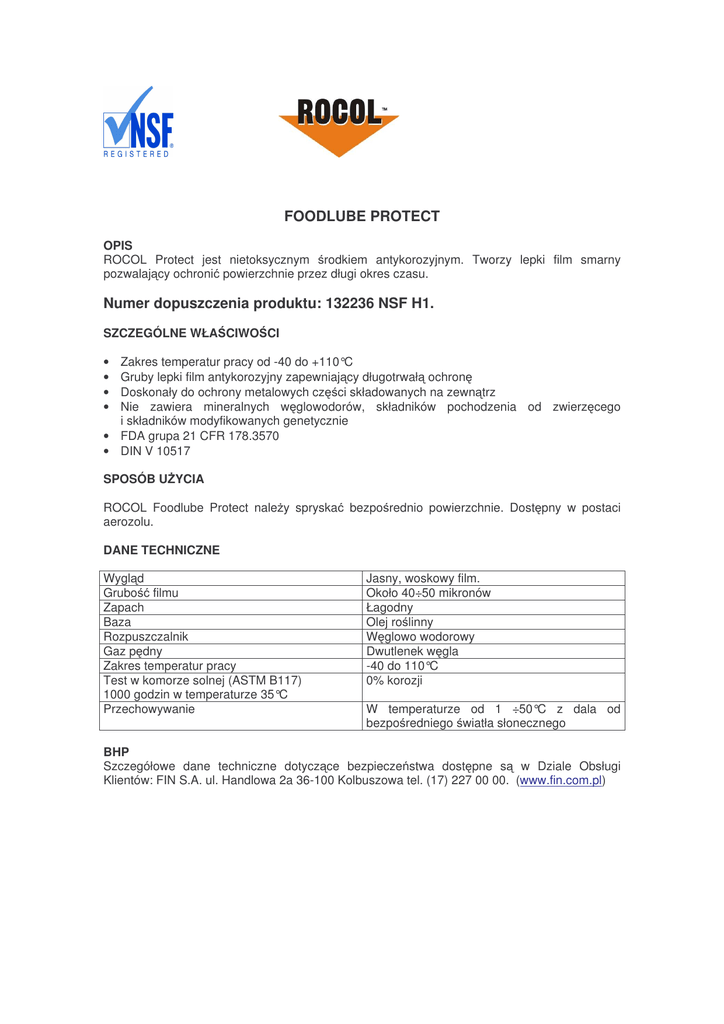 FOODLUBE PROTECT OPIS ROCOL Protect jest nietoksycznym rodkiem antykorozyjnym. Tworzy lepki film smarny pozwalaj cy ochroni powierzchnie przez długi okres czasu. Numer dopuszczenia produktu: 132236 NSF H1. SZCZEGÓLNE WŁA CIWO CI • • • • Zakres temperatur pracy od -40 do +110°C Gruby lepki film antykorozyjny zapewniaj cy długotrwał ochron Doskonały do ochrony metalowych cz ci składowanych na zewn trz Nie zawiera mineralnych w glowodorów, składników pochodzenia od zwierz cego i składników modyfikowanych genetycznie • FDA grupa 21 CFR 178.3570 • DIN V 10517 SPOSÓB U YCIA ROCOL Foodlube Protect nale y spryska bezpo rednio powierzchnie. Dost pny w postaci aerozolu. DANE TECHNICZNE Wygl d Grubo filmu Zapach Baza Rozpuszczalnik Gaz p dny Zakres temperatur pracy Test w komorze solnej (ASTM B117) 1000 godzin w temperaturze 35°C Przechowywanie Jasny, woskowy film. Około 40÷50 mikronów Łagodny Olej ro linny W glowo wodorowy Dwutlenek w gla -40 do 110°C 0% korozji W temperaturze od 1 ÷50°C z dala od bezpo redniego wiatła słonecznego BHP Szczegółowe dane techniczne dotycz ce bezpiecze stwa dost pne s w Dziale Obsługi Klientów: FIN S.A. ul. Handlowa 2a 36-100 Kolbuszowa tel. (17) 227 00 00. (www.fin.com.pl)