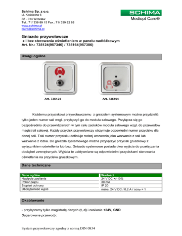 Schima Sp. z o.o. ul. Kościelna 6 Mediopt Care® 52 - 314 Wrocław Tel.: 71/ 339 89 15 Fax.: 71/ 339 82 88 www.schima.pl [email protected] Gniazdo przywoławcze z i bez sterowania oświetleniem w panelu nadłóżkowym Art. Nr.: 735124(957346) / 735164(957386) Uwagi ogólne Art. 735124 Art. 735164 Każdemu przyciskowi przywoławczemu z gniazdem systemowym można przydzielić tylko jeden numer sali wzgl. przyłączyć go do modułu salowego. Przyłącza się go bezpośrednio do przewidzianych w tym celu zacisków modułu salowego wzgl. do przewodów magistrali salowej. Każdy przycisk przywoławczy otrzymuje odpowiedni numer przycisku dla danej sali. Taki numer przycisku definiuje rodzaj wezwania jako wezwanie z sali lub wezwanie z łóżka. Do gniazda systemowego można przyłączyć przycisk gruszkowy z wyłącznikiem oświetlenia lub bez. Gniazdo systemowe posiada dwa wyjścia do przełączania obciążeń zewnętrznych. Wyjścia te uaktywniane są odpowiednimi przyciskami sterowania oświetlenia na przycisku gruszkowym. Dane techniczne Dane ogólne Napięcie zasilania Pobór prądu Stopień ochrony Obciążalność wyjść Wartości 24 V DC +/-10% 30 mA IP 20 maks. 24 V DC / 0,2 A / cosϕ = 1 Okablowanie - przyłączamy tylko magistralę danych (t, d) i zasilanie +24V, GND Sugerowane przewody: System przywoławczy zgodny z normą DIN 0834 Mediopt Care® - YTKSY 3x2x0,5mm ( 2 wolne) Sterowanie oświetleniem w panelach nadłóżkowych • podłączenie gniazda 735124 do przekaźników Art. 5900 – Elektroniczny przekaźnik z wbudowanym zasilaczem System przywoławczy zgodny z normą DIN 0834 2 Mediopt Care® • podłączenie gniazda 735124 do przekaźników sterowanych mikroprocesorem zasilanych napięciem systemu przywoławczego Tabela adresowa Adres 0 1 2 3 4 5 6 7 8 9 A B C D E F Funkcja Wezwanie z łóżka 1-1 Wezwanie z łóżka 2-1 Wezwanie z łóżka 3-1 Wezwanie z łóżka 4-1 Wezwanie z łóżka 5-1 Wezwanie z łóżka 6-1 Wezwanie 2 z sali Wezwanie 3 z sali Wezwanie 4 z sali Wezwanie z łóżka 1-2 Wezwanie z łóżka 2-2 Wezwanie z łóżka 3-2 Wezwanie z łóżka 4-2 Wezwanie z łóżka 5-2 Wezwanie z łóżka 6-2 Przyciski nie wymagają programowania, a jedynie ustawienia przełącznika adresów. Jeśli wezwanie ma być wskazywane np. jako wezwanie z łóżka 1, to należy przełącznik adresów ustawić na adres „1” i nie zmieniać go więcej. Na aktualny adres przełącznika adresów wskazuje strzałka, nadrukowana na metalowej płytce. Nie wolno ustawiać takiego samego adresu na kilku przyciskach, tzn. adres „Wezwanie 2 z sali” można w sali przydzielić tylko raz. Dotyczy to także innych przypadków. Nieprzestrzeganie powyższego powoduje wadliwe działanie. System przywoławczy zgodny z normą DIN 0834 3 Mediopt Care® Manipulatory • Typ: 733480 + gniazdo 735164( bez przycisku) lub 735124 (z przyciskiem) • Typ: 733490 + gniazdo 735124 (z przyciskiem) • Typ: 733500 + gniazdo 735124 (z przyciskiem) Uwaga! Manipulatory z funkcją sterowania oświetleniem dołączane są tylko do gniazd 735124 System przywoławczy zgodny z normą DIN 0834 4