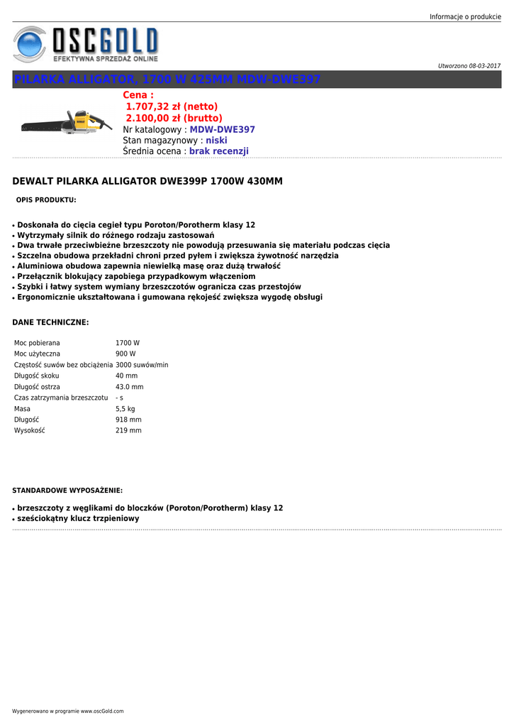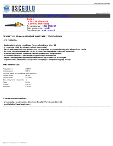 Informacje o produkcie Utworzono 08-03-2017 PILARKA ALLIGATOR, 1700 W 425MM MDW-DWE397 Cena : 1.707,32 zł (netto) 2.100,00 zł (brutto) Nr katalogowy : MDW-DWE397 Stan magazynowy : niski Średnia ocena : brak recenzji DEWALT PILARKA ALLIGATOR DWE399P 1700W 430MM OPIS PRODUKTU: ● ● ● ● ● ● ● ● Doskonała do cięcia cegieł typu Poroton/Porotherm klasy 12 Wytrzymały silnik do różnego rodzaju zastosowań Dwa trwałe przeciwbieżne brzeszczoty nie powodują przesuwania się materiału podczas cięcia Szczelna obudowa przekładni chroni przed pyłem i zwiększa żywotność narzędzia Aluminiowa obudowa zapewnia niewielką masę oraz dużą trwałość Przełącznik blokujący zapobiega przypadkowym włączeniom Szybki i łatwy system wymiany brzeszczotów ogranicza czas przestojów Ergonomicznie ukształtowana i gumowana rękojeść zwiększa wygodę obsługi DANE TECHNICZNE: Moc pobierana 1700 W Moc użyteczna 900 W Częstość suwów bez obciążenia 3000 suwów/min Długość skoku 40 mm Długość ostrza 43.0 mm Czas zatrzymania brzeszczotu -s Masa 5,5 kg Długość 918 mm Wysokość 219 mm STANDARDOWE WYPOSAŻENIE: ● ● brzeszczoty z węglikami do bloczków (Poroton/Porotherm) klasy 12 sześciokątny klucz trzpieniowy Wygenerowano w programie www.oscGold.com