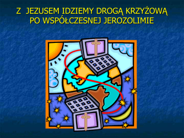 Z JEZUSEM IDZIEMY DROGĄ KRZYŻOWĄ PO WSPÓŁCZESNEJ JEROZOLIMIE Droga Krzyżowa jest nabożeństwem upamiętniającym ostatnią drogę Jezusa Chrystusa: z pretorium Piłata na Golgotę, oraz ukrzyżowanie, śmierć i złożenie do grobu. Polega na rozważeniu męki Pańskiej i jest połączone z przejściem 14 stacji przypominających poszczególne jej etapy. Początki Drogi Krzyżowej sięgają czasów wczesnochrześcijańskich, kiedy czczono miejsca związane z męką Jezusa w Jerozolimie. Nabożeństwo rozpowszechnili franciszkanie, którzy opiekowali się jerozolimskimi miejscami św. Początkowo stacji było 7, 9, 12, 18. Od XVI w. nabożeństwo znane było w Polsce. W XVIII w. Droga Krzyżowa przybrała kształt znany obecnie. Pan Jezus na śmierć skazany 1 Z pielgrzymami ruszamy na Via Dolorosa czyli z łaciny dosłownie Drogę Cierpienia. Zwana jest również Via Crucis - Drogą Krzyżową. Jezus bierze krzyż na swe ramiona 2 Stacja jest umieszczona na bocznej ścianie klasztoru. Jezus upada pierwszy raz 3 Mała kapliczka przy tej stacji była odnowiona przez polskich żołnierzy. Jezus spotyka swoją Matkę 4 Stacja znajduje się przy zwykłej ulicy. Na zdjęciu widać kobietę arabską w charakterystycznej chustce. Szymon pomaga Jezusowi dźwigać krzyż 5 Stacja znajduje się przy drodze prowadzącej na miejski bazar. Wewnątrz – maleńka kapliczka. Weronika ociera twarz Jezusowi 6 Poniszczone arabskimi napisami ściany u wejścia do kaplicy. Jezus upada drugi raz 7 Ta stacja znajduje się przy rynku oliwnym. Jezus pociesza płaczące niewiasty 8 Tę stację upamiętnia jedynie kamień w murze. Napis w języku greckim: „Jezus Chrystus zdobywa” Jezus upada trzeci raz 9 Chociaż z tej stacji widać wspaniały klasztor, to jednak znajduje się ona przy bardzo ruchliwej uliczce. Nie jest tam łatwo o chwilę modlitwy. Jezus obdarty z szat 10 Od tej stacji Droga Krzyżowa znajduje się w Bazylice Grobu Świętego. Jezus przybity do krzyża 11 Stacja znajduje się przy bocznym ołtarzu. Nad nim mozaika upamiętniająca wydarzenie. Jezus umiera na krzyżu 12 Pod ołtarzem można zobaczyć pękniętą skałę Golgoty, która powstała w momencie śmierci Chrystusa. Jezus zdjęty z krzyża 13 Na tym kamieniu złożono ciało Chrystusa, kiedy zdjęto je z krzyża. Jezus złożony do grobu 14 Tak wygląda kaplica grobu Jezusa. W marmurowej płycie są fragmenty kamienia, który zamykał wejście do grobu.